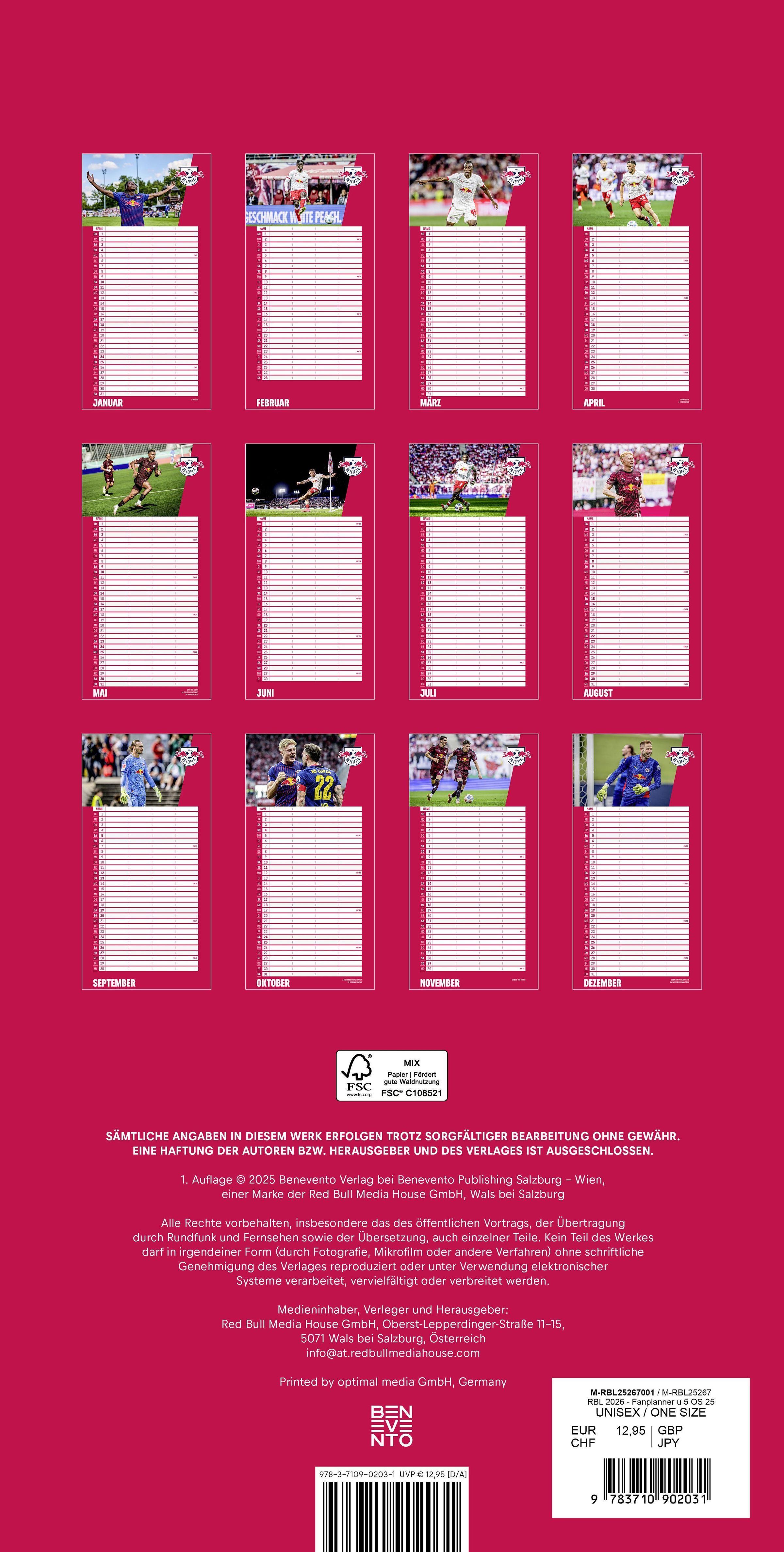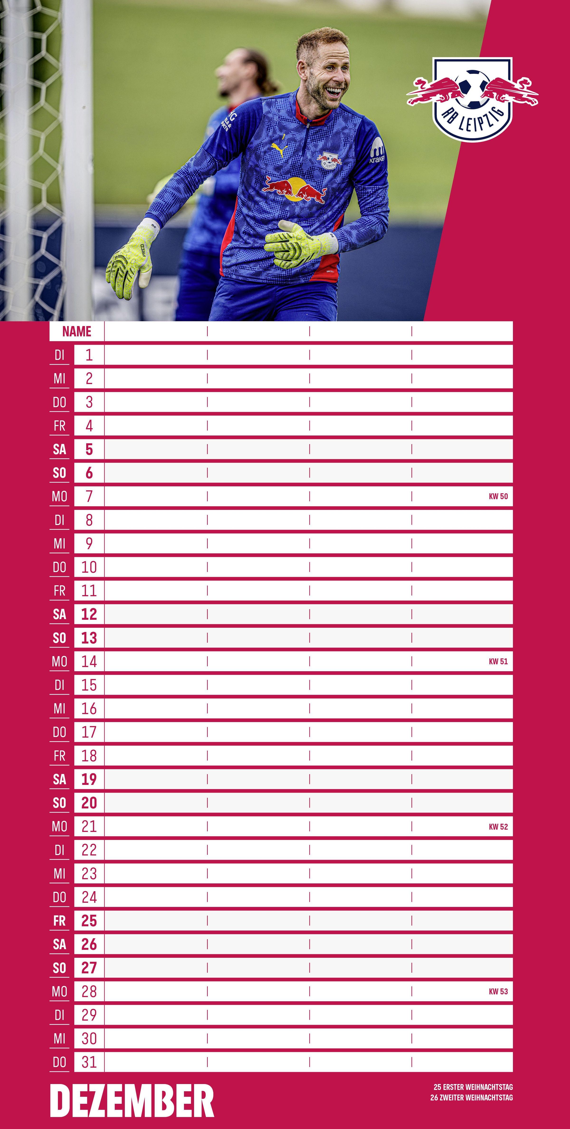 Der RB Leipzig Fanplaner überzeugt jedes Monat aufs Neue mit emotionsreichen Fotografien von spannenden und erfolgreichen Szenen deiner Stars. Die vier Spalten geben Platz, individuelle Termine der einzelnen Familienmitglieder einzutragen und so organisiert in ein neues Fußball-Jahr zu starten.