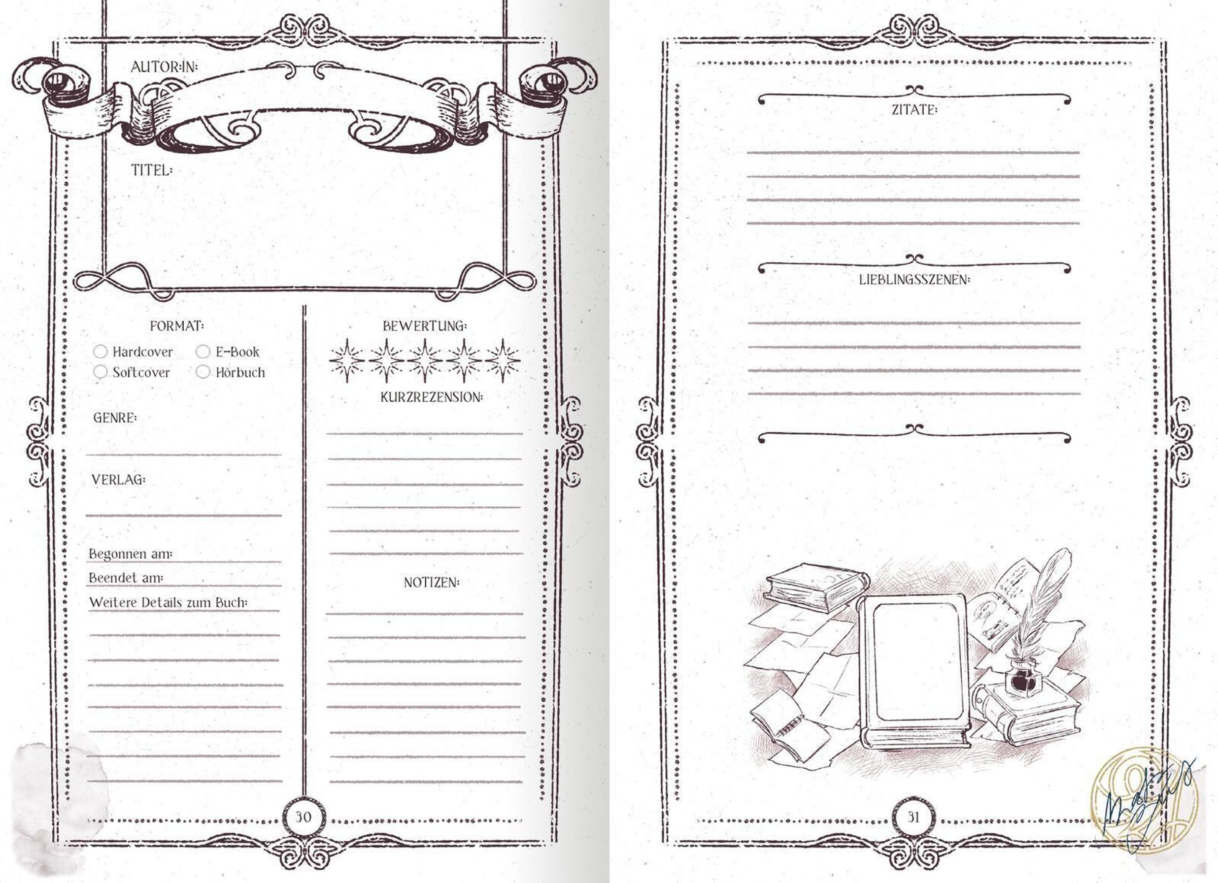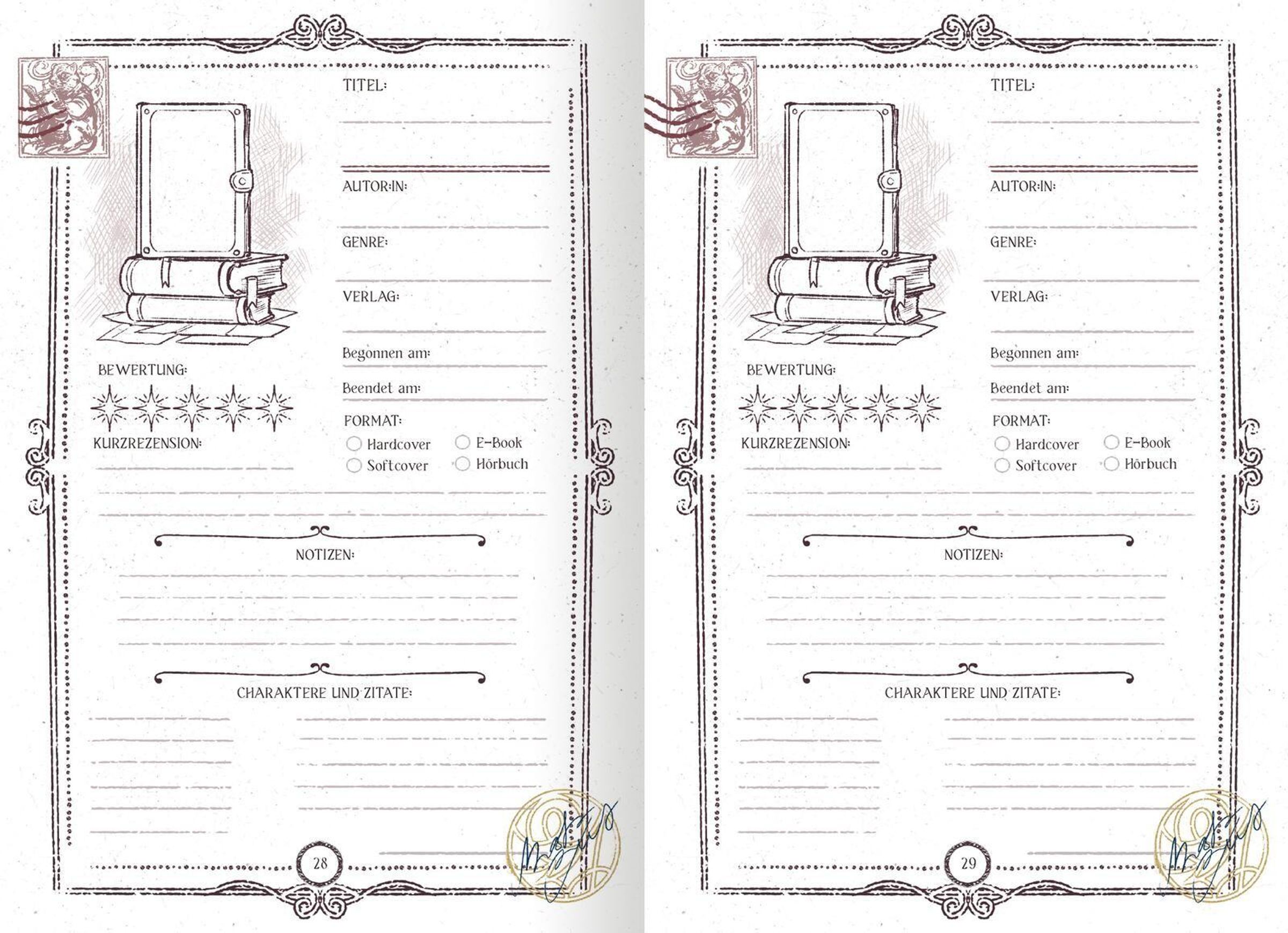 - Individuelle Buchreviews: Auf je einer Seite oder Doppelseite kannst du deine Bücher detailliert rezensieren und deine Gedanken notieren