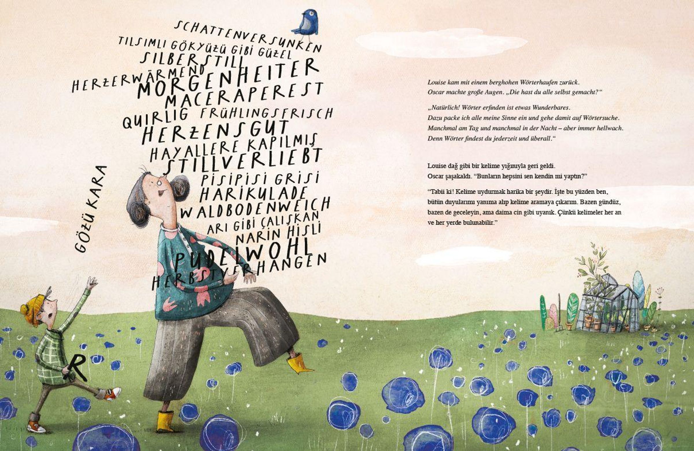 Oscar entdeckt eine geheimnisvolle Schatztruhe. Voller Erwartungen öffnet er sie - doch anstelle von Gold und Juwelen findet er nur alte Wörter. Enttäuscht schleudert er ein Wort ins Gebüsch. Plötzlich huscht etwas an ihm vorbei! Da begreift Oscar: Die Wörter in der Kiste haben eine besondere Kraft. Begeistert probiert er sie aus - bis die Truhe leer ist und ihm kein einziges Wort mehr bleibt. Glücklicherweise trifft er Louise, eine Meisterin der Sprache. Sie zeigt ihm, wie er selbst neue Wörter erschaffen kann und warum er sorgsam mit ihnen umgehen sollte. Die Hörversion der Geschichte wurde von Muttersprachlern gelesen und ist als kostenloser MP3-Download (mit Zugangscode im Buch) verfügbar. Das Buch ist in weiteren Sprachfassungen - immer in Kombination mit Deutsch - erhältlich.