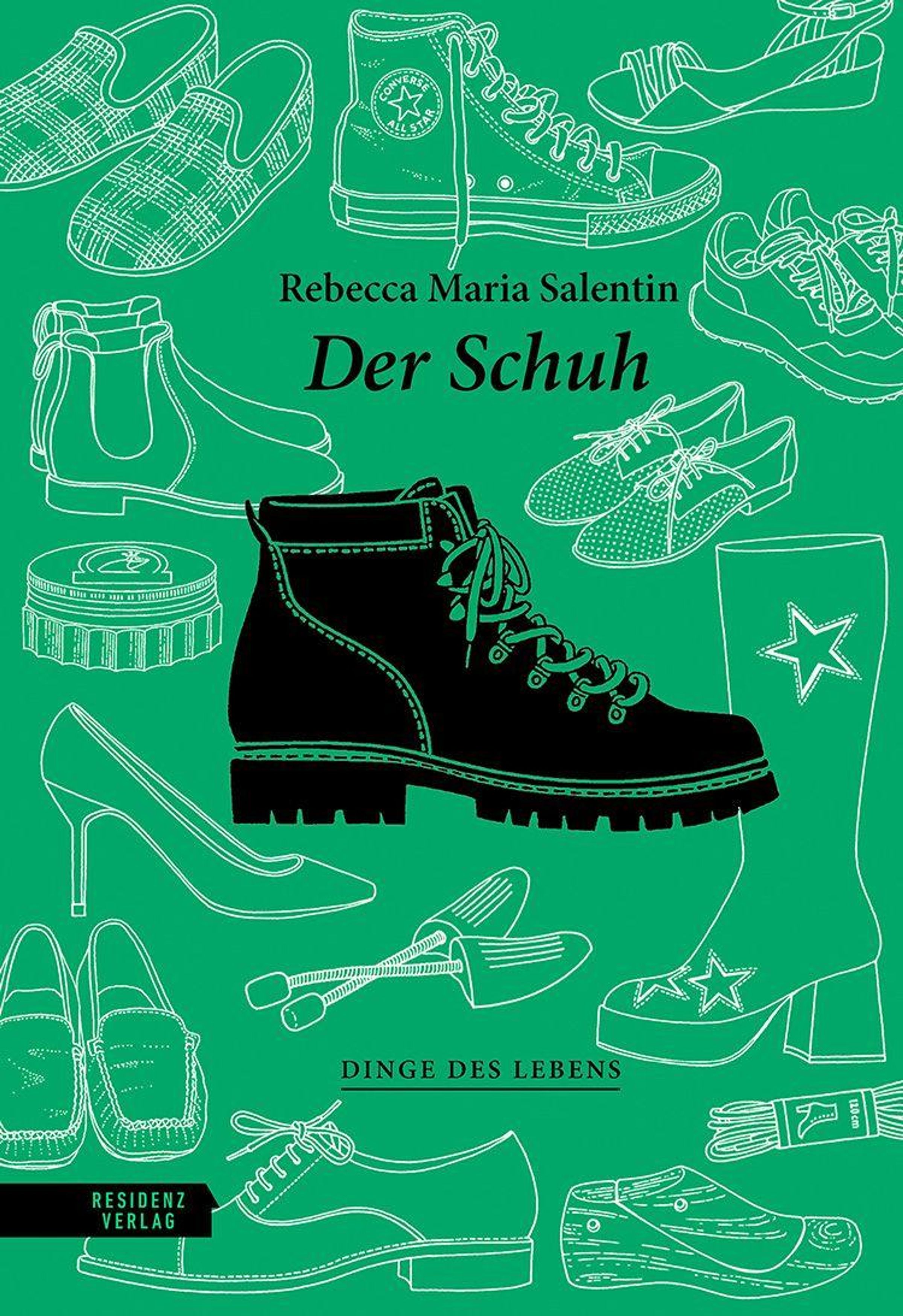 „Rebecca Maria Salentin, Der Schuh, DINGE DES LEBENS“. Illustrationen von verschiedenen Schuharten auf grünem Hintergrund., Buch