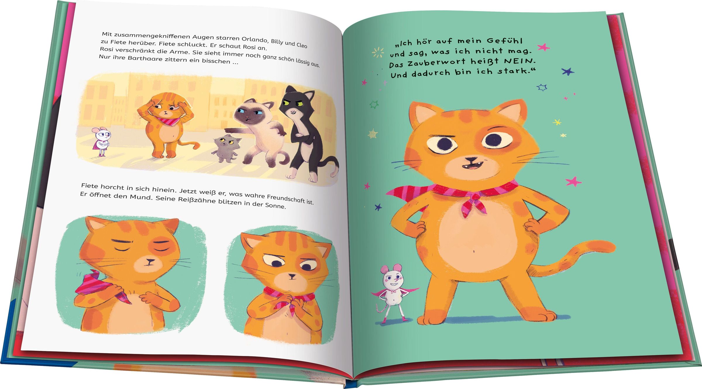 Kater Fiete möchte den anderen Katzen gefallen, ihnen helfen, dazugehören. Doch immer wieder bringt ihn das in unangenehme oder gefährliche Situationen. Die selbstbewusste Maus Rosi verrät ihm ein Zauberwort, das alles verändert: Nein. Es fällt Fiete zwar nicht immer leicht, das Zauberwort zu benutzen, aber von Rosi lernt er: Wenn dein Bauchgefühl dir sagt, dass sich etwas nicht gut anfühlt, darfst du Nein sagen - und das macht dich stark!