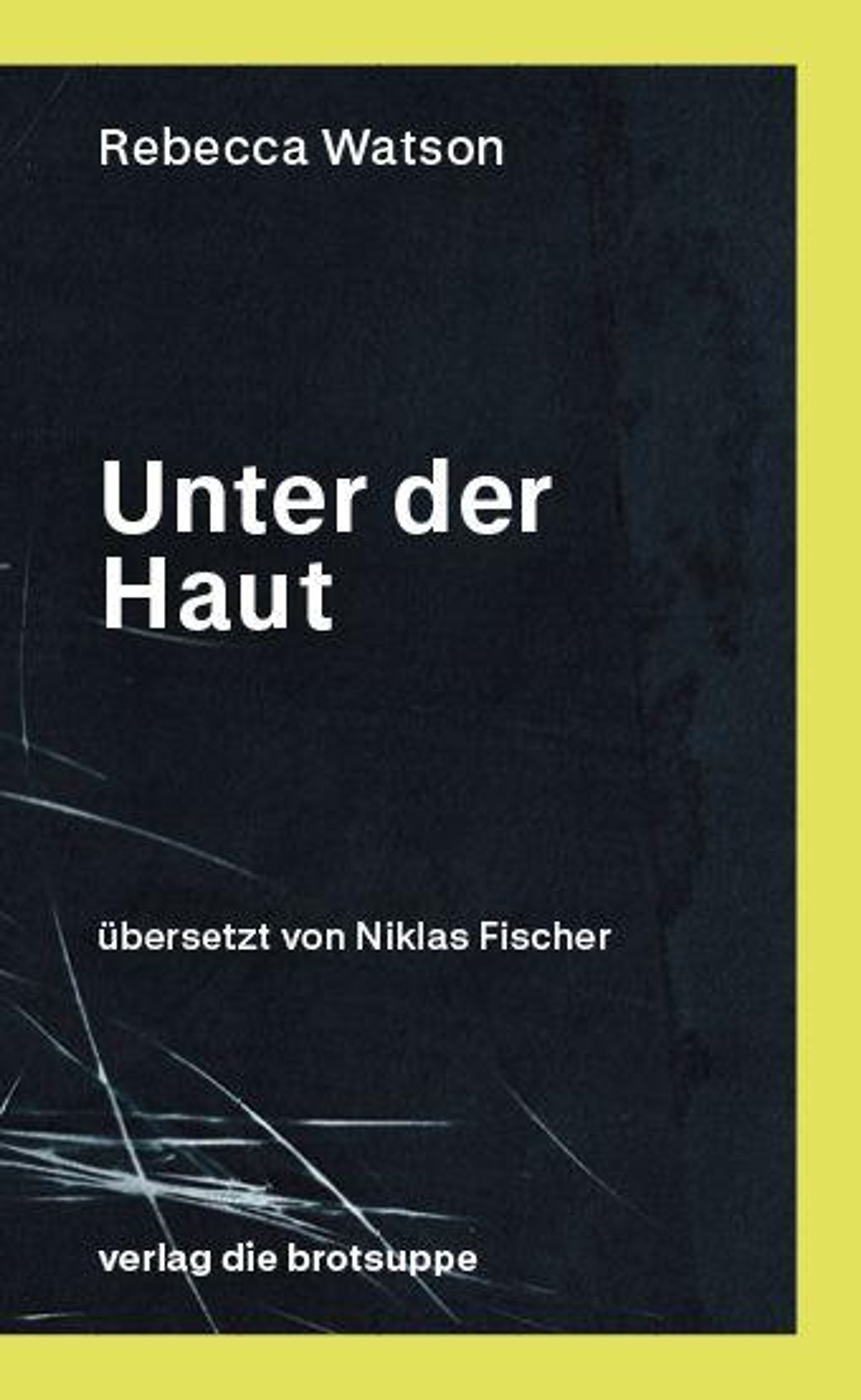 "Unter der Haut" von Rebecca Watson, übersetzt von Niklas Fischer, verlag die brotsuppe. Dunkler Hintergrund, gelber Rand., Buch