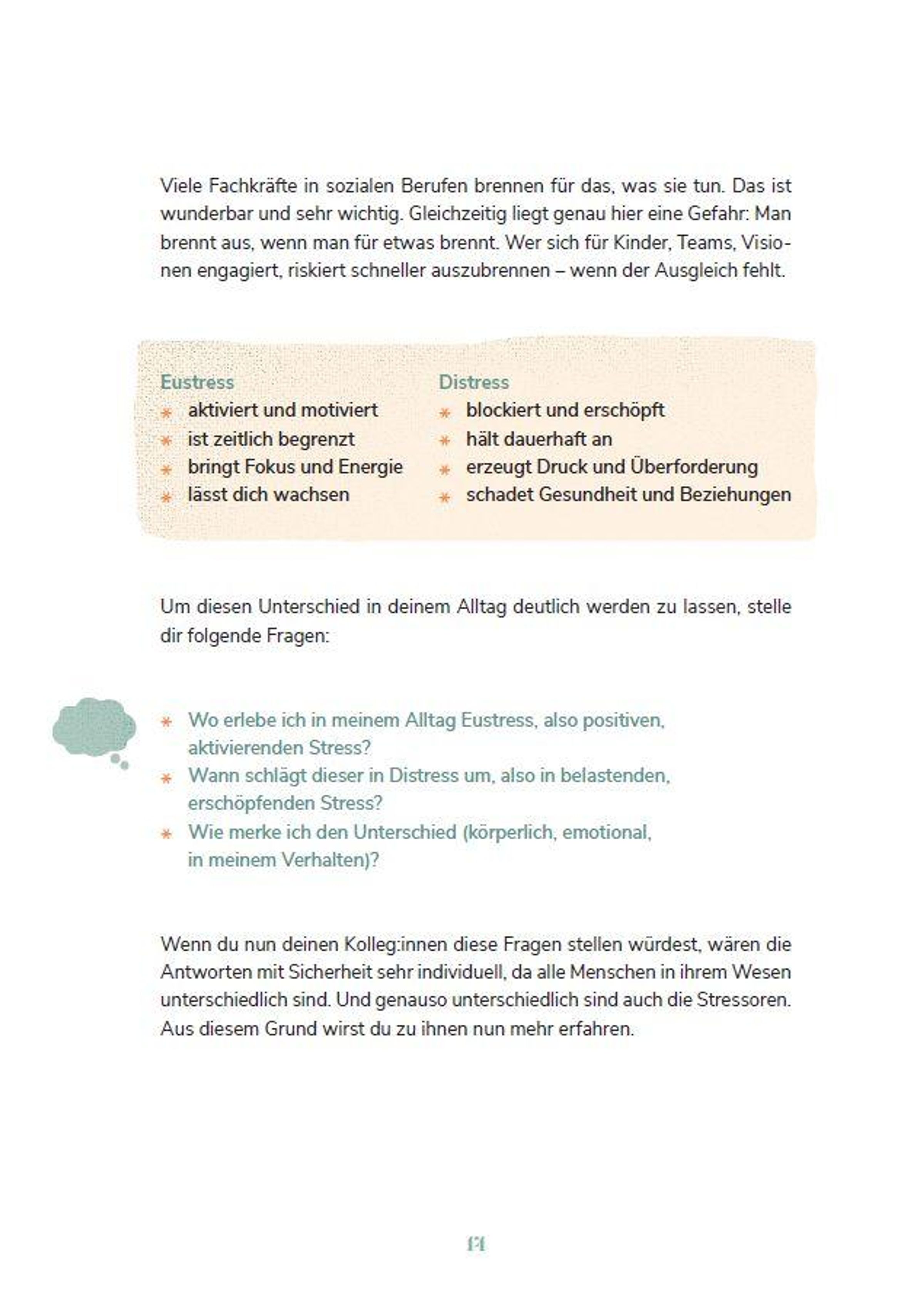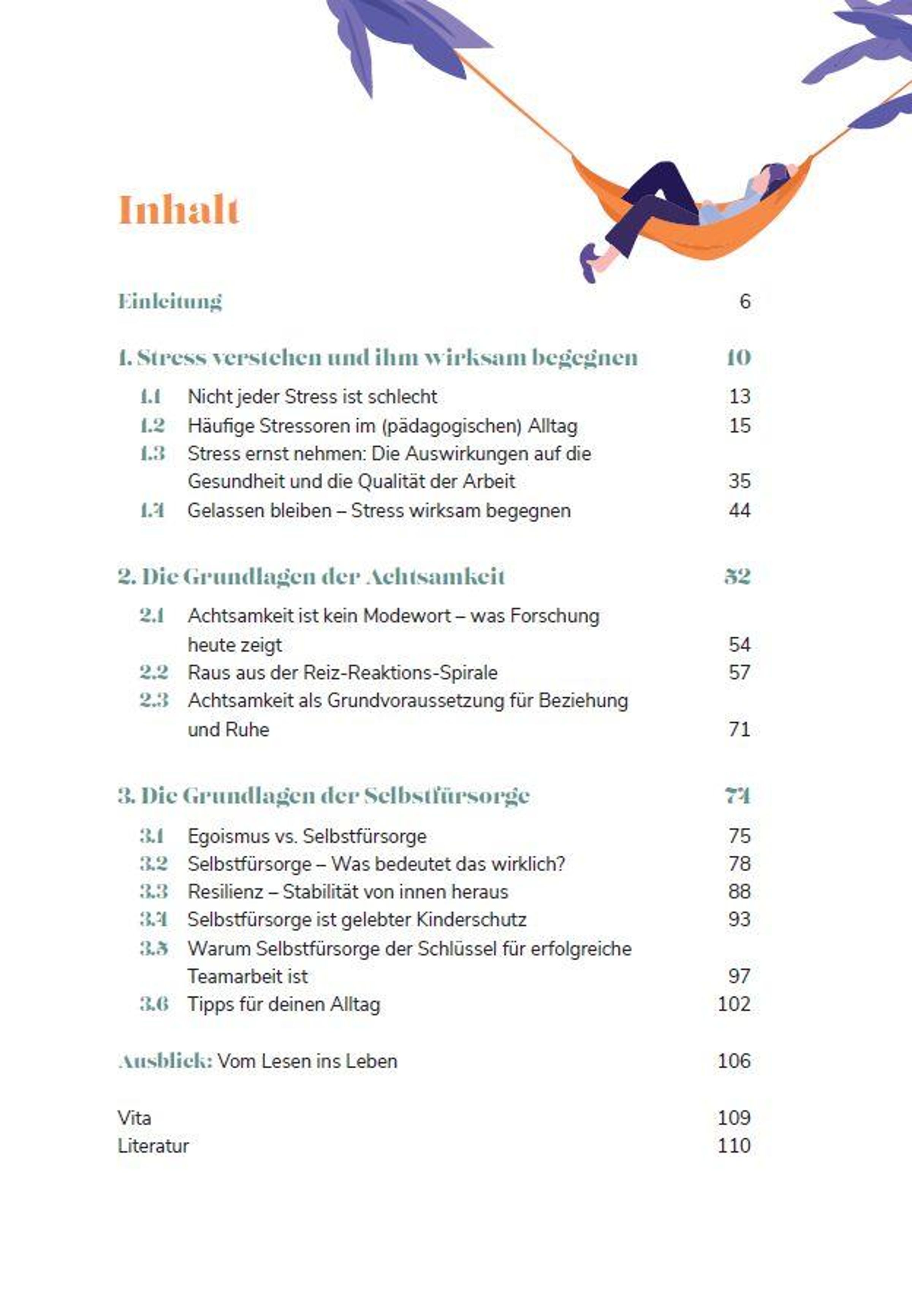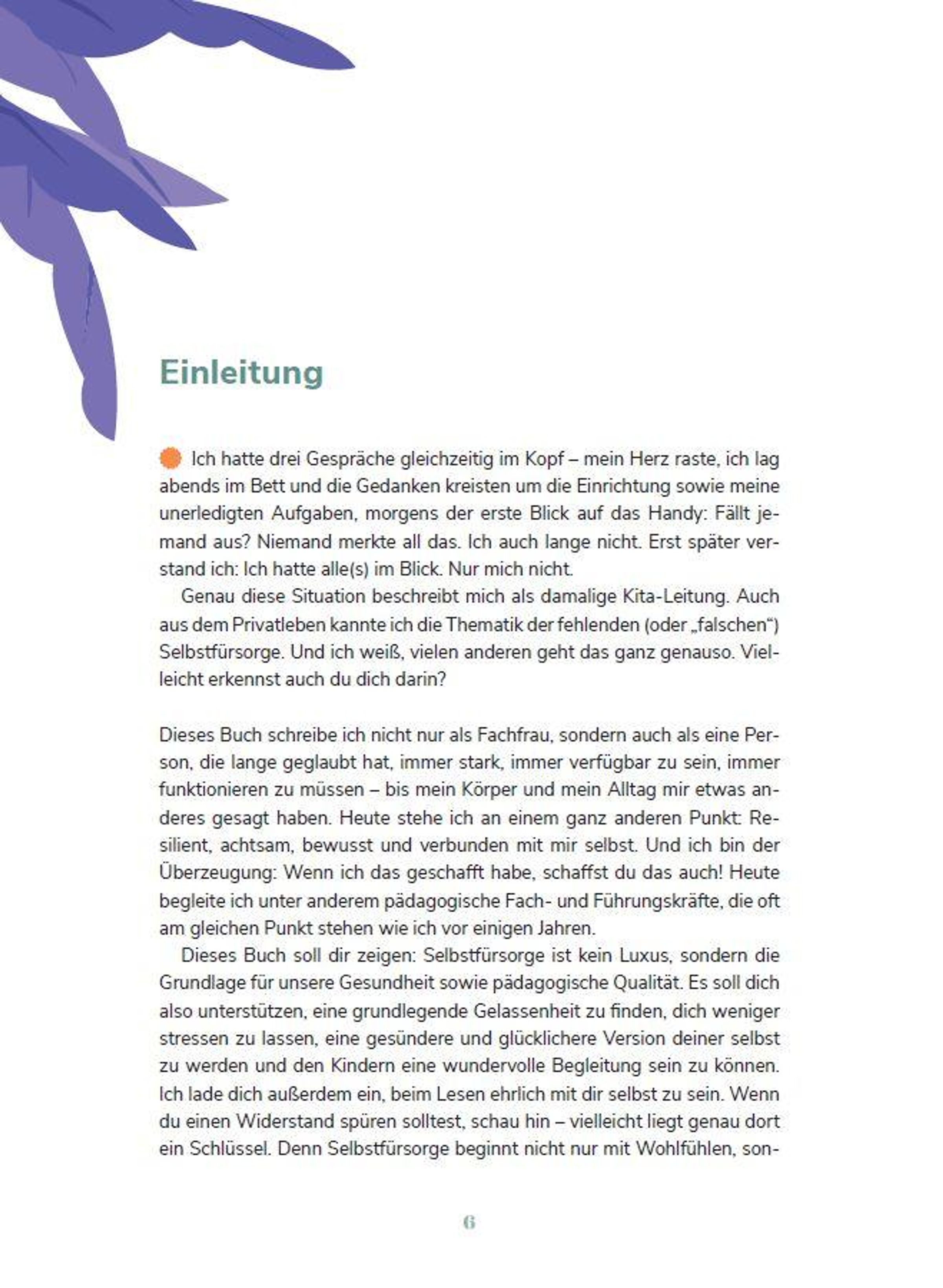 Selbstfürsorge ist kein Luxus, sondern die Grundlage für unsere Gesundheit und pädagogische Qualität. Dieses Buch unterstützt dich dabei, eine grundlegende Gelassenheit zu finden, dich weniger stressen zu lassen und so eine gesündere und glücklichere Version deiner selbst zu werden. Dies führt automatisch dazu, dass du den dir anvertrauten Kindern eine wundervolle Begleitung sein kannst. Du findest in diesem Buch die wichtigsten Grundlagen, Fragen zur Selbstreflexion sowie Methoden rund um das Thema Selbstfürsorge.