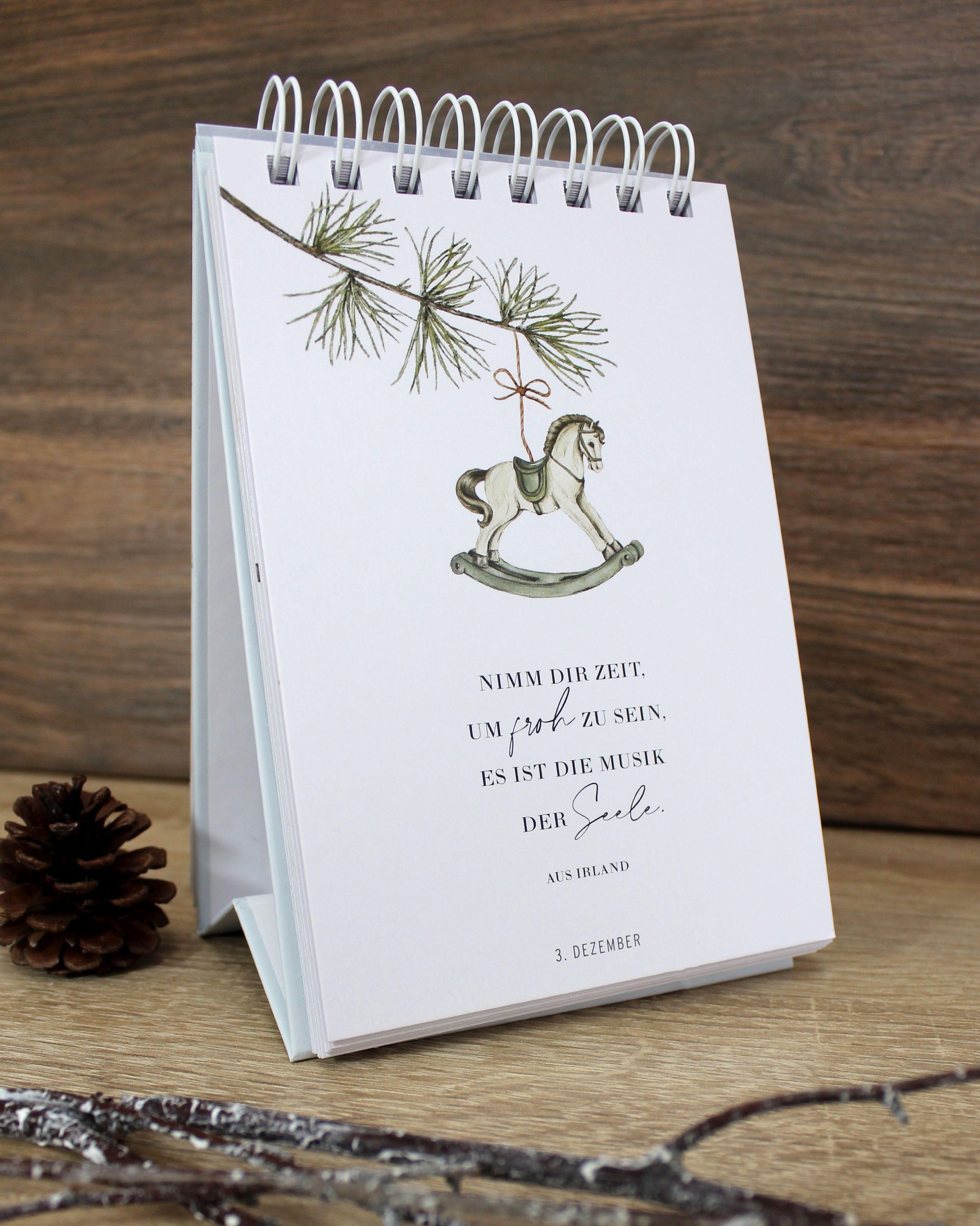 An diesem Adventskalender hat man mehrmals Freude. Die liebevoll gestalteten Seiten begleiten mit weihnachtlichen Gedanken und Bibelversen durch den Advent und sind ein dekorativer Blickfang. Aber es steckt noch mehr in diesem Aufsteller: Die Seiten lassen sich anschließend in Postkarten, Geschenkanhänger und Ornamente zum Dekorieren verwandeln. Einfach an den vorgezeichneten Linien auf der Rückseite der Blätter ausschneiden und Weihnachtsfreude weiterschenken. So entsteht aus einem Adventskalender ein ganzes Set an Weihnachts-Papeterie, das wunderbar aufeinander abgestimmt ist.