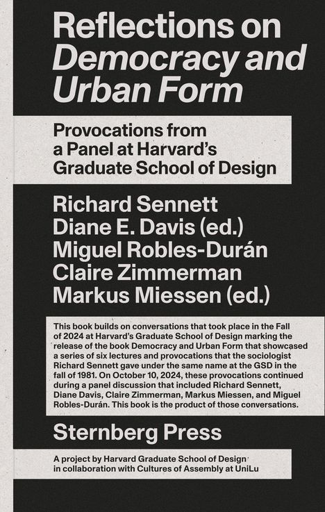 This book builds on conversations that took place in the fall of 2024 at Harvard's Graduate School of Design to mark the release of the book Democracy and Urban Form , co-published by Harvard Design Press and Sternberg Press. The original book presented a series of six eponymous lectures given by sociologist Richard Sennett at the GSD in 1981. Despite having been delivered in a very different political climate, his core insights into the connections between democracy and justice, matters of architecture and urban design, the growth of cities, cosmopolitanism, inclusion, free speech, and other related matters remain highly relevant today. To reflect on these urgencies, the GSD invited political philosopher Michael Sandel to address themes from the new edition of his book Democracy's Discontent . In his opening talk, Sandel encouraged the audience to consider what might account for the polarization that threatens democracy today, and what might be done about it. Following an analysis of the forces that were then about to decide the 2024 election, he proposes a bold project of civic renewal to reimagine the economy and empower citizens. The next day, these provocations informed a panel discussion that included Richard Sennett, Diane Davis, Claire Zimmerman, Markus Miessen, and Miguel Robles-Durán. As well as reflecting on Sandel's talk specifically, they also more generally consider the state of democracy relative to architecture and the design and planning of cities and metropolitan regions.