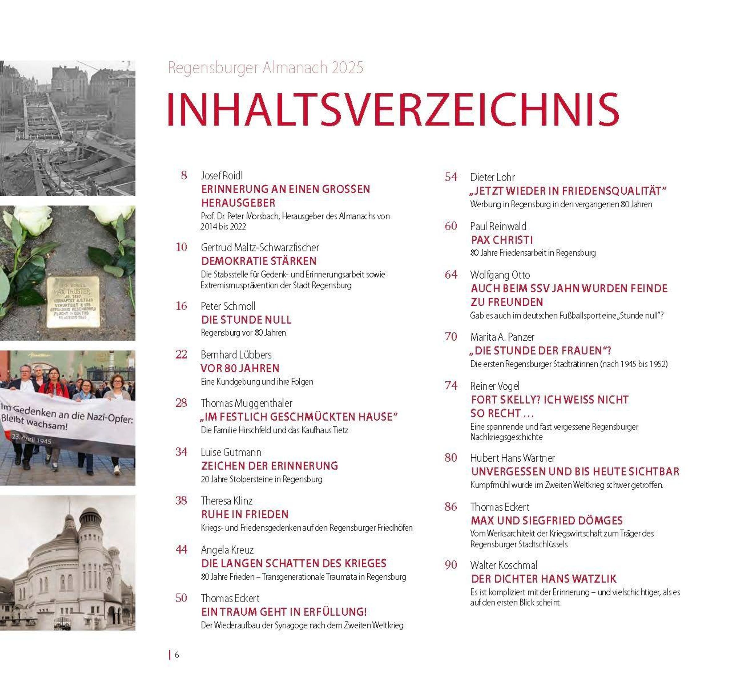 Frieden ist für die meisten von uns der Normalzustand. Wir kennen nichts anderes - was für ein Glück, was für ein Luxus! Doch die Welt verändert sich: Plötzlich ist Frieden keine Selbstverständlichkeit mehr. Gerade deshalb ist es wichtig, dass wir uns bewusst machen, wie Frieden funktioniert: indem wir uns erinnern, wie der Weg dorthin war, indem wir miteinander ins Gespräch kommen, indem wir für unsere demokratischen Werte einstehen - und indem wir Haltung zeigen. Was tut Regensburg, was tun einzelne Gruppen der Gesellschaft oder auch einzelne Menschen dafür, dass Frieden bleibt? Gibt oder gab es in der Stadt besondere Initiativen, Denkansätze oder auch noch unbekannte Geschichte(n)? Dieser Almanach widmet sich aus aktuellem Anlass dem Thema Frieden und der Erinnerungskultur - wie immer aus unterschiedlichen Perspektiven, mit vielfältigen Stimmen.