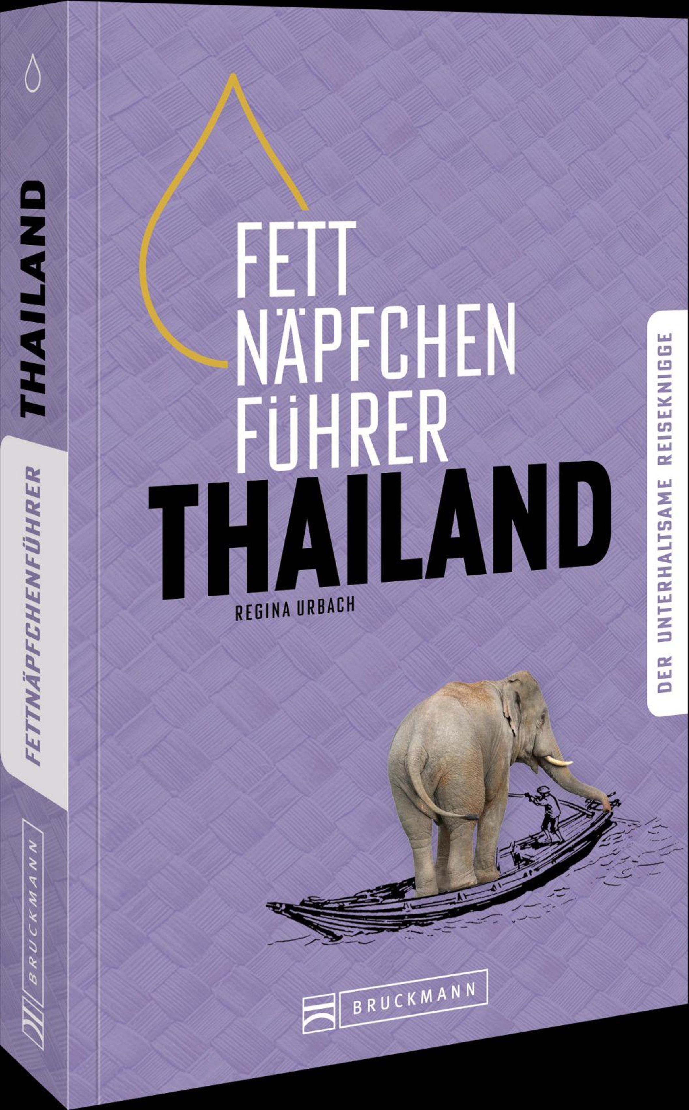 "Fettnäpfchenführer Thailand" in Weiß auf lila. Ein Elefant steht auf einem Boot., Buch
