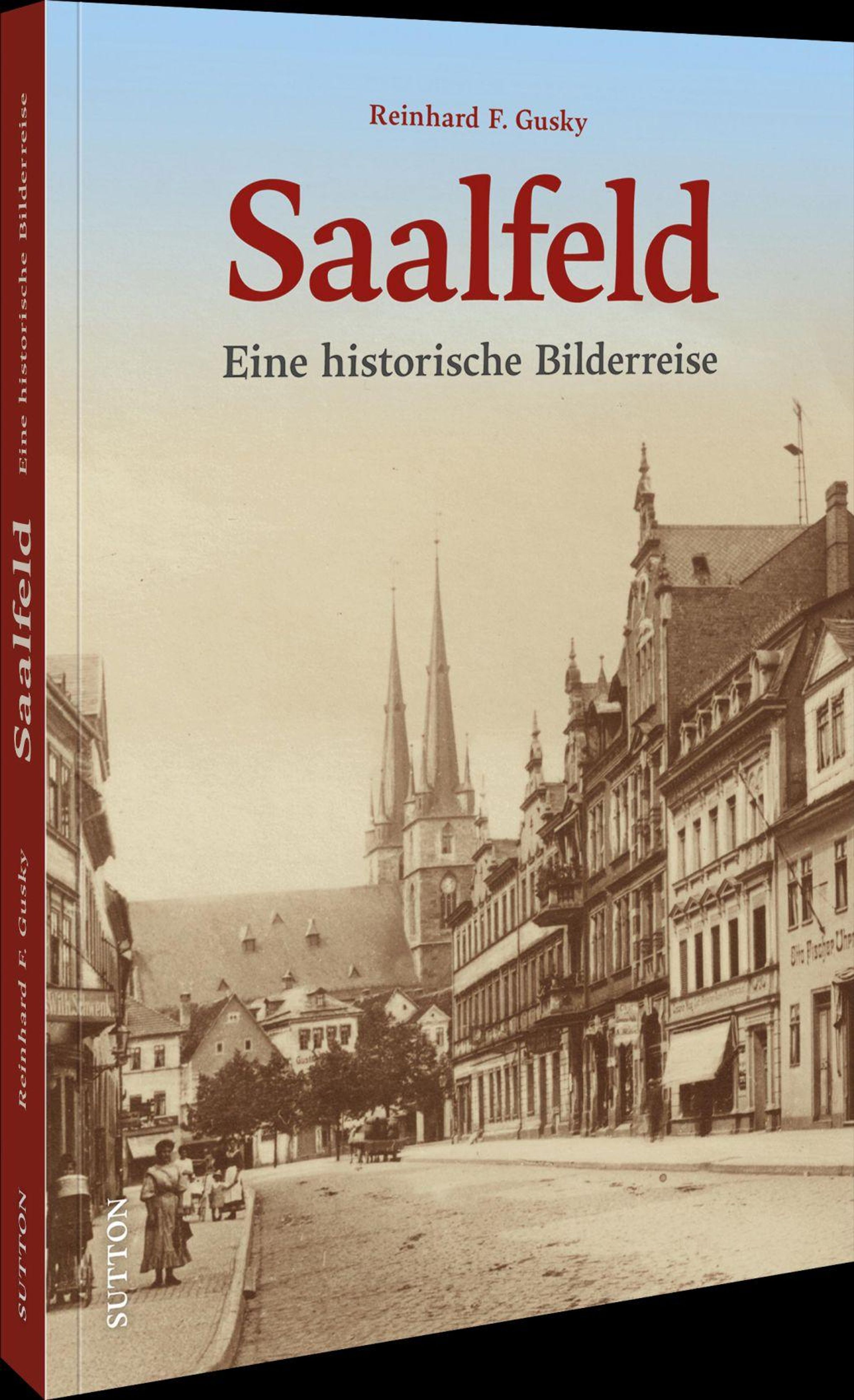 „Reinhard F. Gusky, Saalfeld, Eine historische Bilderreise“ steht über einer alten Stadtansicht mit Kirche und Fachwerkhäusern., Buch