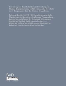 Das vorliegende Buch behandelt die Entstehung des Thomas-Evangeliums und enthält eine Angabe des Inhalts sowie den gesamten Text des Thomas-Evangeliums. Reinhard Nordsieck, (1937 - 2021) studierte evangelische Theologie an der Kirchlichen Hochschule Wuppertal und Rechtswissenschaften an der Universität Köln, danach langjährige Tätigkeit als Richter am Landgericht Wuppertal und Amtsgericht Mettmann, blieb auch im Ruhestand als Autor christlicher Bücher aktiv. Herausgeber: Hans-Jürgen Sträter, Adlerstein Verlag