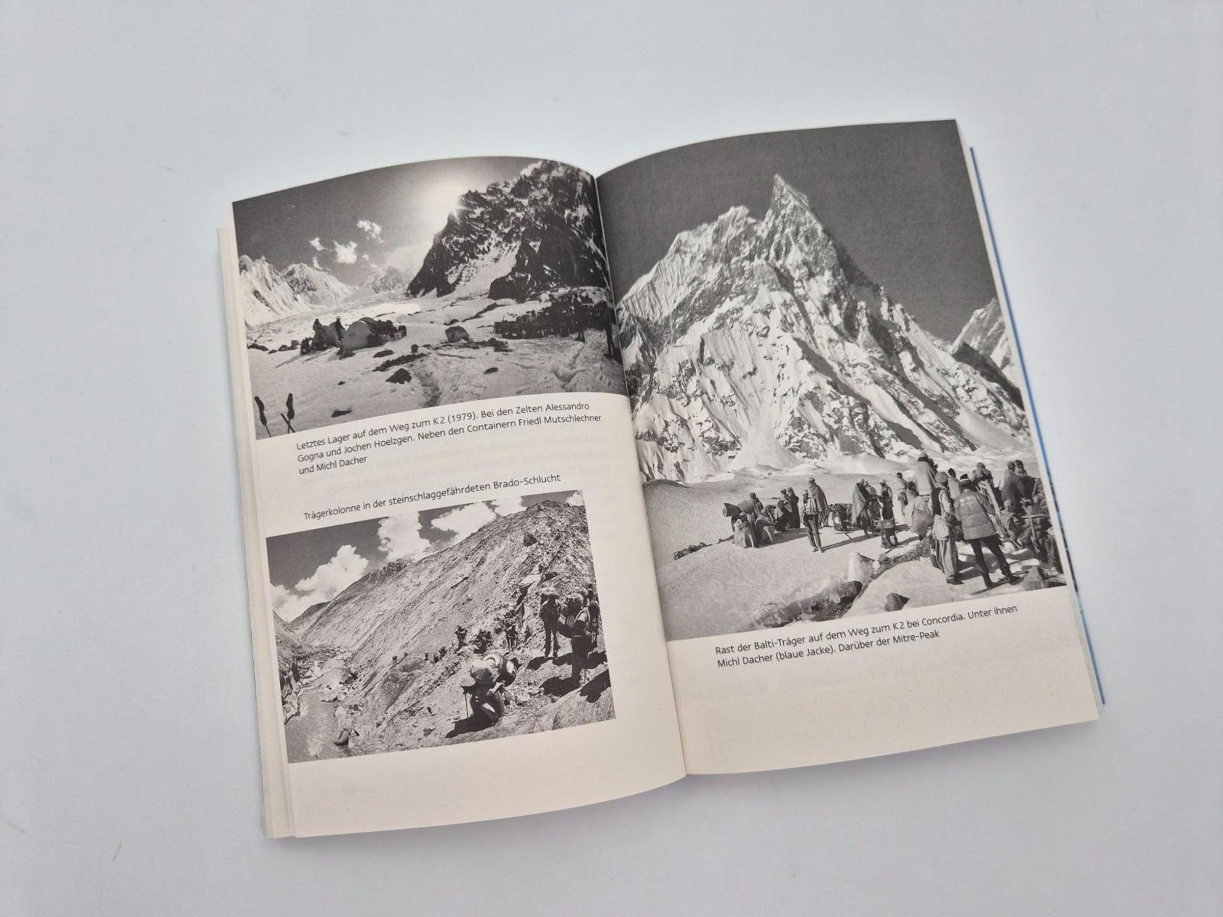 "Reinhold Messner: Überlebt - Meine 14 Achttausender", darunter zwei Bergsteiger in blauen Anzügen auf Schnee., Buch
