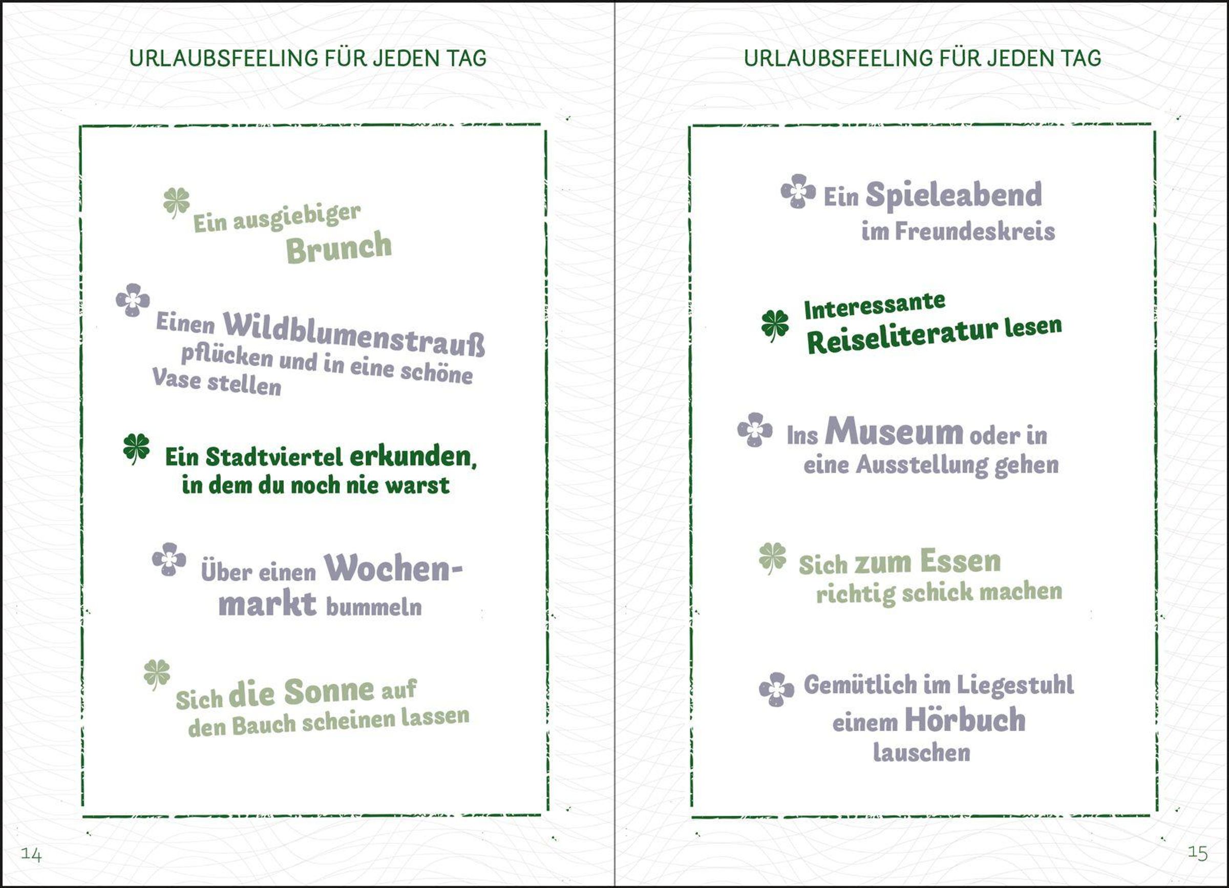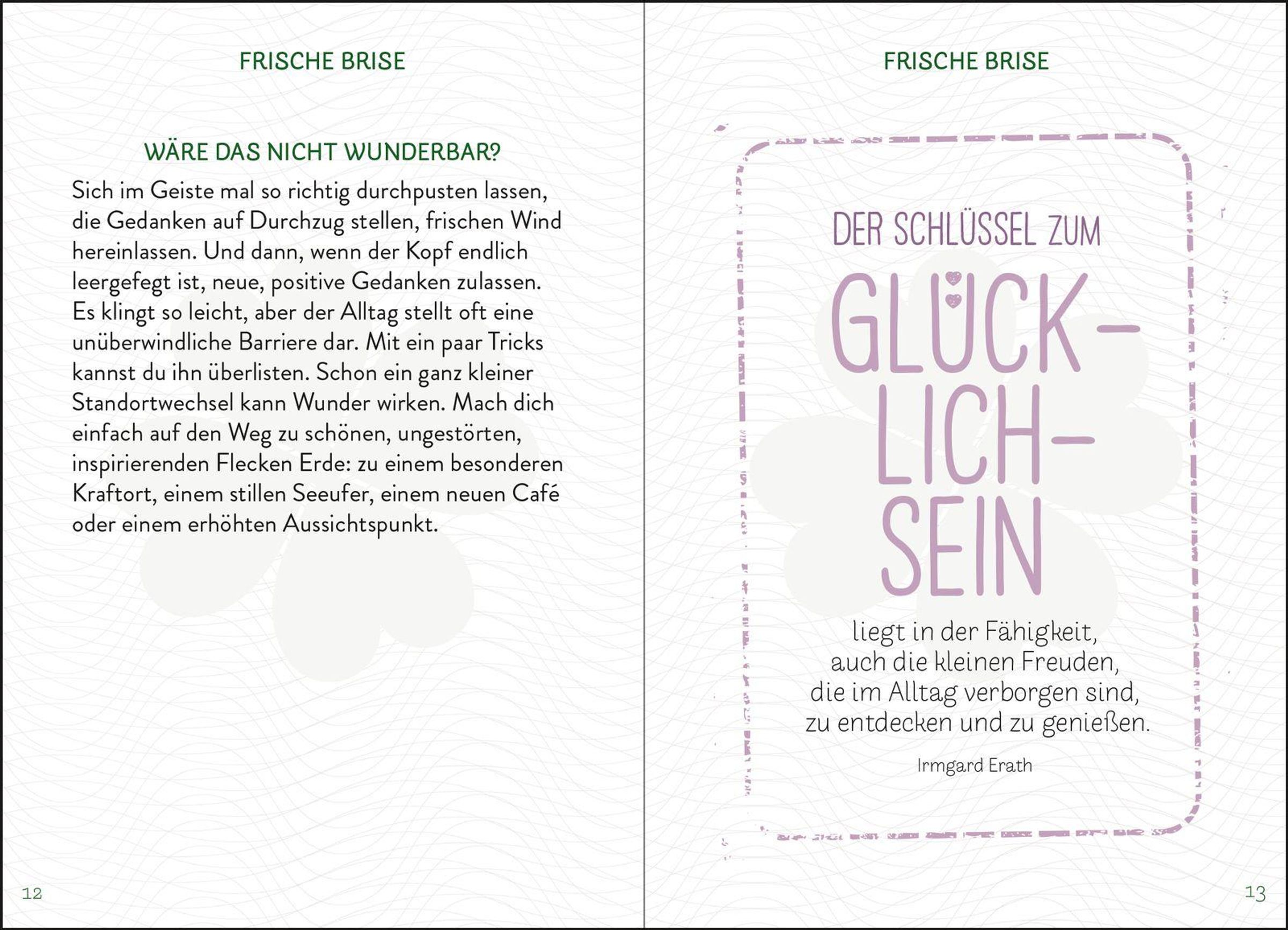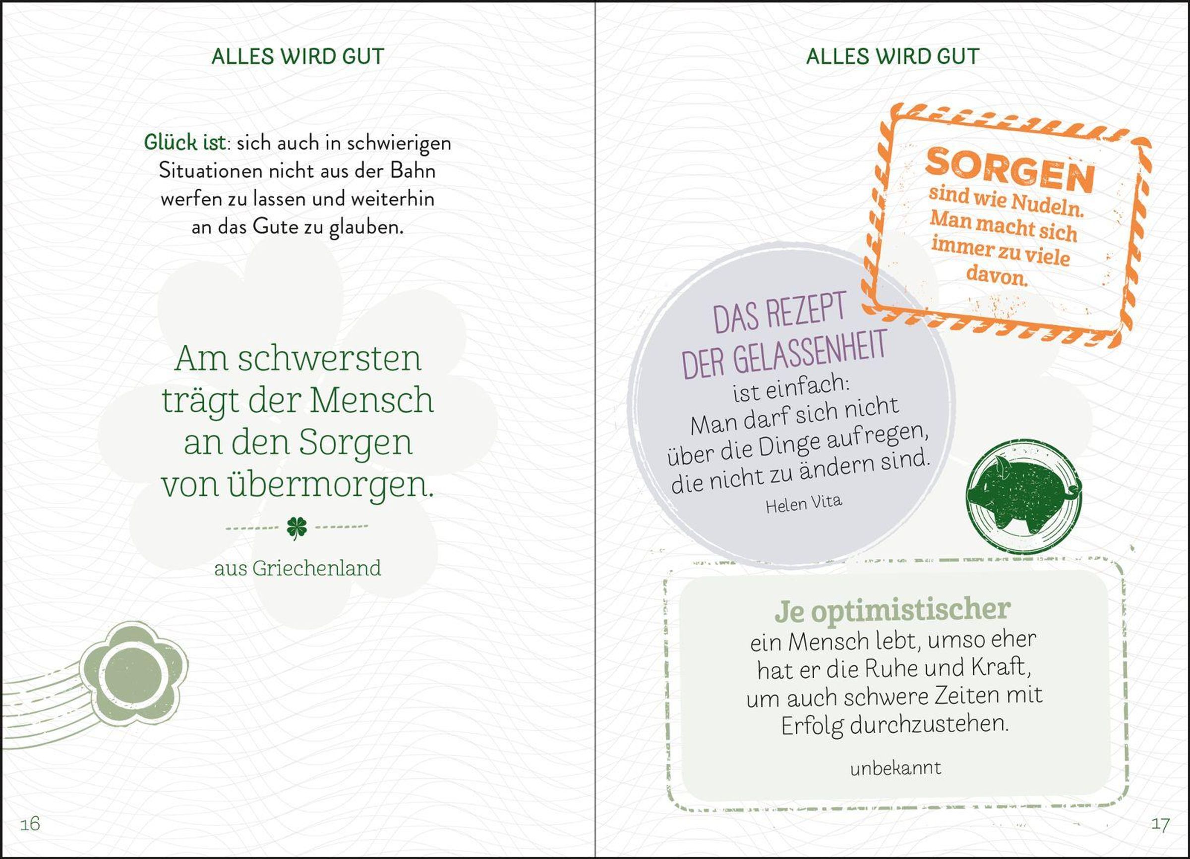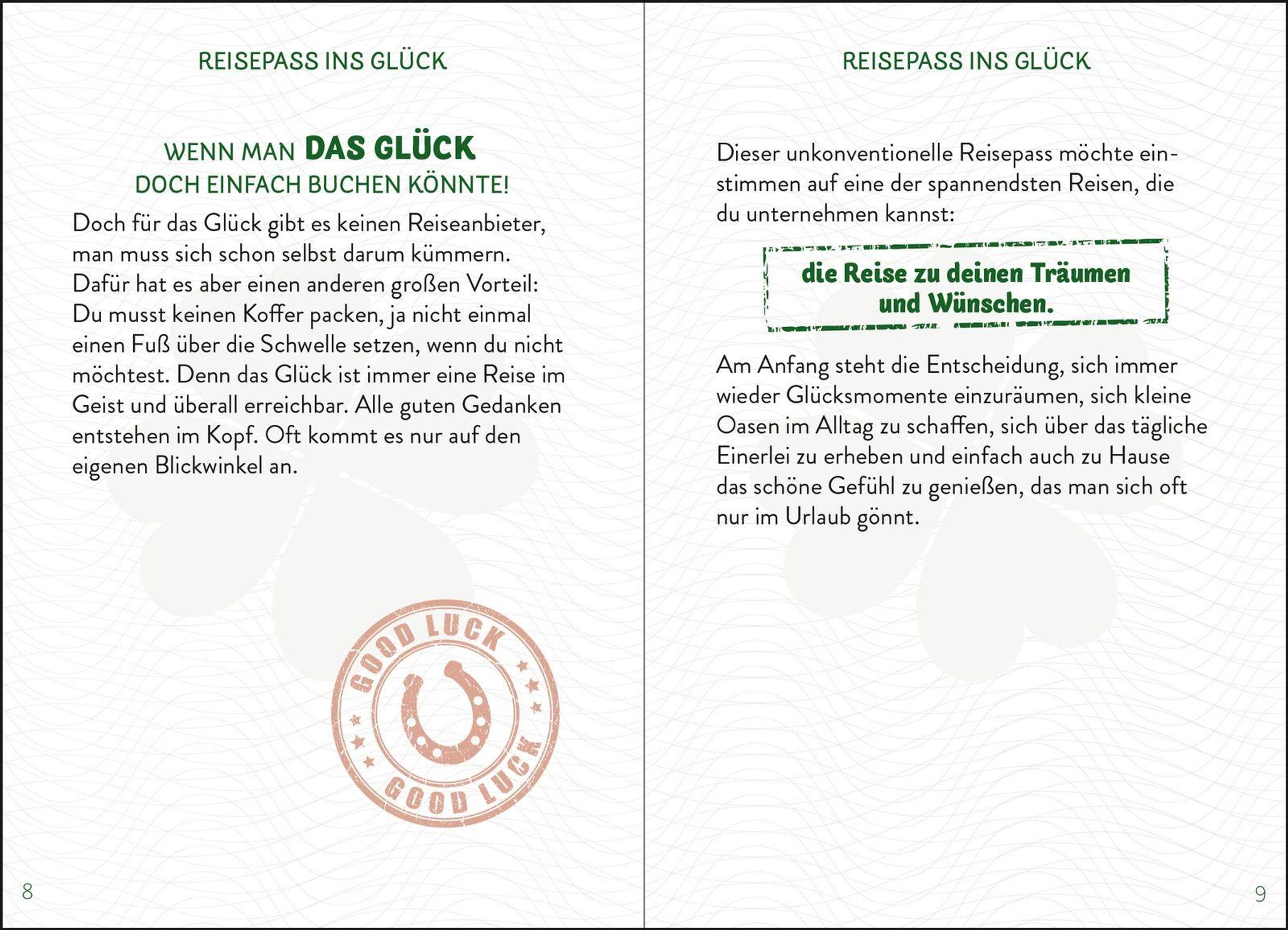 Kurze Texte und passende Zitate sorgen für Motivation und gute Laune. Die grafische Gestaltung mit verschiedenen Stempeln erinnert an einen echten Reisepass. So wird dieses außergewöhnliche Geschenkbüchlein zu einem treuen Begleiter auf deiner Reise zum Glück!