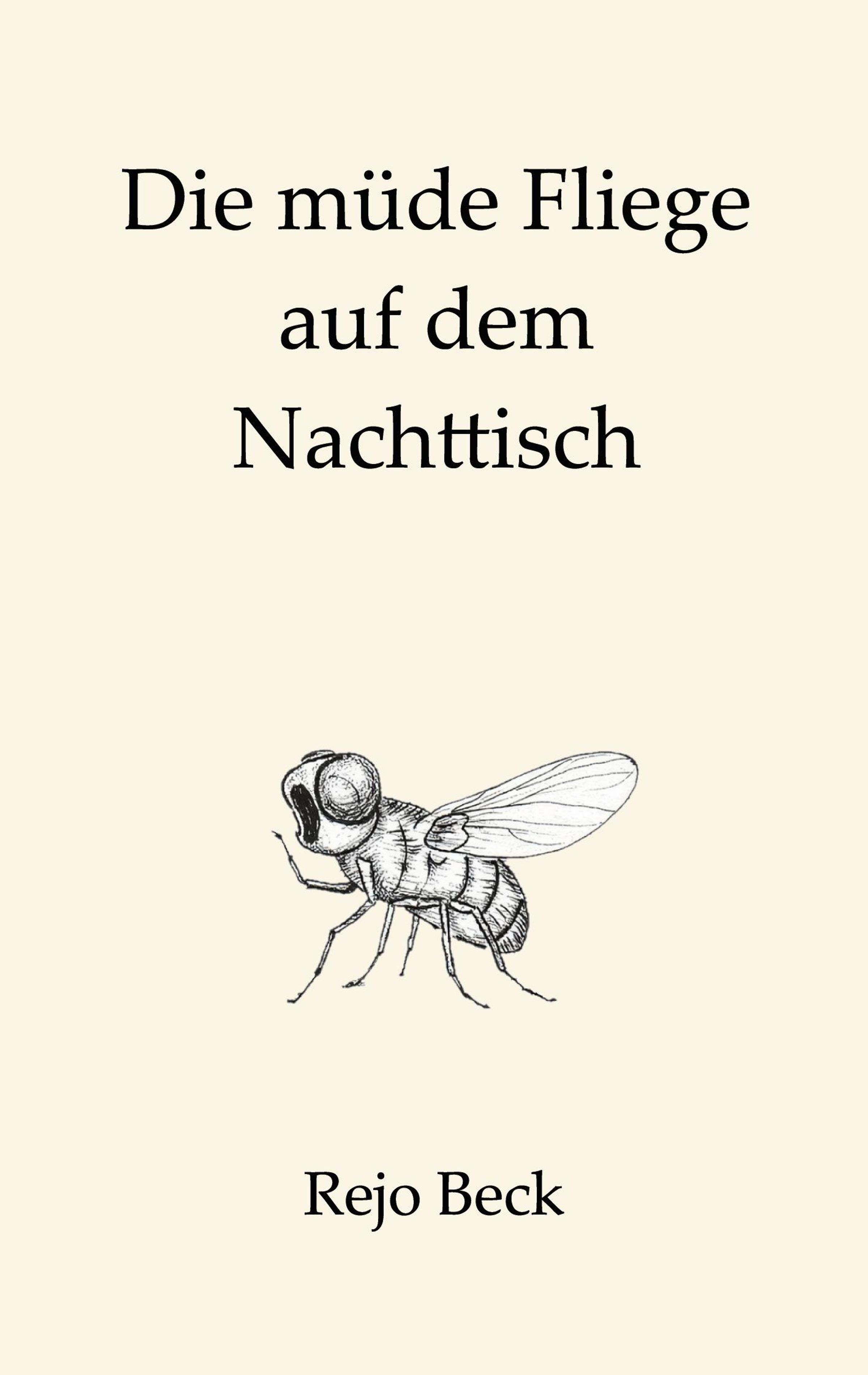 "Die müde Fliege auf dem Nachttisch" und "Rejo Beck" sind als Texte zu sehen. Eine detaillierte Fliegenillustration ist dargestellt., Buch