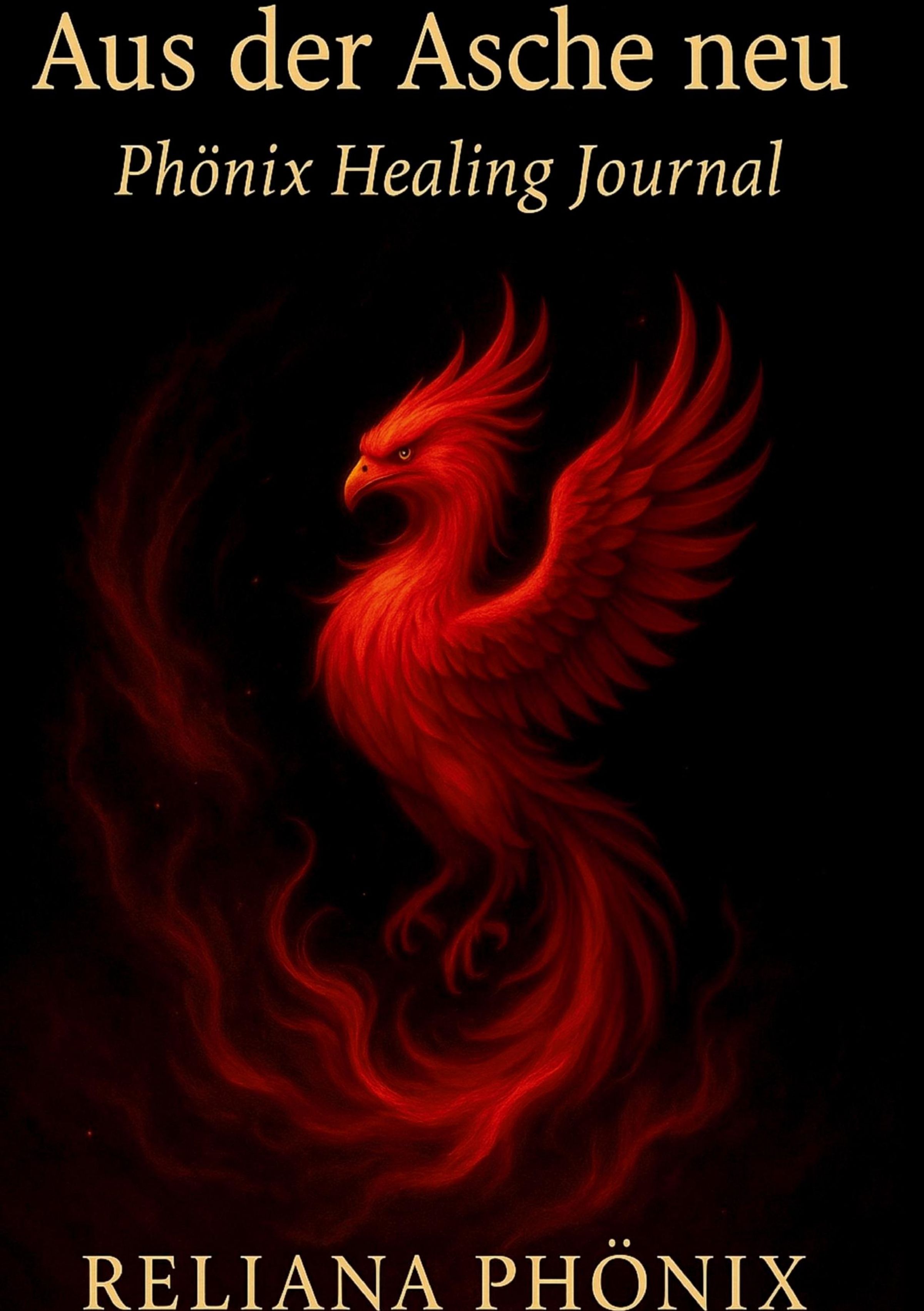 "Aus der Asche neu: Phönix Healing Journal" und "RELlANA PHÖNIX". Eine rote Phönix-Illustration vor schwarzem Hintergrund., Buch