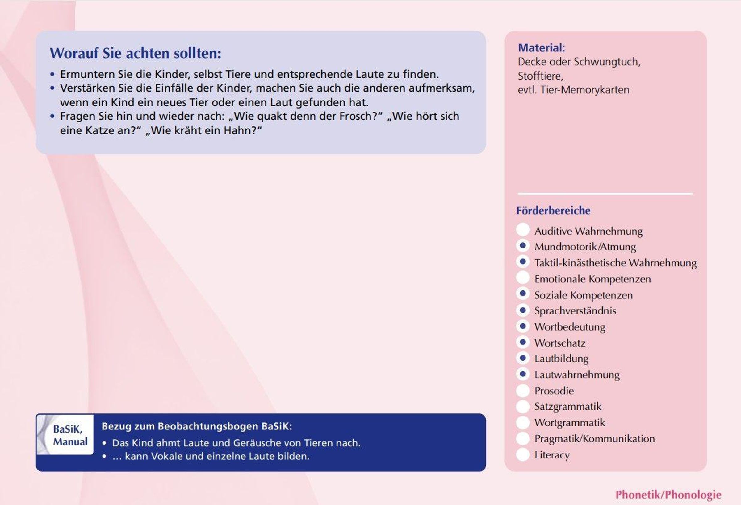 Die vorliegende Spielesammlung ist konzipiert für die Praxis der Sprachbildung und Sprachförderung. Nach einer kurzen Beschreibung des jeweiligen Förderbereichs wird eine der 40 Spielideen erläutert. Es folgen Anregungen und Tipps, worauf bei der Umsetzung zu achten ist: Wie wir die Interessen der Kinder berücksichtigen und uns "sprachförderlich" verhalten. Abschließend wird jeweils der Bezug zu dem Beobachtungsbogen BaSiK hergestellt. Die Karteikarten verstehen sich als Impulse, sie geben Beispiele für Fördermöglichkeiten.
