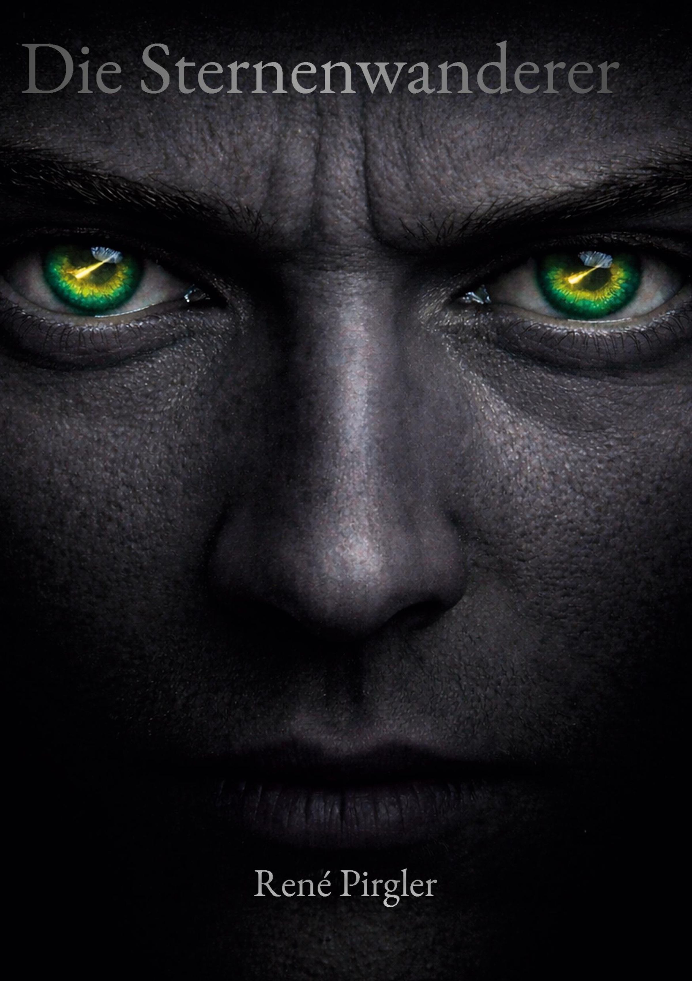 Text: "Die Sternenwanderer", "René Pirgler". Nahaufnahme eines Gesichtes, intensiv leuchtende grün-gelbe Augen., Buch