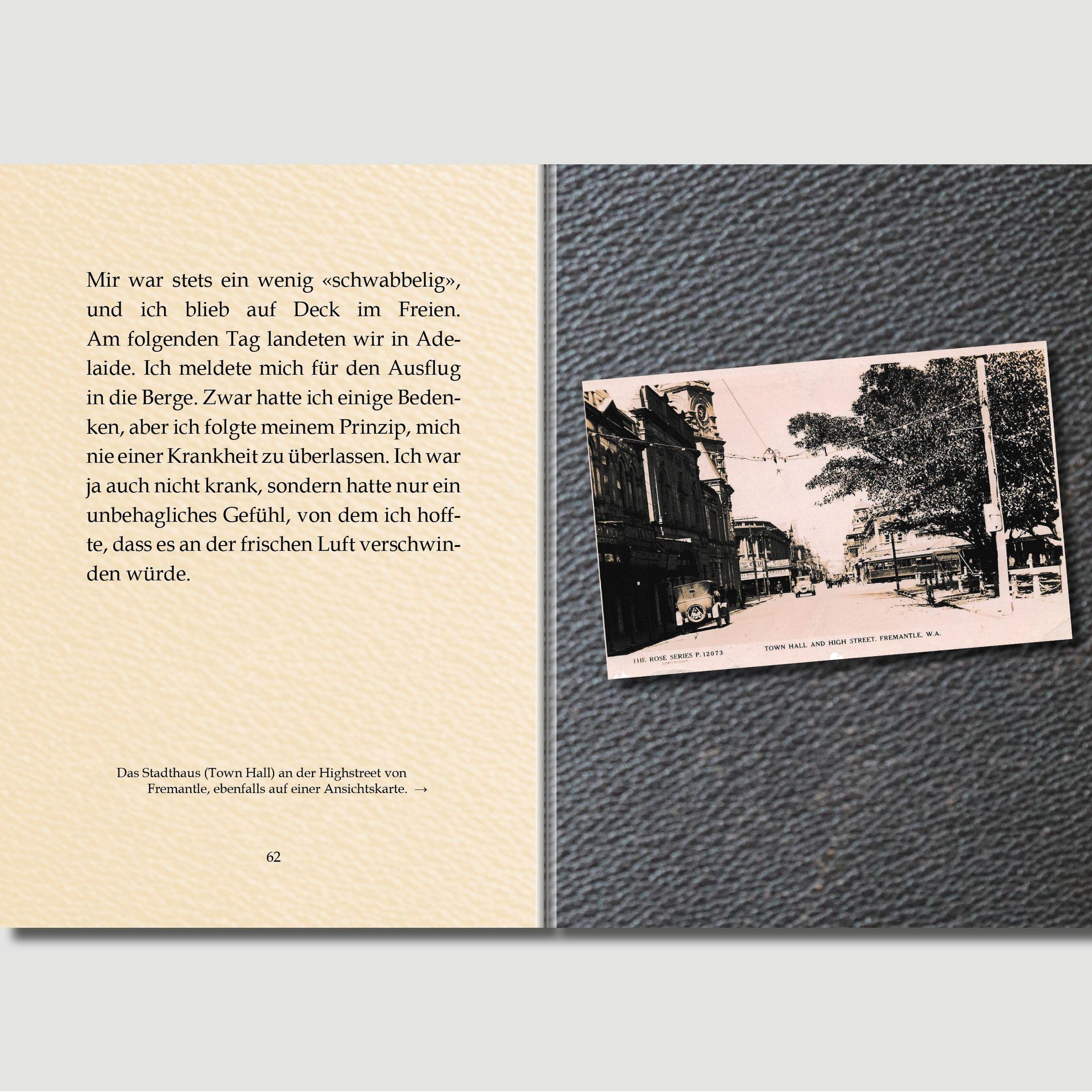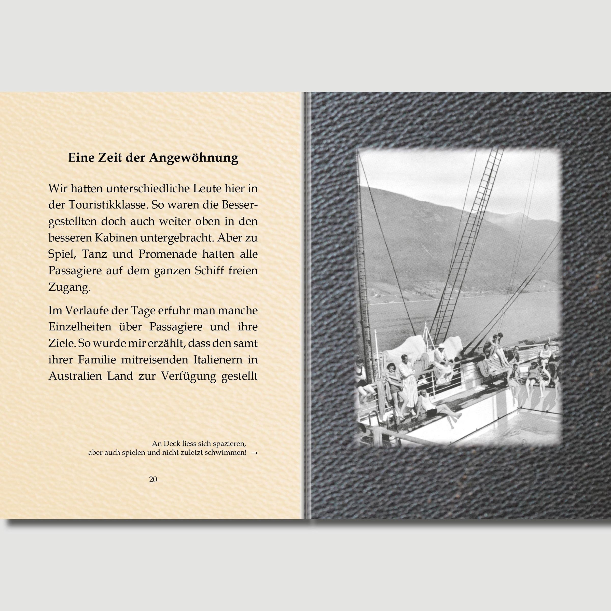 Da bieten sich die Schilderungen der Erlebnisse und Erfahrungen einer allein reisenden fünffachen Mutter vor gut 90 Jahren als Kontrast zur heutigen Perfekt-Touristik an. Jeweils 32 Tage war die Autorin nach Australien hin und zurück unterwegs. Ihre Schilderungen werden mit zeitgenössischen Illustrationen unterlegt.