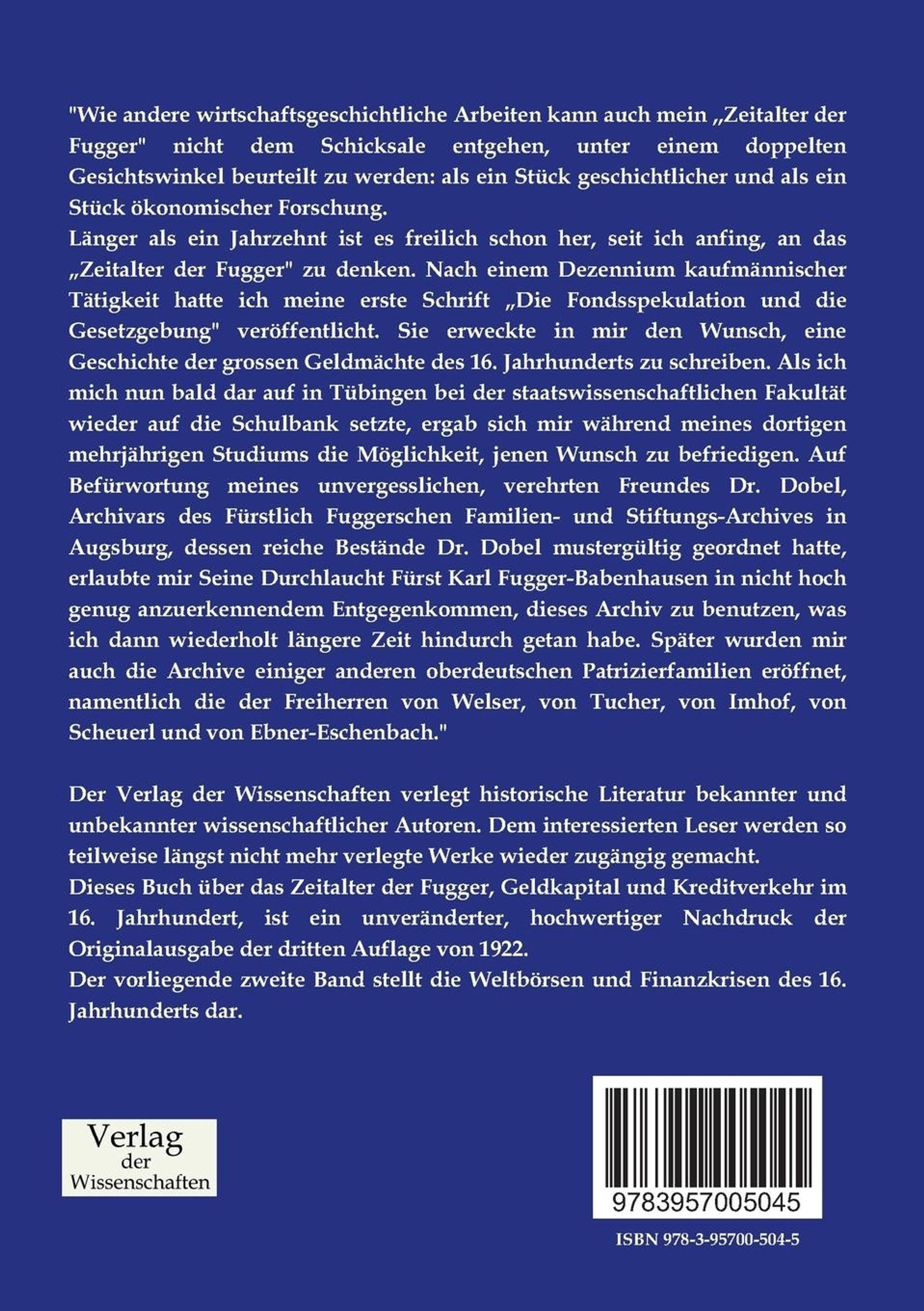 \"Wie andere wirtschaftsgeschichtliche Arbeiten kann auch mein ,,Zeitalter der Fugger\" nicht dem Schicksale entgehen, unter einem doppelten Gesichtswinkel beurteilt zu werden: als ein Stück geschichtlicher und als ein Stück ökonomischer Forschung. Länger als ein Jahrzehnt ist es freilich schon her, seit ich anfing, an das âZeitalter der Fugger\" zu denken. Nach einem Dezennium kaufmännischer Tätigkeit hatte ich meine erste Schrift âDie Fondsspekulation und die Gesetzgebung\" veröffentlicht. Sie erweckte in mir den Wunsch, eine Geschichte der grossen Geldmächte des 16. Jahrhunderts zu schreiben. Als ich mich nun bald dar auf in Tübingen bei der staatswissenschaftlichen Fakultät wieder auf die Schulbank setzte, ergab sich mir während meines dortigen mehrjährigen Studiums die Möglichkeit, jenen Wunsch zu befriedigen. Auf Befürwortung meines unvergesslichen, verehrten Freundes Dr. Dobel, Archivars des Fürstlich Fuggerschen Familien- und Stiftungs-Archives in Augsburg, dessen reiche Bestände Dr. Dobel mustergültig geordnet hatte, erlaubte mir Seine Durchlaucht Fürst Karl Fugger-Babenhausen in nicht hoch genug anzuerkennendem Entgegenkommen, dieses Archiv zu benutzen, was ich dann wiederholt längere Zeit hindurch getan habe. Später wurden mir auch die Archive einiger anderen oberdeutschen Patrizierfamilien eröffnet, namentlich die der Freiherren von Welser, von Tucher, von Imhof, von Scheuerl und von Ebner-Eschenbach.\"