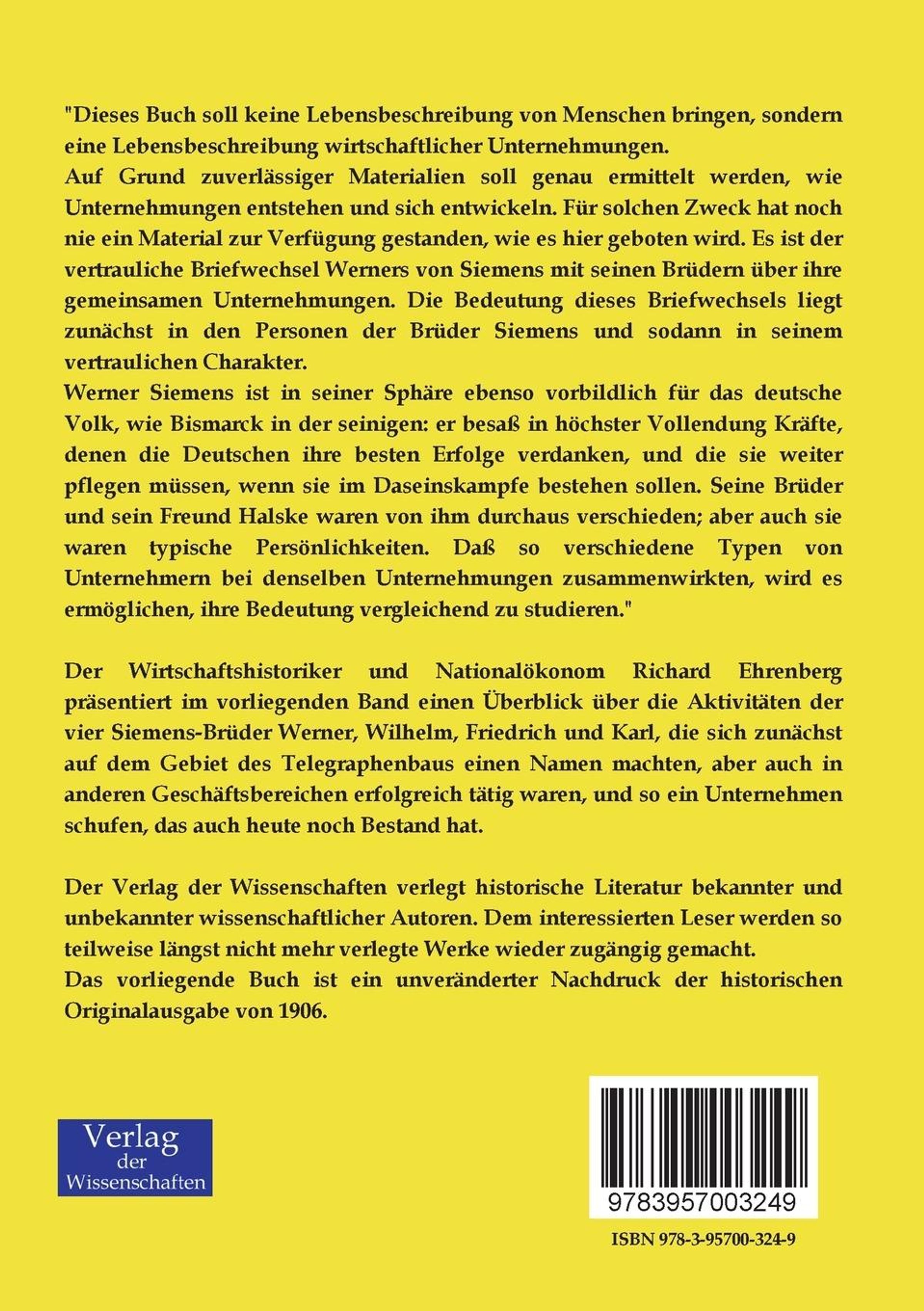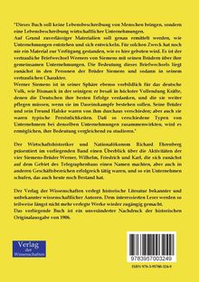 Der Wirtschaftshistoriker und Nationalökonom Richard Ehrenberg präsentiert im vorliegenden Band einen Überblick über die Aktivitäten der vier Siemens-Brüder Werner, Wilhelm, Friedrich und Karl, die sich zunächst auf dem Gebiet des Telegraphenbaus einen Namen machten, aber auch in anderen Geschäftsbereichen erfolgreich tätig waren, und so ein Unternehmen schufen, das auch heute noch Bestand hat.