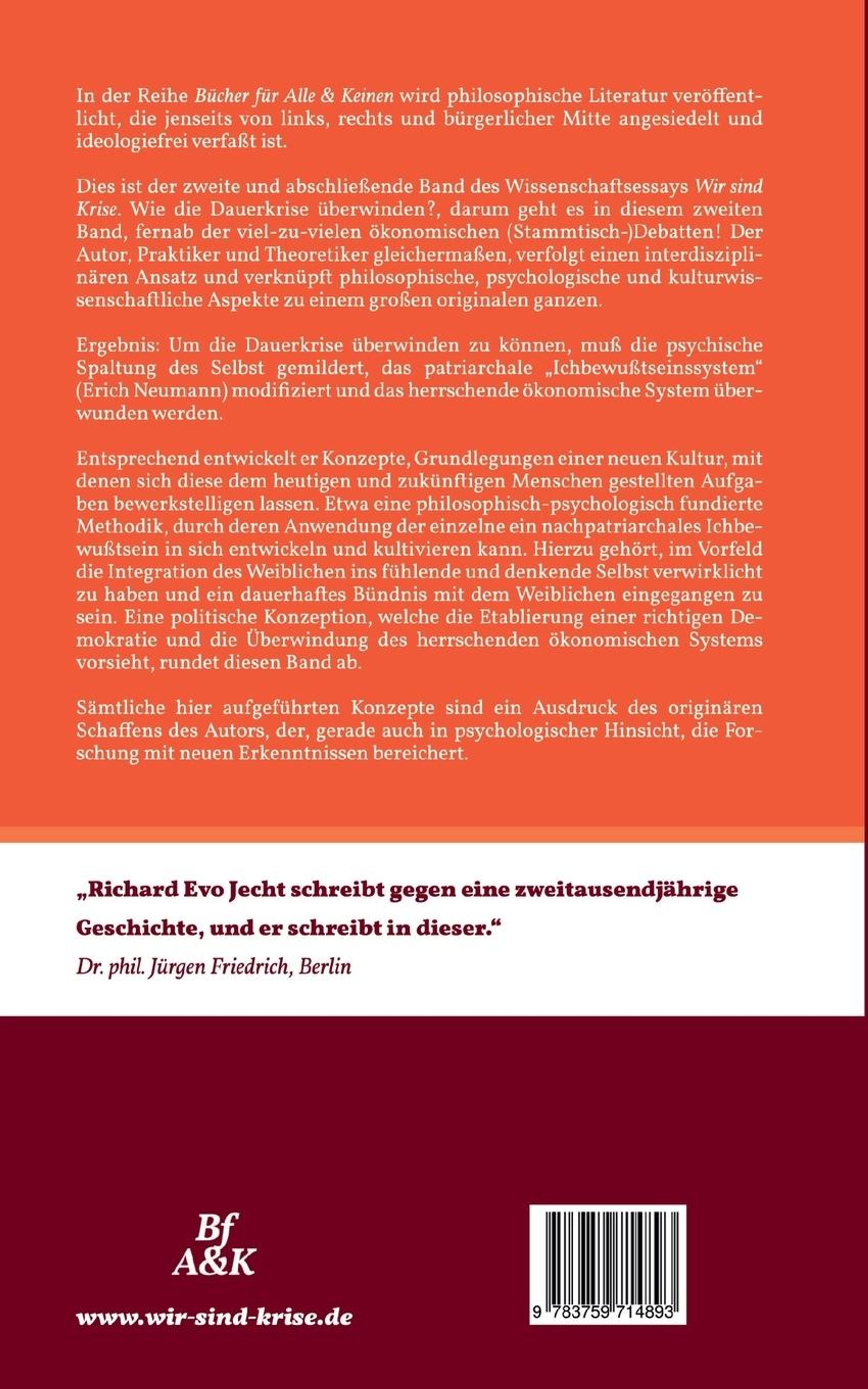 In der Reihe "Bücher für Alle u. Keinen" wird philosophische Literatur veröffentlicht, die jenseits von links, rechts und bürgerlicher Mitte angesiedelt, ideologiefrei verfaßt und im Philosophieblog wir-sind-krise. de erhältlich ist.