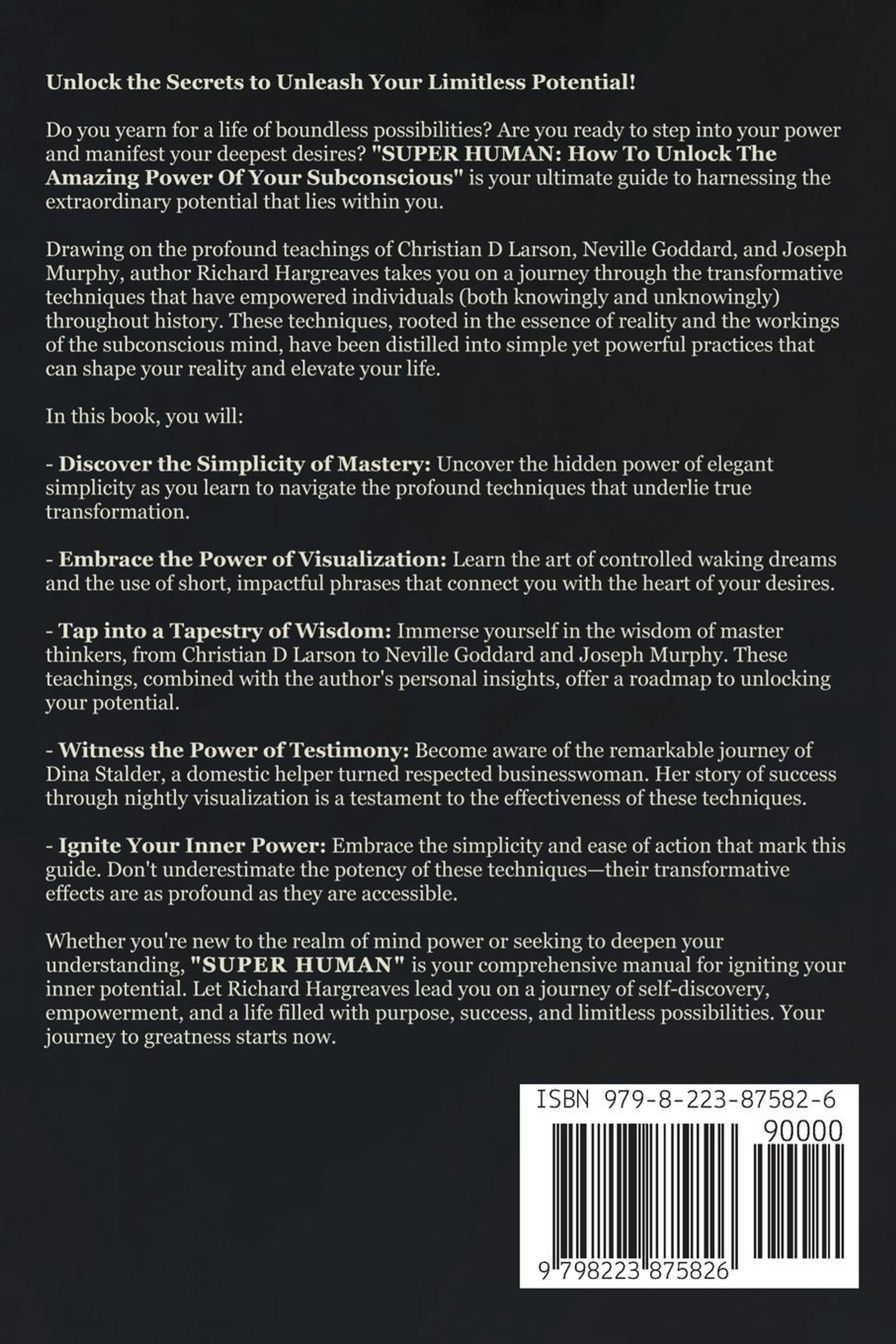 Are you ready to tap into the hidden wellspring of power that lies within you? "SUPER HUMAN: How To Unlock The Amazing Power Of Your Subconscious" is your guide to unlocking the untapped potential of your mind and unleashing extraordinary transformations in your life. Drawing on the profound teachings of luminaries like Christian D Larson, Neville Goddard, and Joseph Murphy, as well as the author's own personal experiences and in-depth studies, this book is a blueprint for manifesting your desires, achieving your goals, and experiencing a life of boundless possibilities. Discover the Secrets Within: Have you ever marveled at the simplicity that underlies true mastery? This book will show you how elegant simplicity is the key to unlocking the latent power within you. The techniques shared in this book may appear deceptively simple, but they are rooted in the very fabric of reality and the workings of the subconscious mind. A Journey Through Proven Techniques: Embark on a journey through the timeless techniques that have guided countless individuals towards success and fulfillment. From the controlled waking dream technique to using short, powerful phrases that embody your desires, you'll learn how to harness the power of your subconscious mind to shape your reality. Unlock Your Full Potential: In a world often filled with complex strategies and self-help techniques, "SUPER HUMAN" stands out for its emphasis on simplicity and ease of action. Don't equate simplicity with ineffectiveness---embrace it as a strength. The techniques revealed in this book are your keys to igniting your inner power and shaping the reality you desire. The Time Is Now: Whether you're new to the realm of mind power or seeking to deepen your understanding, this book is a comprehensive guide to transforming your life. The teachings within these pages are a synthesis of timeless wisdom and modern insights, and they're waiting to unlock the extraordinary potential within you. "SUPER HUMAN: How To Unlock The Amazing Power Of Your Subconscious" is a testament to the potential that lies within each of us. With a foundation in the teachings of masterful minds and the author's firsthand experiences, this book is your companion on the journey to a life filled with purpose, success, and limitless possibilities. Unleash Your Inner Potential Through Sleep: Imagine having the ability to shape your reality while you sleep. With Neville Goddard's powerful technique, you'll learn how to harness the twilight moments before sleep to assume the feeling of your wish fulfilled. Through controlled waking dreams and short, potent phrases, you'll immerse yourself in the experience of your desires being realized, activating the profound influence of your subconscious. Construct Your Dream Reality: Discover the art of crafting single events that imply the fulfillment of your wishes. Whether you're seeking financial abundance, radiant health, or enriching relationships, this technique empowers you to visualize and emotionally engage with scenarios that echo your desired reality. Through this practice, you communicate your intentions to the subconscious in a language it understands---feelings and vivid imagery. Transform Your Dreams into Reality: "SUPER HUMAN" offers a step-by-step roadmap to harnessing the dormant power of your subconscious mind. As you navigate through the pages, you'll gain insights into the intricacies of this technique and witness the remarkable changes that unfold in your life. Your dreams will no longer be confined to your sleep; they'll become a living reality that shapes your waking world. Grab your copy now of "SUPER HUMAN: How To Unlock The Amazing Power Of Your Subconscious" and step into a life of limitless creation and transformation.