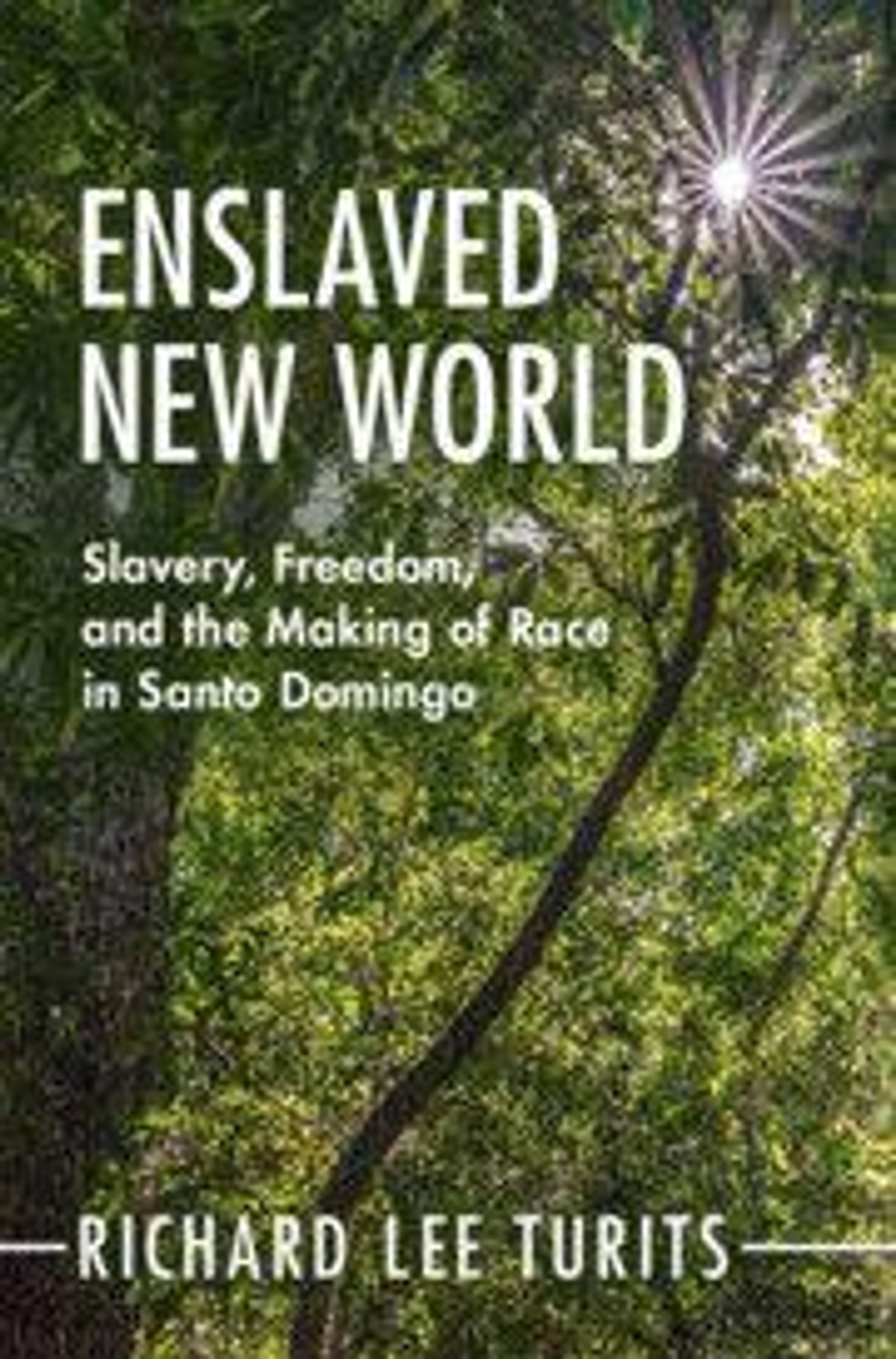 Text: "ENSLAVED NEW WORLD. Slavery, Freedom, and the Making of Race in Santo Domingo. Richard Lee Turits." Hintergrund: Baumkronen., Buch