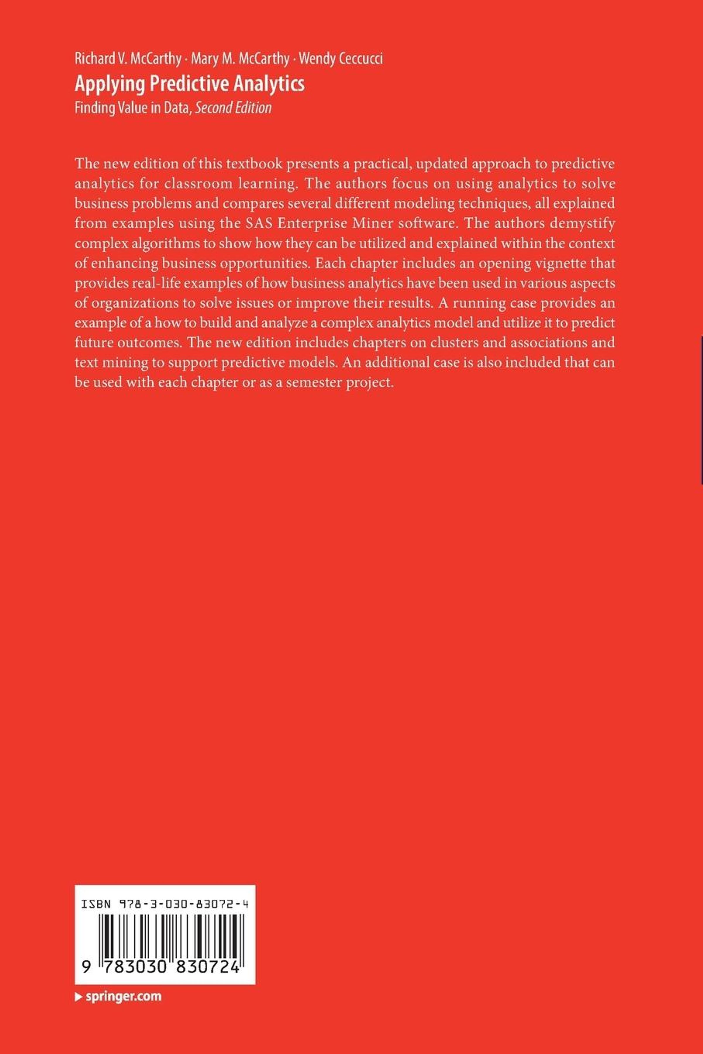 The new edition of this textbook presents a practical, updated approach to predictive analytics for classroom learning. The authors focus on using analytics to solve business problems and compares several different modeling techniques, all explained from examples using the SAS Enterprise Miner software. The authors demystify complex algorithms to show how they can be utilized and explained within the context of enhancing business opportunities. Each chapter includes an opening vignette that provides real-life examples of how business analytics have been used in various aspects of organizations to solve issues or improve their results. A running case provides an example of a how to build and analyze a complex analytics model and utilize it to predict future outcomes. The new edition includes chapters on clusters and associations and text mining to support predictive models. An additional case is also included that can be used with each chapter or as a semester project.