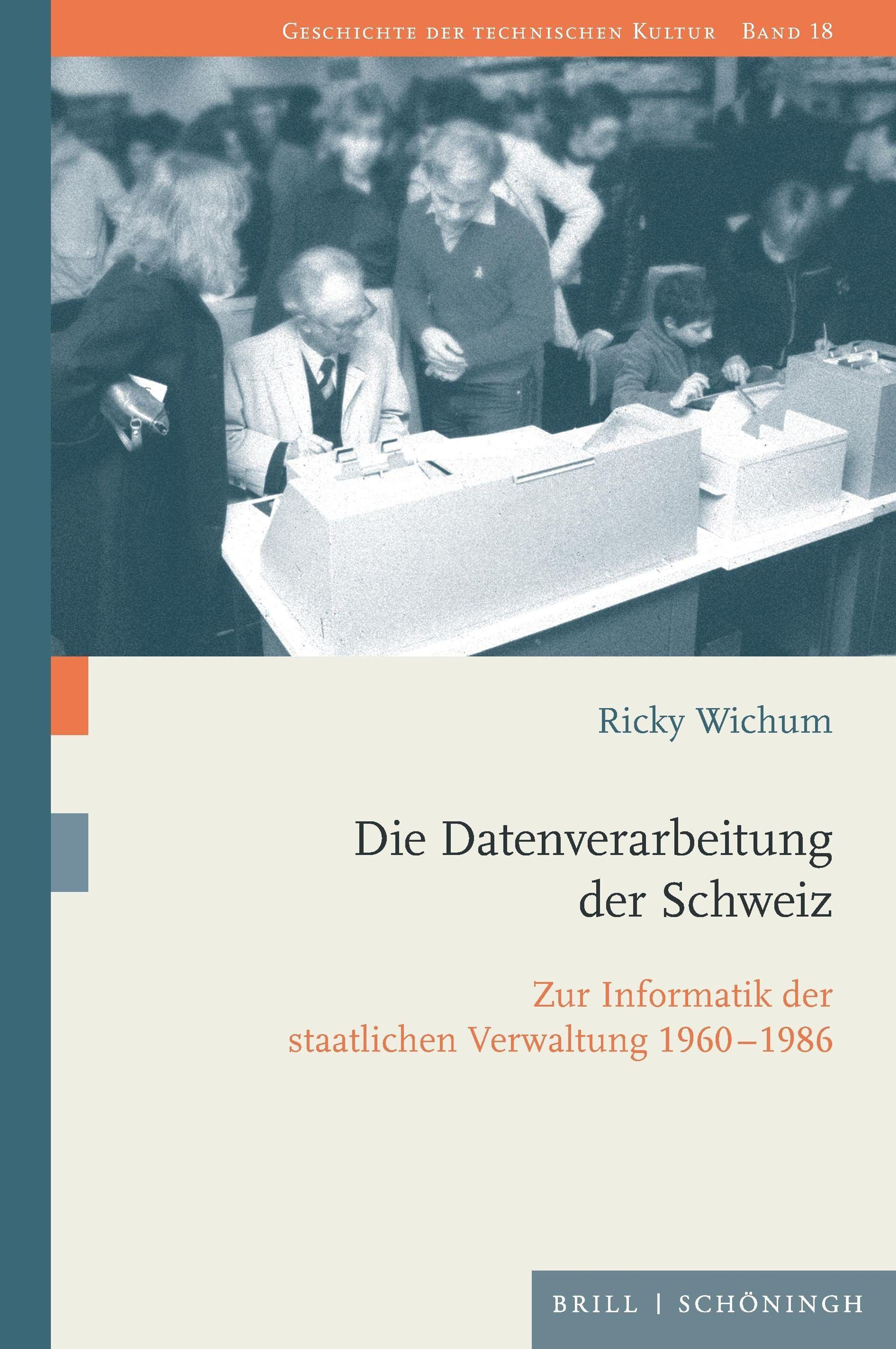 "Geschichte der technischen Kultur Band 18. Ricky Wichum: Die Datenverarbeitung der Schweiz. Zur Informatik 1960–1986." Im Hintergrund Menschen um einen Computer., Buch