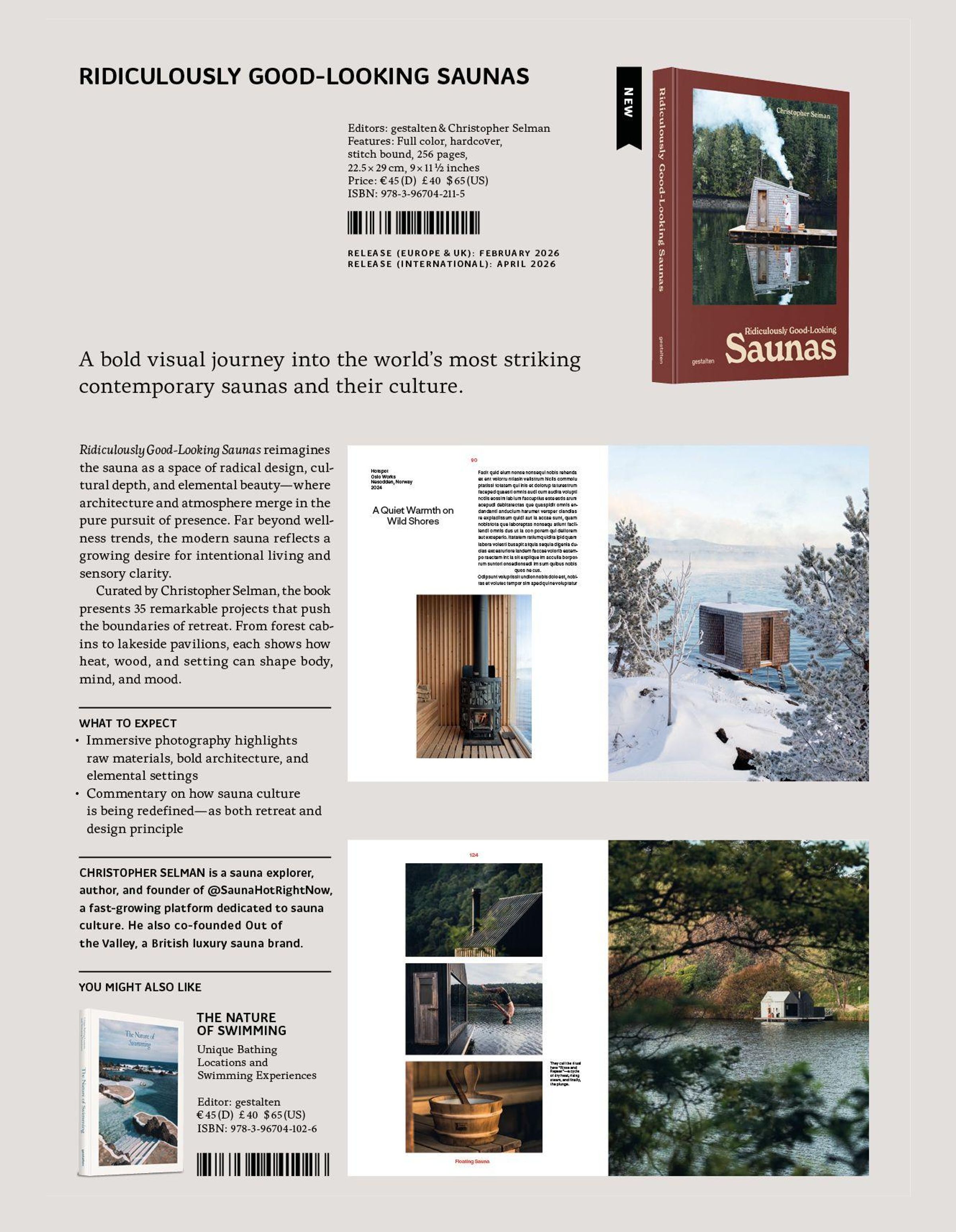 Ridiculously Good Looking Saunas lädt zu einer neuen Sicht auf die Sauna ein: als architektonisches Statement, kulturelles Ritual und zeitgemäßen Rückzugsort. Kuratiert von Chris Selman zeigt das Buch 35 herausragende Projekte aus aller Welt - von minimalistischen Hütten im Wald bis zu spektakulären Pavillons am Wasser. Mit eindrucksvoller Fotografie und pointierten Texten wird sichtbar, wie Material, Form und Umgebung zusammenwirken und die Sauna zu einem Ort machen, der Körper und Geist gleichermaßen anspricht.