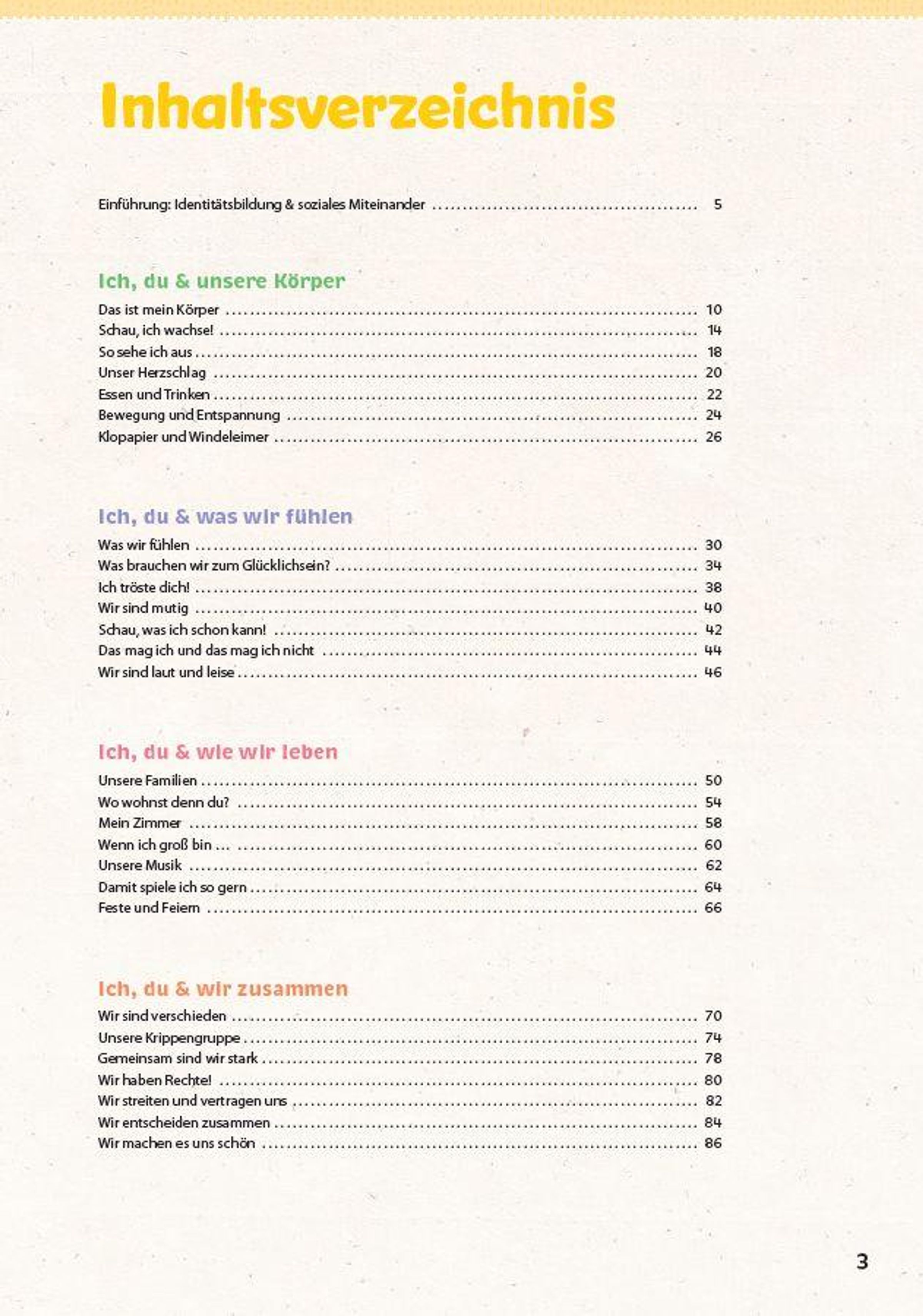 Wer bin ich? Was mag ich? Und wie ist es, Teil einer Gemeinschaft zu sein? Die 28 liebevoll gestalteten Projekte rund um das Thema "Ich, du und die anderen" laden Krippenkinder dazu ein, sich selbst und ihr soziales Umfeld bewusst wahrzunehmen. Ob beim Entdecken der eigenen Gefühle, beim Teilen, Helfen, Streiten und Versöhnen - die Projekte fördern auf spielerische Weise Selbstwirksamkeit, Empathie und Gemeinschaftssinn.