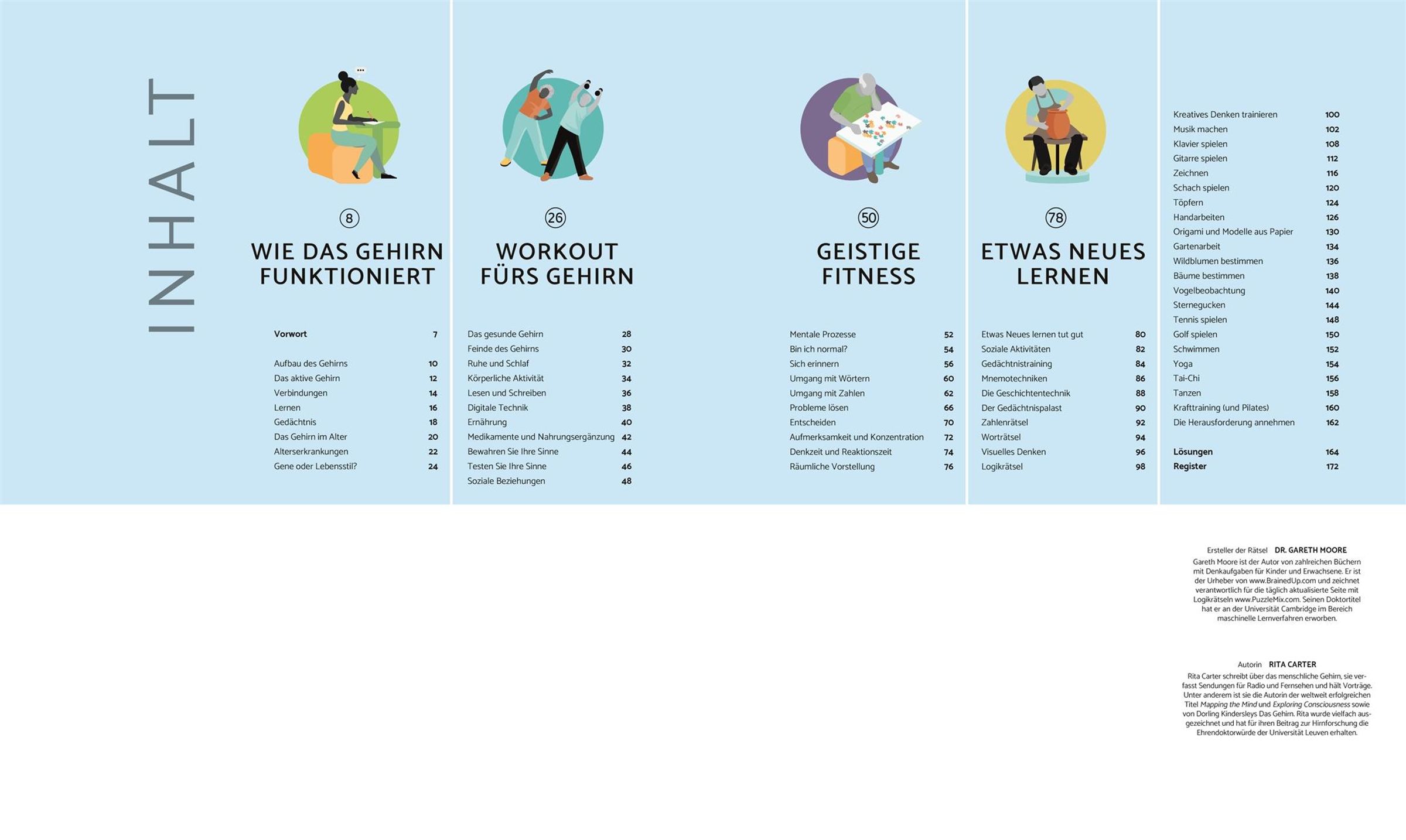 Geistige Fitness kann auch durch körperliches Training gefördert werden, denn ein gesunder Geist steckt in einem gesunden Körper. Aus diesem Grund enthält das Buch nicht nur klassische Logikrätsel und Konzentrationsübungen, sondern auch viele Inspirationen für Aktivitäten und Hobbys, die geistig fit halten. Außerdem liefert das Buch wichtige Hintergrundinformationen zu den Prozessen in unserem Gehirn sowie zu einer gesunden Lebensweise, die einer Demenz vorbeugen kann.