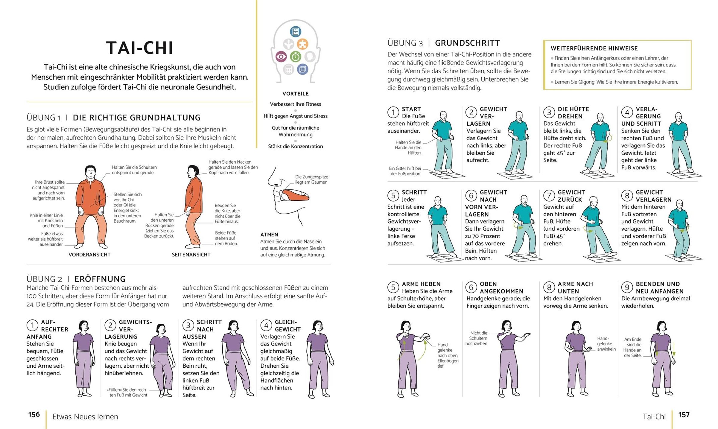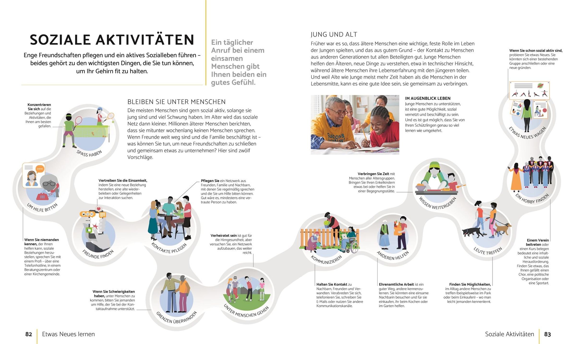 - Inspirationen mit Schritt-für-Schritt-Anleitungen zu unterschiedlichen Aktivitäten, die das Gehirn stimulieren: z. B. Töpfern, Gärtnern, Himmelsbeobachtung, Yoga, Tai-chi, Tanzen