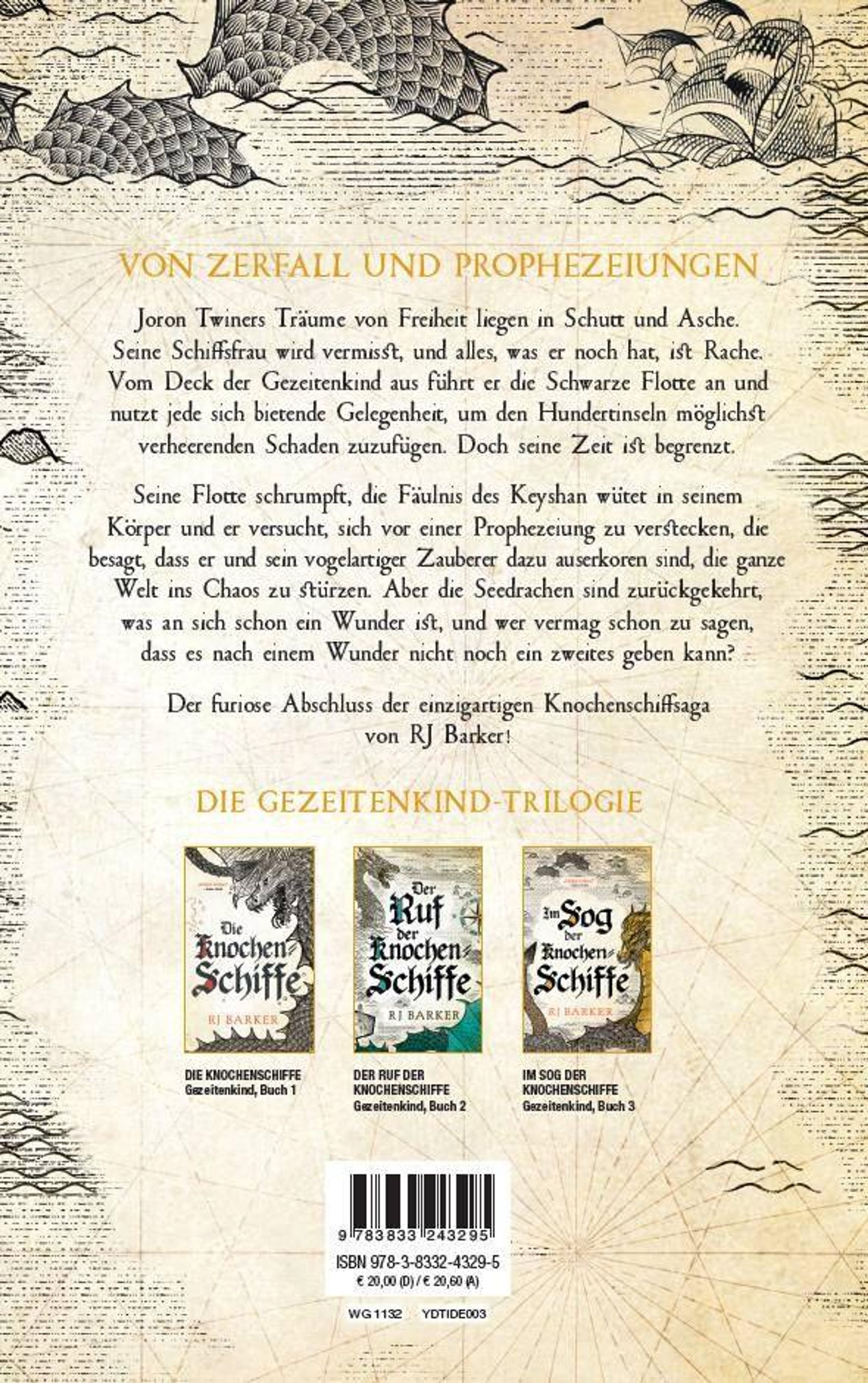 Gezeitenkind-Trilogie - Band 3: Im Sog der Knochen-Schiffe Joron Twiners Träume von Freiheit liegen in Schutt und Asche. Seine Schiffsfrau wird vermisst, und alles, was er noch hat, ist Rache. Vom Deck der Gezeitenkind aus führt er die Schwarze Flotte an und nutzt jede sich bietende Gelegenheit, um den Hundertinseln möglichst verheerenden Schaden zuzufügen. Doch seine Zeit ist begrenzt. Seine Flotte schrumpft, die Fäulnis des Keyshan wütet in seinem Körper und er versucht, sich vor einer Prophezeiung zu verstecken, die besagt, dass er und sein vogelartiger Zauberer dazu auserkoren sind, die ganze Welt ins Chaos zu stürzen. Aber die Seedrachen sind zurückgekehrt, was an sich schon ein Wunder ist, und wer vermag schon zu sagen, dass es nach einem Wunder nicht noch ein zweites geben kann?