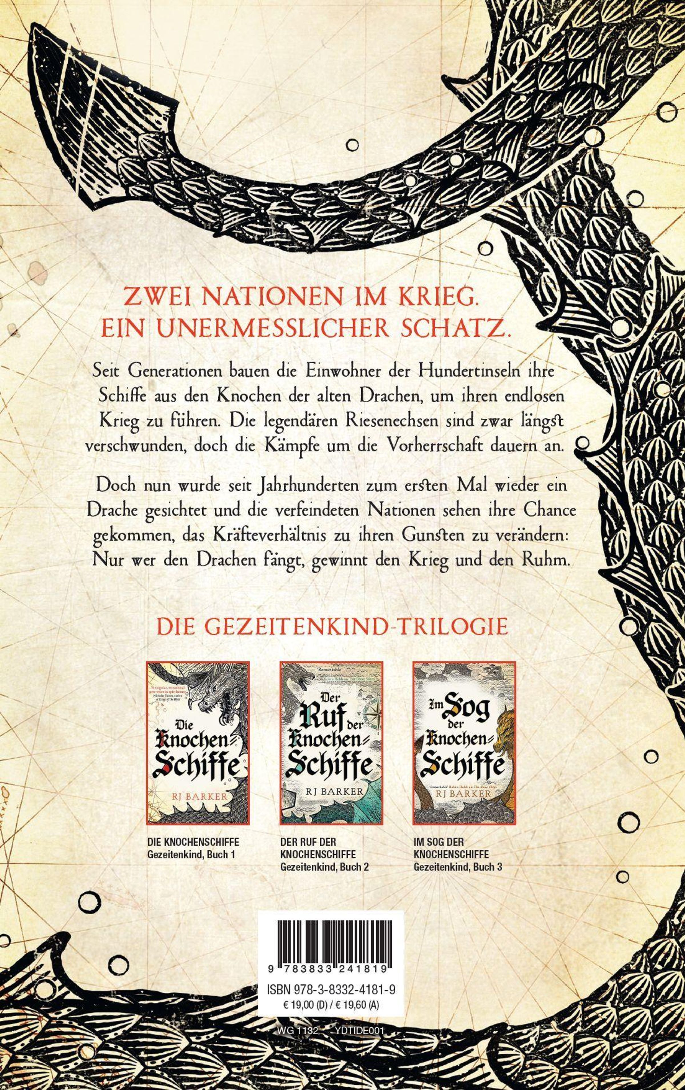 Gezeitenkind-Trilogie - Band 1: Die Knochen-Schiffe Seit Generationen bauen die Einwohner der Hundert Inseln ihre Schiffe aus den Knochen der alten Drachen, um ihren endlosen Krieg zu führen. Die legendären Riesenechsen sind zwar längst verschwunden, doch die Kämpfe um die Vorherrschaft dauern an. Jetzt wurde seit Jahrhunderten zum ersten Mal wieder ein Drache gesichtet und die verfeindeten Nationen sehen ihre Chance gekommen, das Kräfteverhältnis zu ihren Gunsten zu verändern: Nur wer den Drachen fängt, gewinnt den Krieg und den Ruhm.