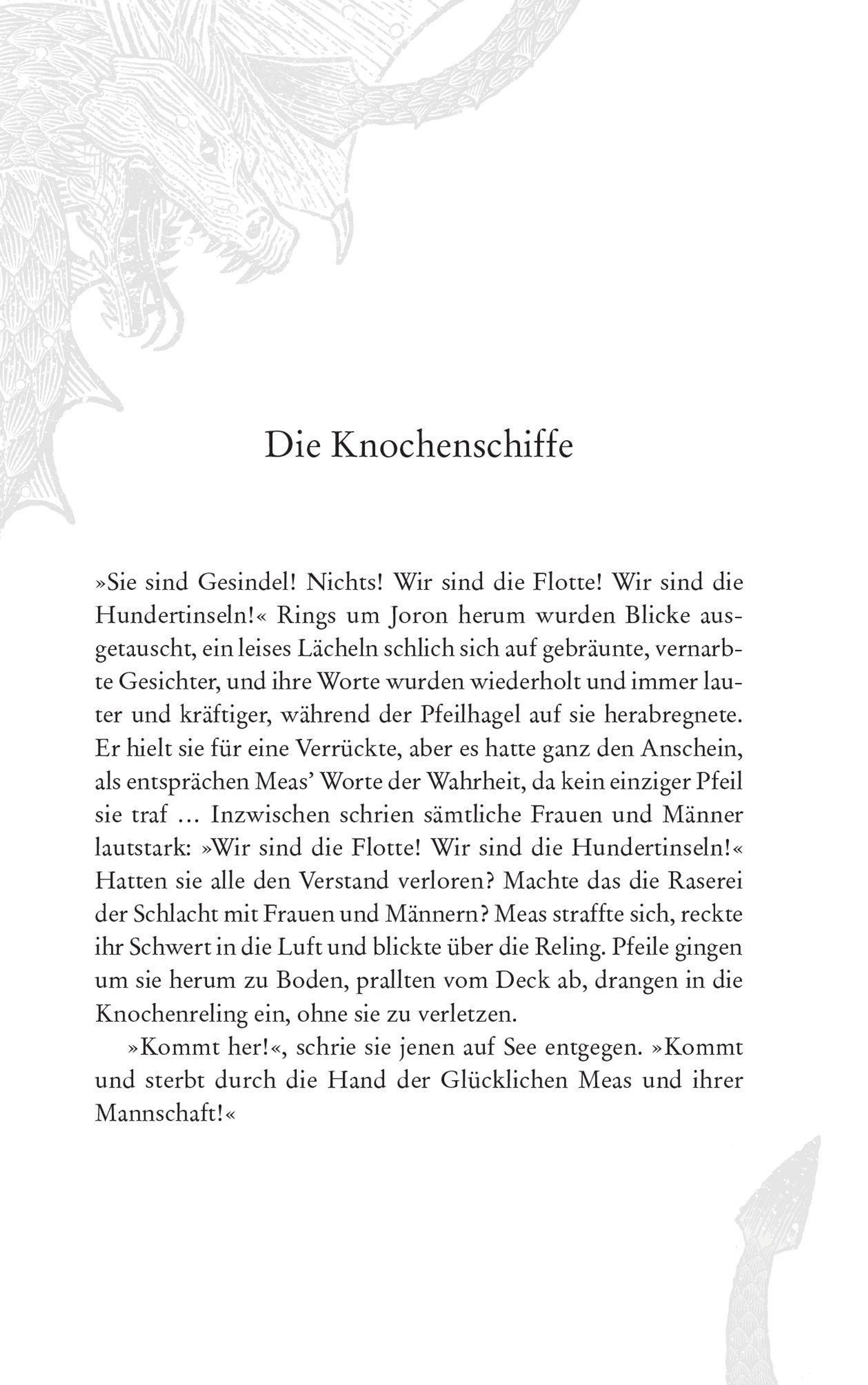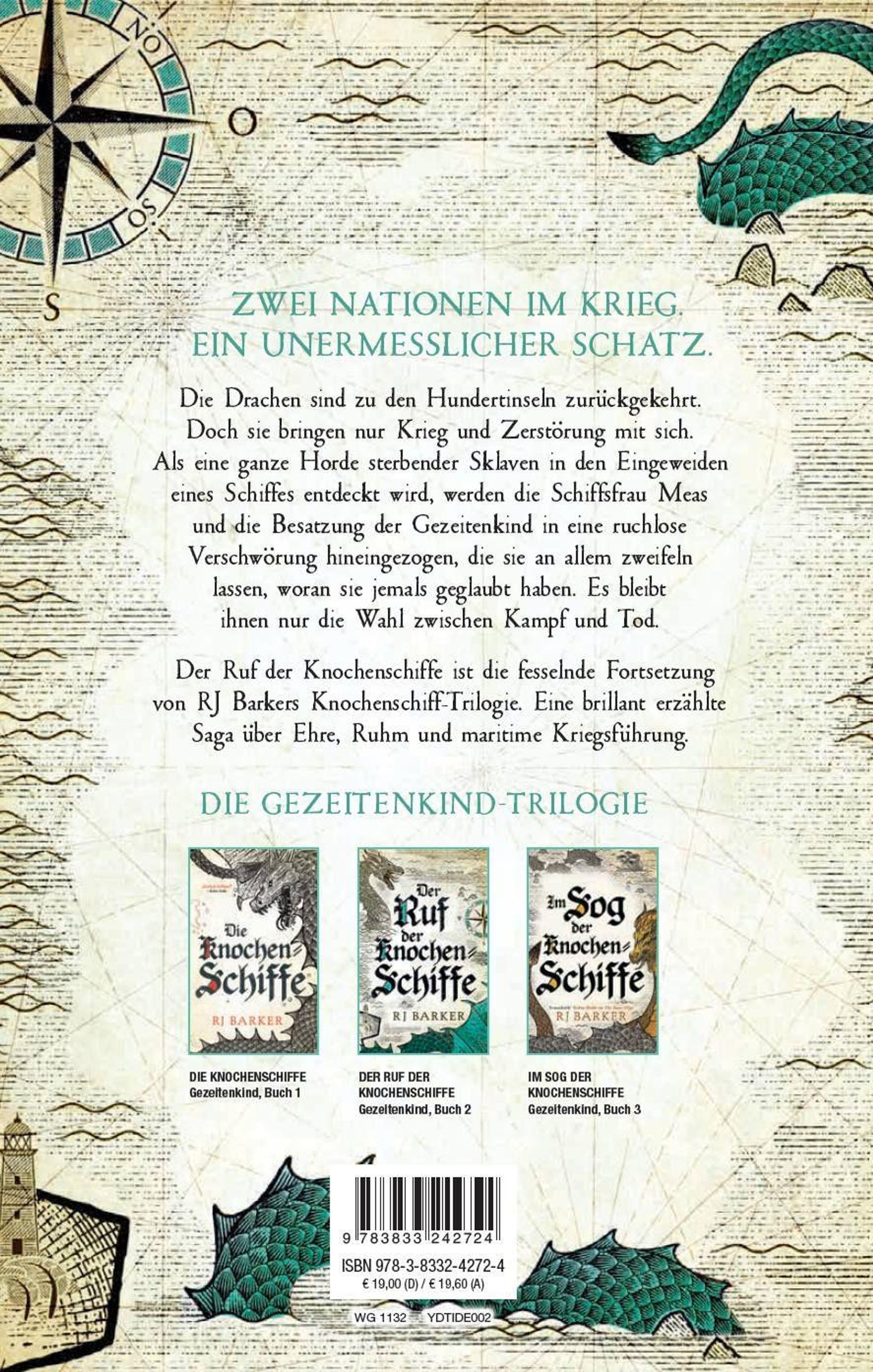 Gezeitenkind-Trilogie - Band 2: Der Ruf der Knochen-Schiffe Die Drachen sind zu den Hundertinseln zurückgekehrt. Doch sie bringen nur Krieg und Zerstörung mit sich. Als eine ganze Horde sterbender Sklaven in den Eingeweiden eines Schiffes entdeckt wird, werden die Schiffsfrau Meas und die Besatzung der Gezeitenkind in eine ruchlose Verschwörung hineingezogen, die sie an allem zweifeln lassen, woran sie jemals geglaubt haben. Es bleibt ihnen nur die Wahl zwischen Kampf und Tod.