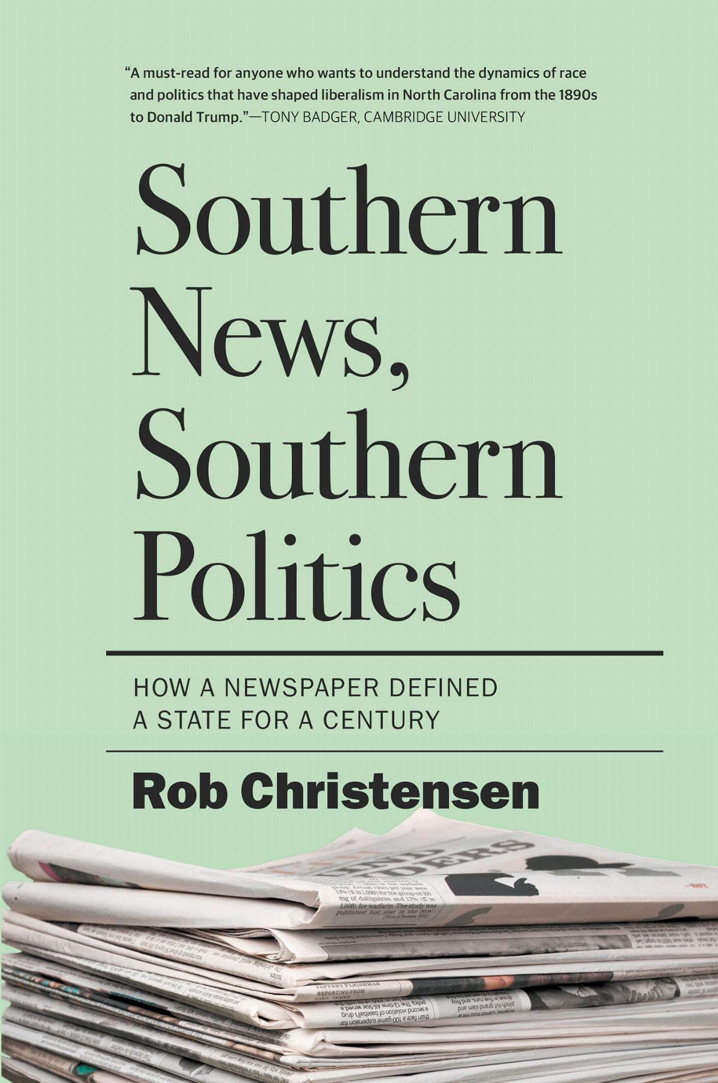 „Southern News, Southern Politics“ von Rob Christensen. Stapel Zeitungen auf hellgrünem Hintergrund., Buch