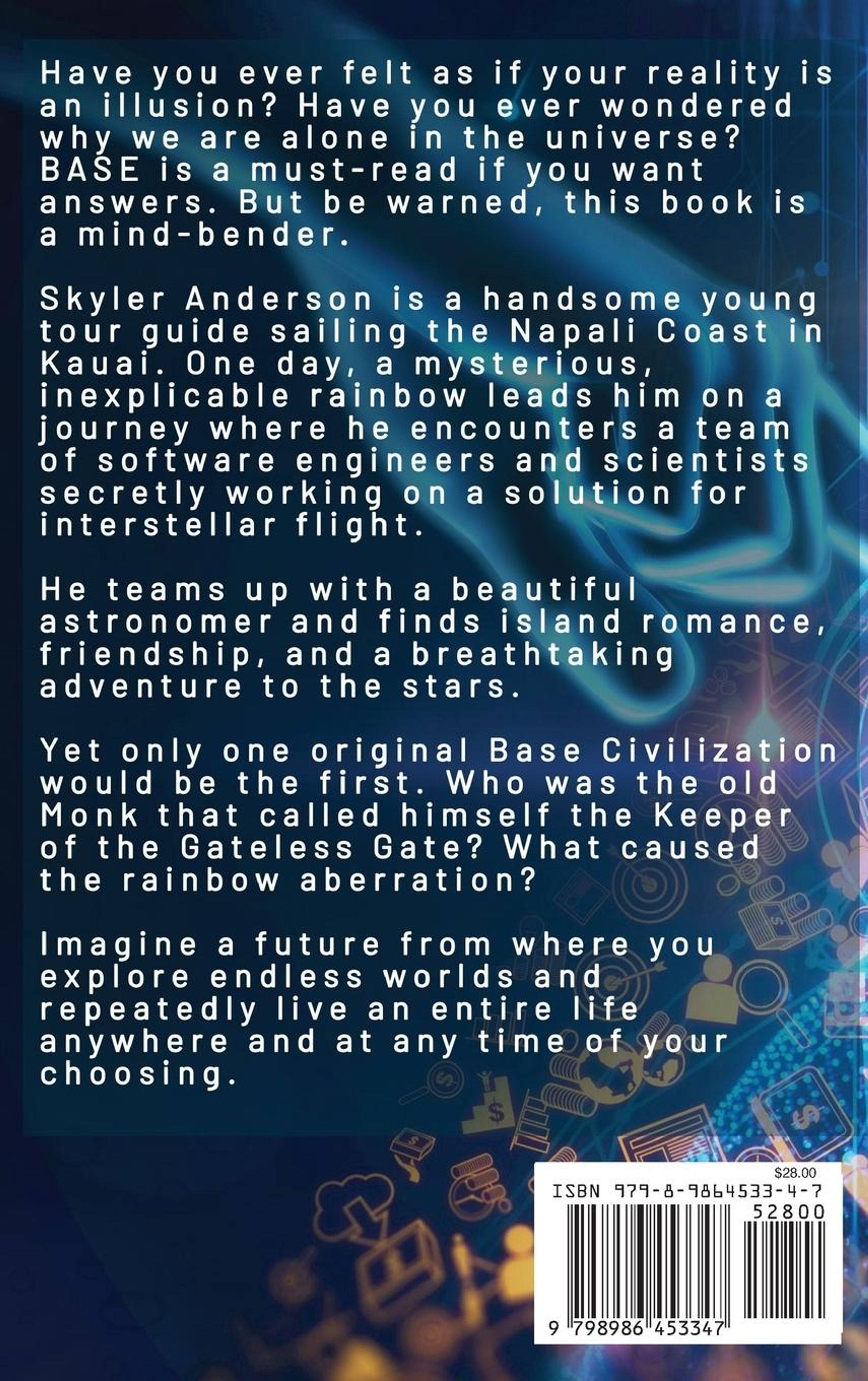 Skyler Anderson is a handsome young tour guide sailing the Napali Coast in Kauai. One day, a mysterious, inexplicable rainbow leads him on a journey where he encounters a team of software engineers and scientists secretly working on a solution for interstellar flight.
