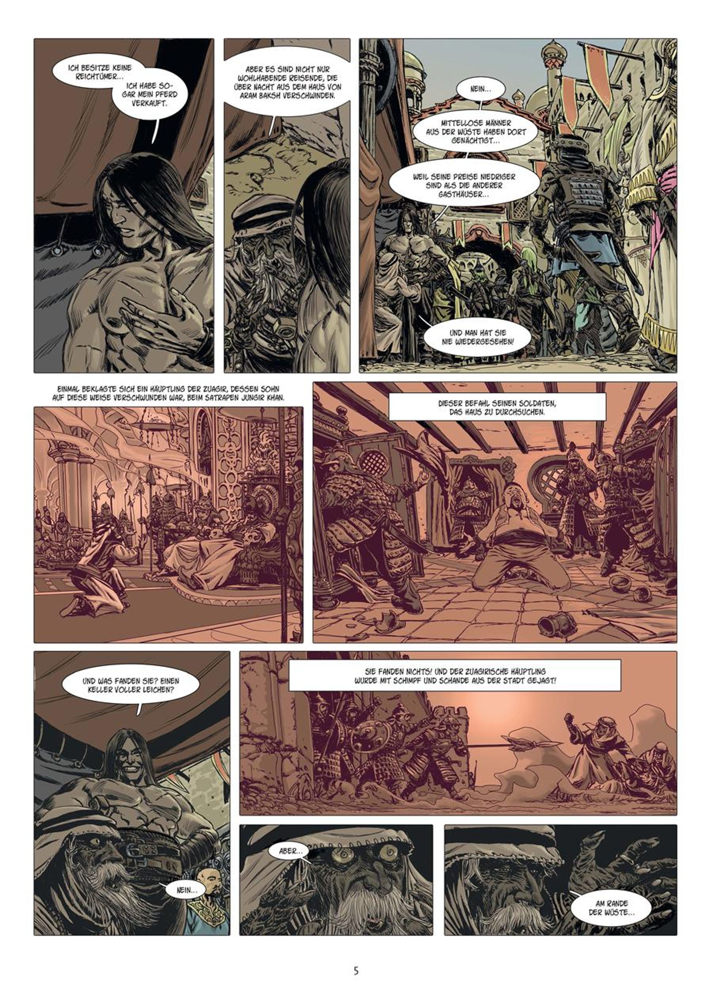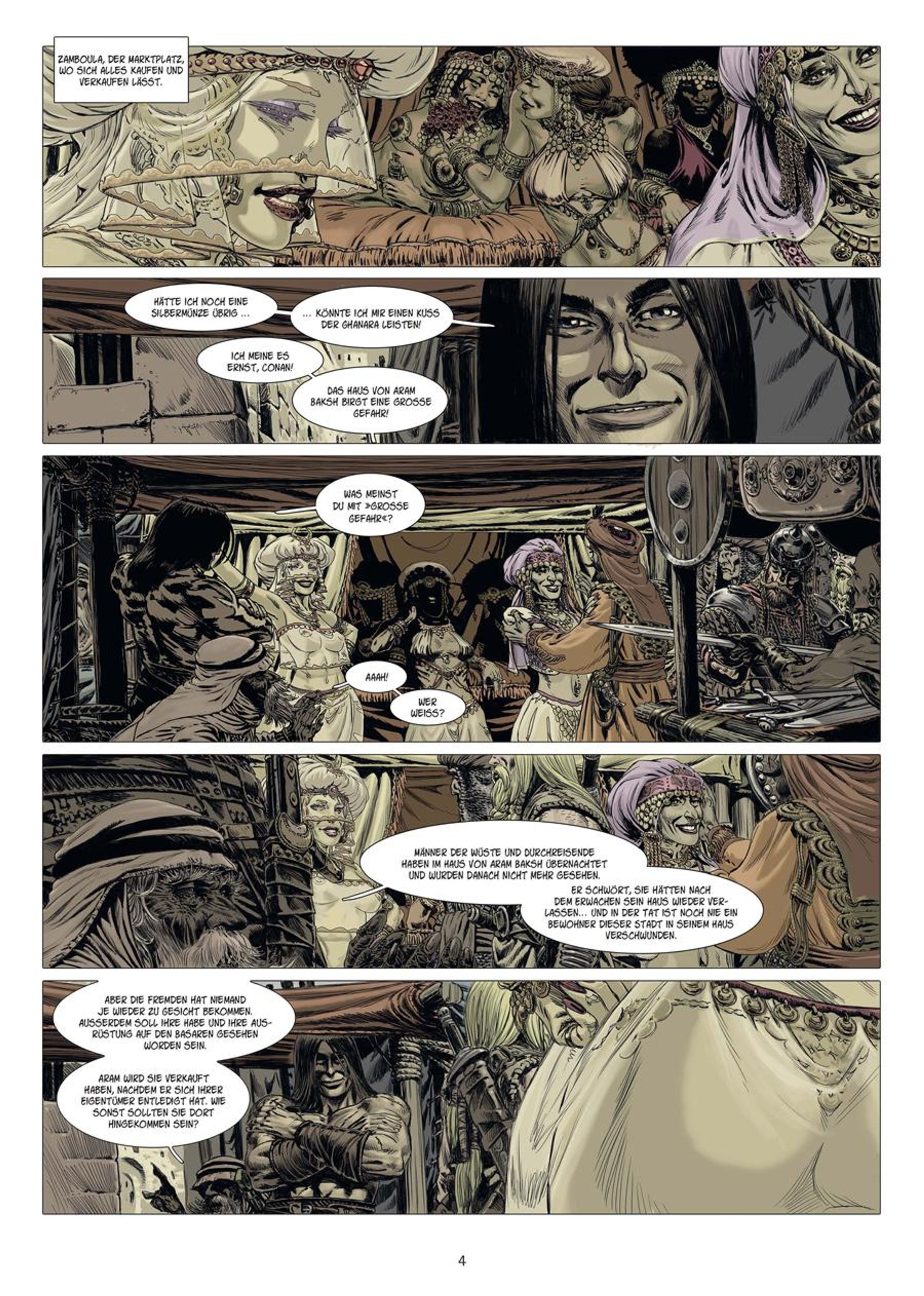 Die mythische Handelsstadt Zamboula ist ein Schmelztiegel für zahllose Religionen, Sprachen und Kulturen und Schauplatz vieler düsterer Legenden. Conan wurde vor dem Haus von Aram Baksh gewarnt, man sagt, jeder Fremdländer, der es betritt, würde unter undurchsichtigen Umständen verschwinden... das passt dem Cimmerier hervorragend, denn er hat beschlossen, dort die Nacht zu verbringen! Aber indem er den Schleier des Ungewissen über den Entführungen lüftet, kommt Conan einem ungleich schrecklicheren Geheimnis auf die Spur, das mit der gesamten Stadt Zamboula in Verbindung steht... Conan ist zurück. Wilder. Stärker. Schöner. Mächtiger als je zuvor. Seit Jahrzehnten betreibt der Barbar aus Cimmerien sein blutiges Handwerk in Comics aus den Häusern Marvel und Dark Horse. Aber diese Adaptionen der Novellen von Robert E. Howard sind aus einem anderen Holz geschnitzt: Die besten Szenaristen und Zeichner Frankreichs haben sich zusammengefunden, um dem Gott von Sword & Sorcery Tribut zu zollen. Legendäre Geschichten, bearbeitet von Größen der Comic-Kunst. So offenbaren sich frische Perspektiven auf Conan und seine gefährliche Welt und die klassischen Werke erstrahlen in neuem Glanz. Jeder Band umfasst eine abgeschlossene Geschichte, basierend auf einem Originalwerk von >>Conan<<-Schöpfer Robert E. Howard, und beinhaltet umfangreiches Bonusmaterial zur Entstehung des Mythos >>Conan<< und der Comic-Adaptionen.