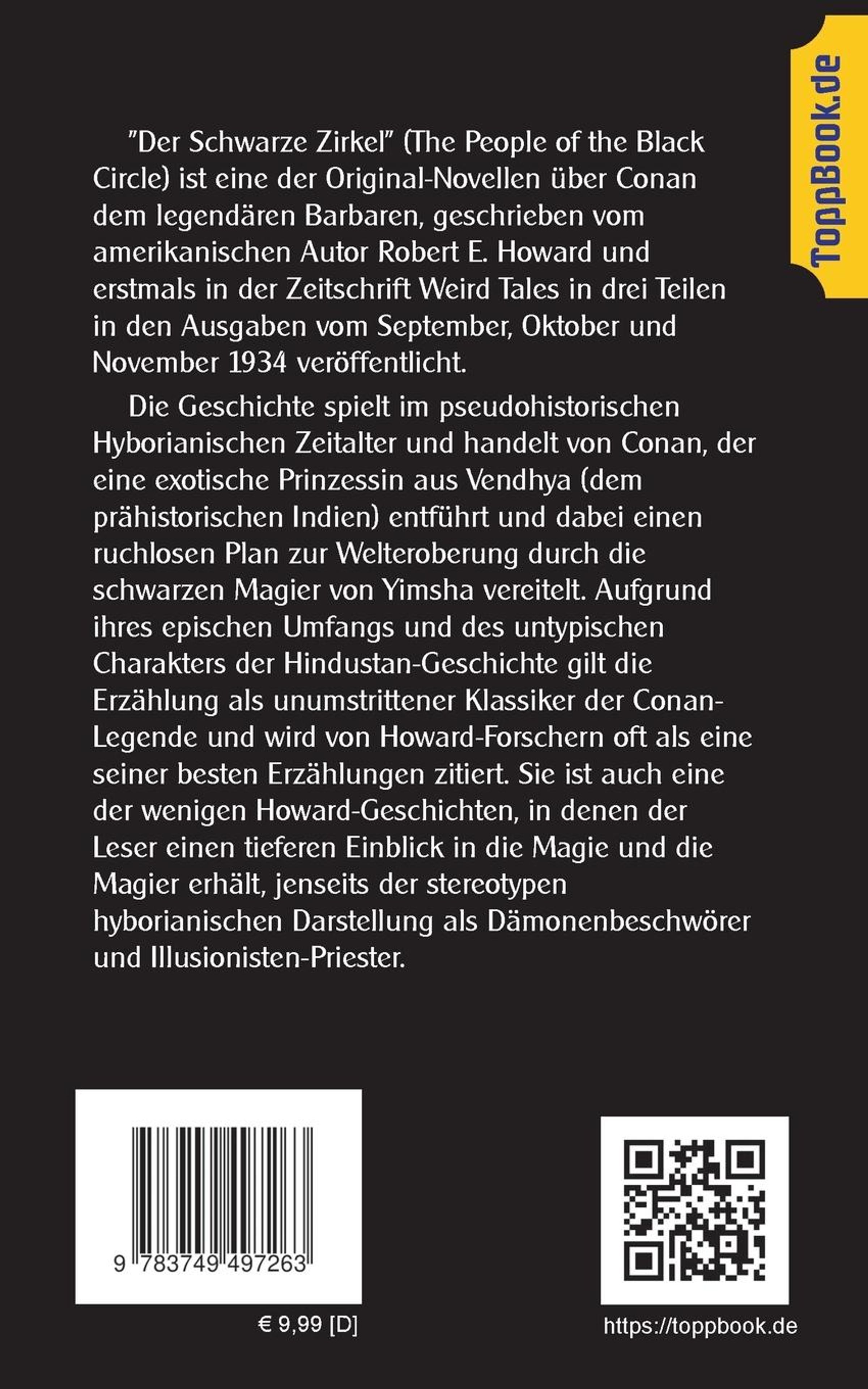 "Der Schwarze Zirkel" (The People of the Black Circle) ist eine der Original-Novellen über Conan dem legendären Barbaren, geschrieben vom amerikanischen Autor Robert E. Howard und erstmals in der Zeitschrift Weird Tales in drei Teilen in den Ausgaben vom September, Oktober und November 1934 veröffentlicht. Die Geschichte spielt im pseudohistorischen Hyborianischen Zeitalter und handelt von Conan, der eine exotische Prinzessin aus Vendhya (dem prähistorischen Indien) entführt und dabei einen ruchlosen Plan zur Welteroberung durch die schwarzen Magier von Yimsha vereitelt. Aufgrund ihres epischen Umfangs und des untypischen Charakters der Hindustan-Geschichte gilt die Erzählung als unumstrittener Klassiker der Conan-Legende und wird von Howard-Forschern oft als eine seiner besten Erzählungen zitiert. Sie ist auch eine der wenigen Howard-Geschichten, in denen der Leser einen tieferen Einblick in die Magie und die Magier erhält, jenseits der stereotypen hyborianischen Darstellung als Dämonenbeschwörer und Illusionisten-Priester.