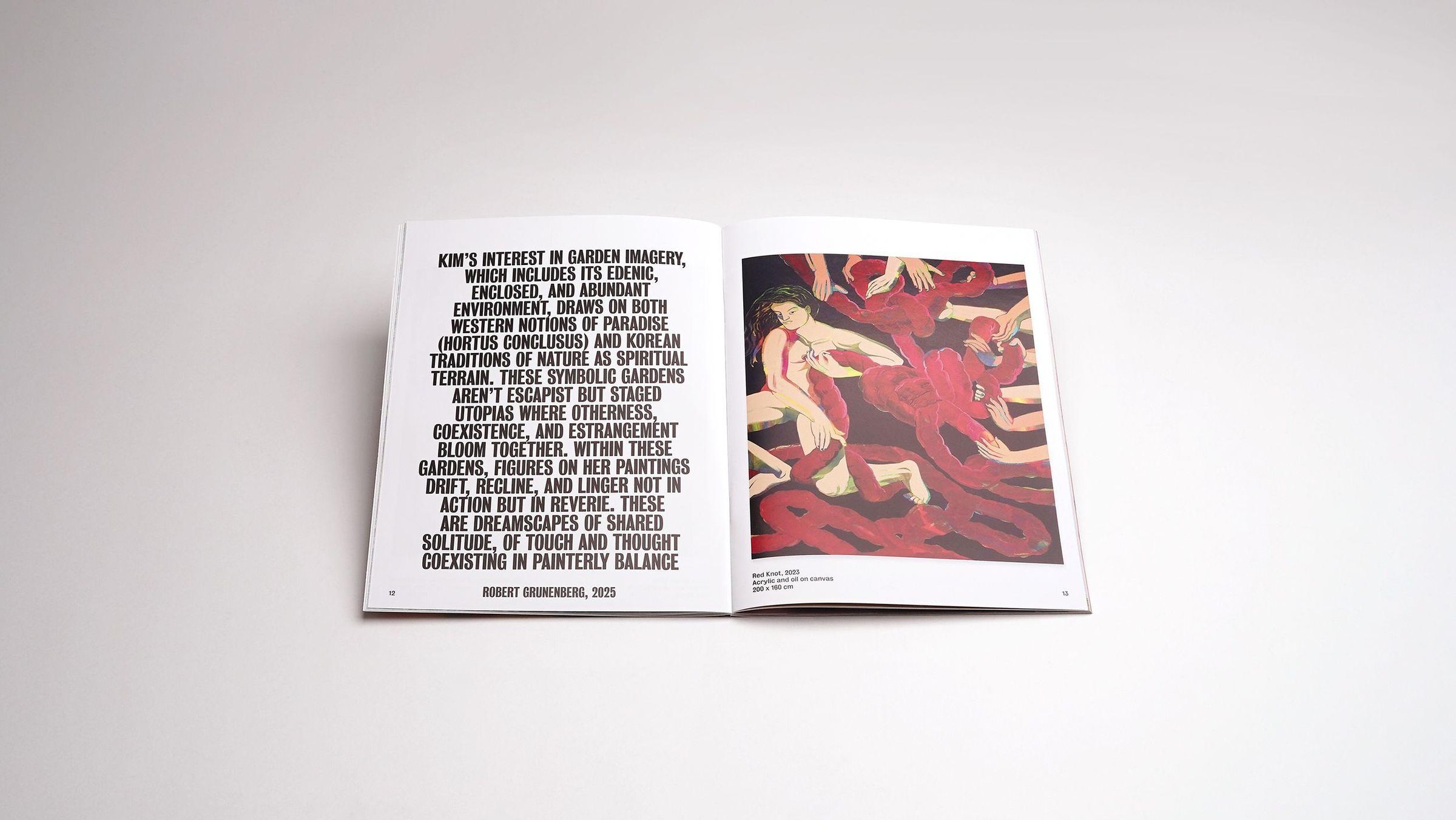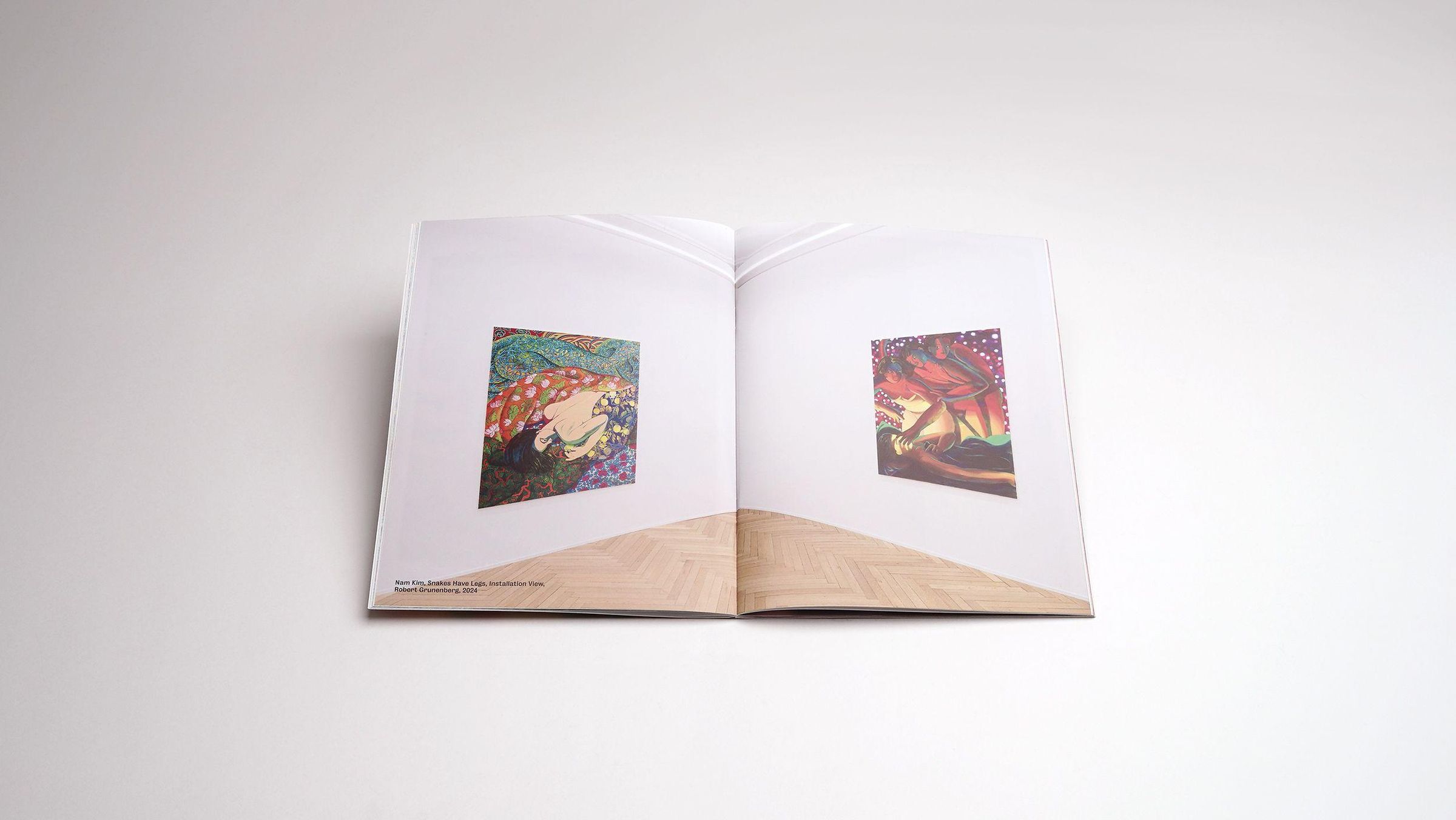 The large-format paintings of Nam Kim (born 1991 in the US, lives in Vienna) are inhabited by chunky androgynous, naked figures, which gently blend with the vegetation, light and shadows, or ornaments around them. "The figures resonate with fluid grace, caught in the intimate moment between thought and touch." (R. Grunenberg) Here, the human body is equal to its natural environs and not separate. Kim begins her paintings with zones of gestural abstraction, from which the characters grow like plants into her compositions. Kim grew up in Korea and her painting practice combines elements of Asian traditions (in art and theater) with Western art history and virtuality. This book presents her works of the last three years and includes an insightful essay by Robert Grunenberg.