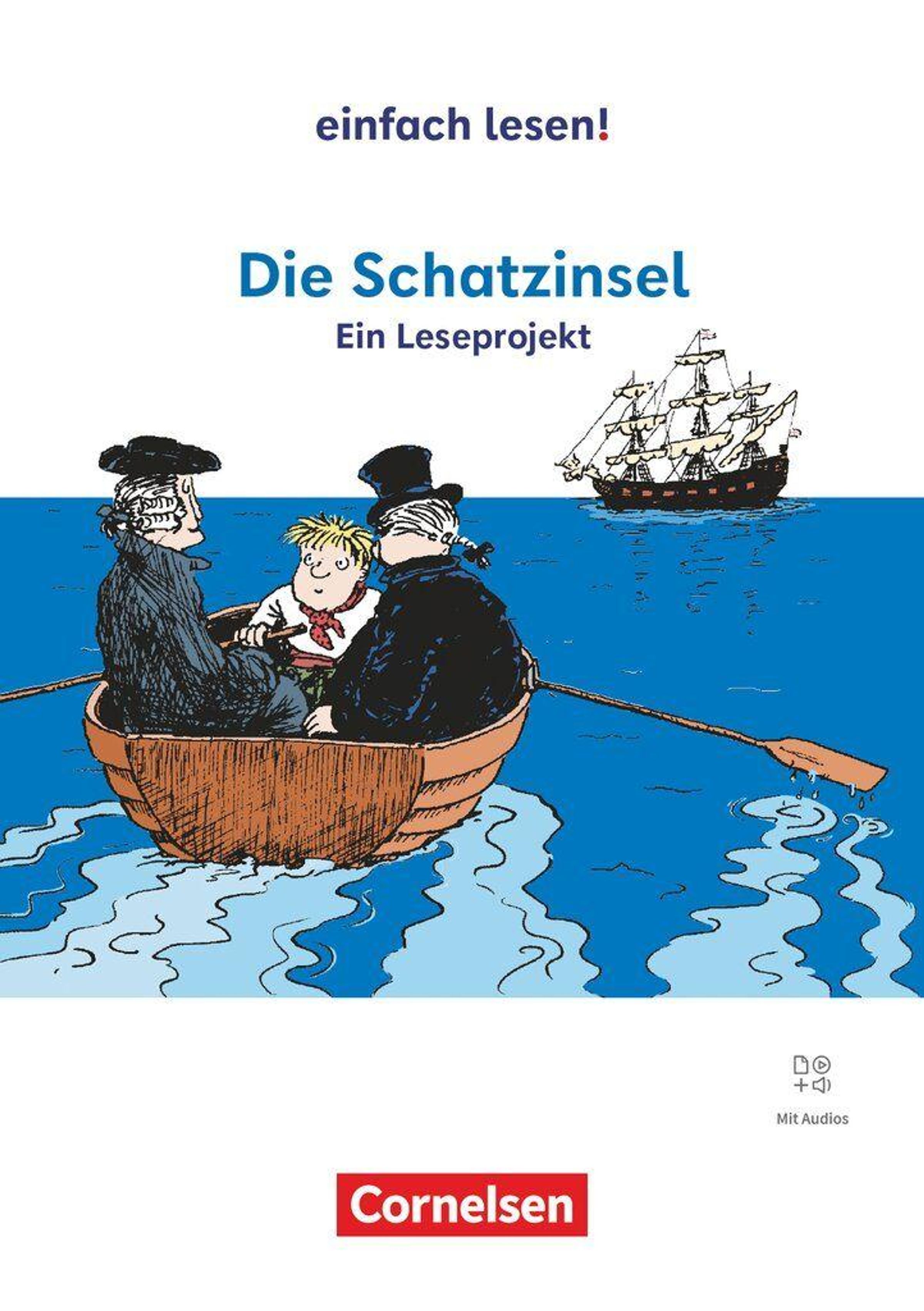"einfach lesen! Die Schatzinsel Ein Leseprojekt. Illustration: Drei Personen im Ruderboot, Segelschiff im Hintergrund. Cornelsen.", Buch