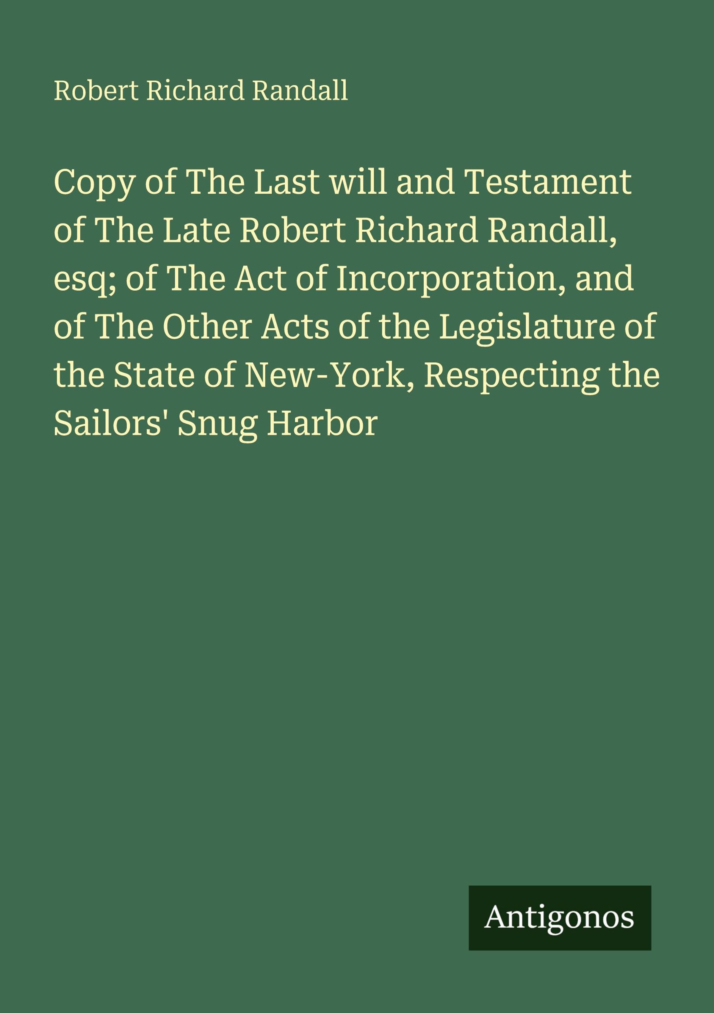 Copy of The Last will and Testament of The Late Robert Richard Randall, esq; of The Act of Incorporation, and of The Other Acts of the Legislature of the State of New-York, Respecting the Sailors' Snug Harbor