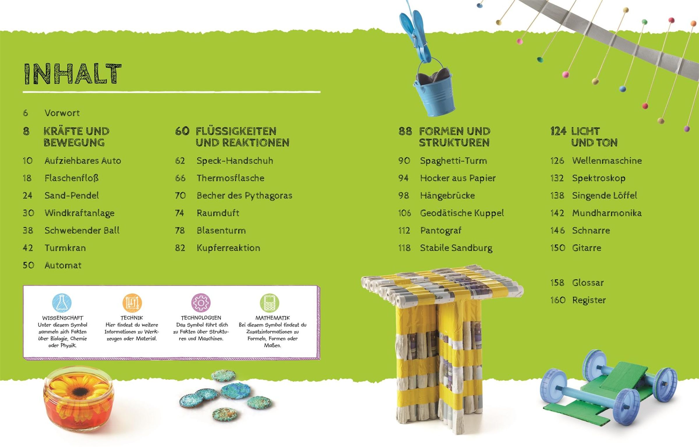 Coole Experimente für Kinder. So macht Forschen Spaß! 25 geniale Experimente wecken den Forschergeist der Kinder. In anschaulichen Schritt-für-Schritt-Anleitungen und mit einfachen Materialien entstehen Windmühle, Thermoskanne und Hängebrücke. Spielerisch lernen junge Forscher ab 10 Jahren die Grundlagen der Naturwissenschaft und Technik kennen. Das macht nicht nur stolz, sondern auch fit für die MINT-Fächer ! Dazu gibt es spannendes Hintergrundwissen und praktische Anwendungsbeispiele .