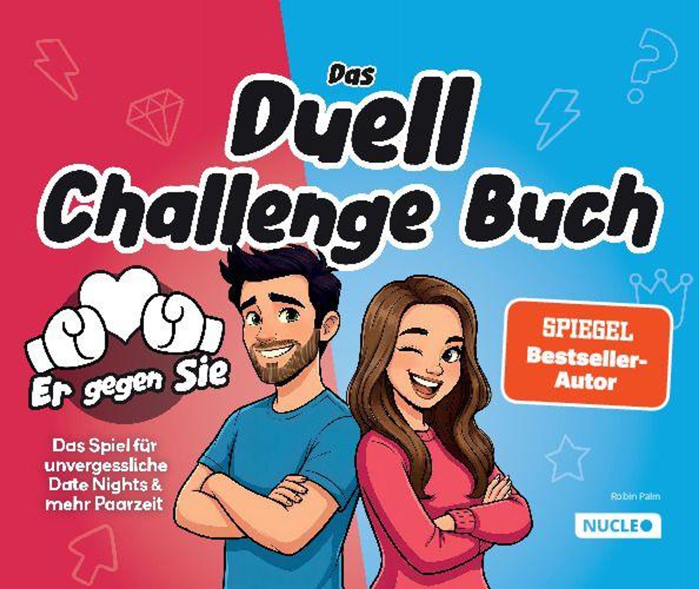 „Das Duell Challenge Buch: Er gegen Sie. Das Spiel für unvergessliche Date Nights & mehr Paarzeit.“ Illustration: Mann und Frau., Buch