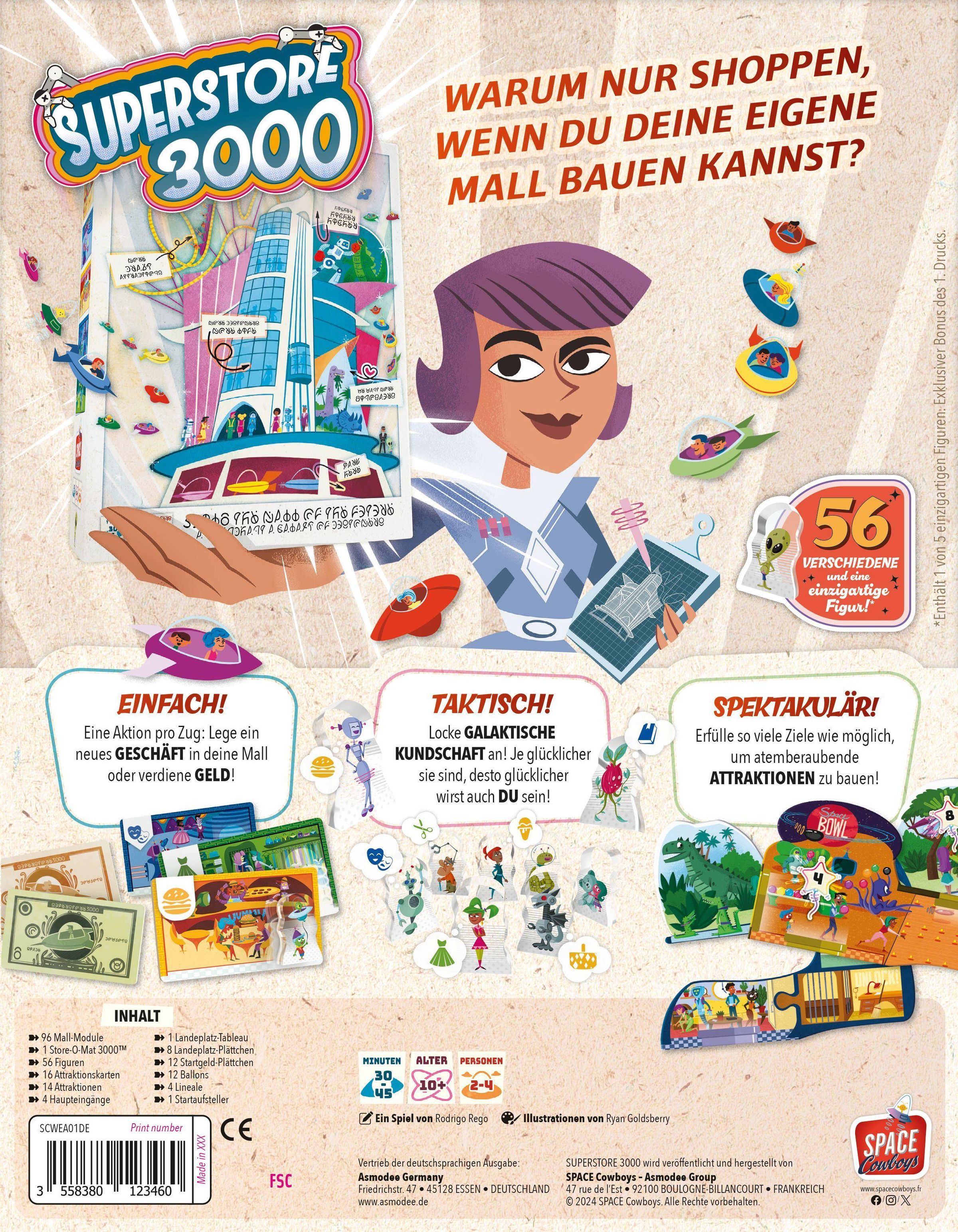 In dem Familienspiel Superstore 3000 seid ihr aufstrebende Ingenieurinnen und Ingenieure und wollt die außergewöhnlichste Mall aller Zeiten bauen. Ihr müsst die richtige Kombination von Geschäften und Attraktionen finden, um die neugierige Kundschaft zufriedenzustellen, die eure Konstrukte besucht. Legt neue Geschäfte in eure Mall, um galaktische Kundschaft anzulocken. Erfüllt so viele Ziele wie möglich, um atemberaubende Attraktionen zu bauen. Am Ende wird nur die innovativste Mall im Geschäft bleiben! Wird es deine sein? Oder wirst du vom Kaufrausch der Leute überrannt?