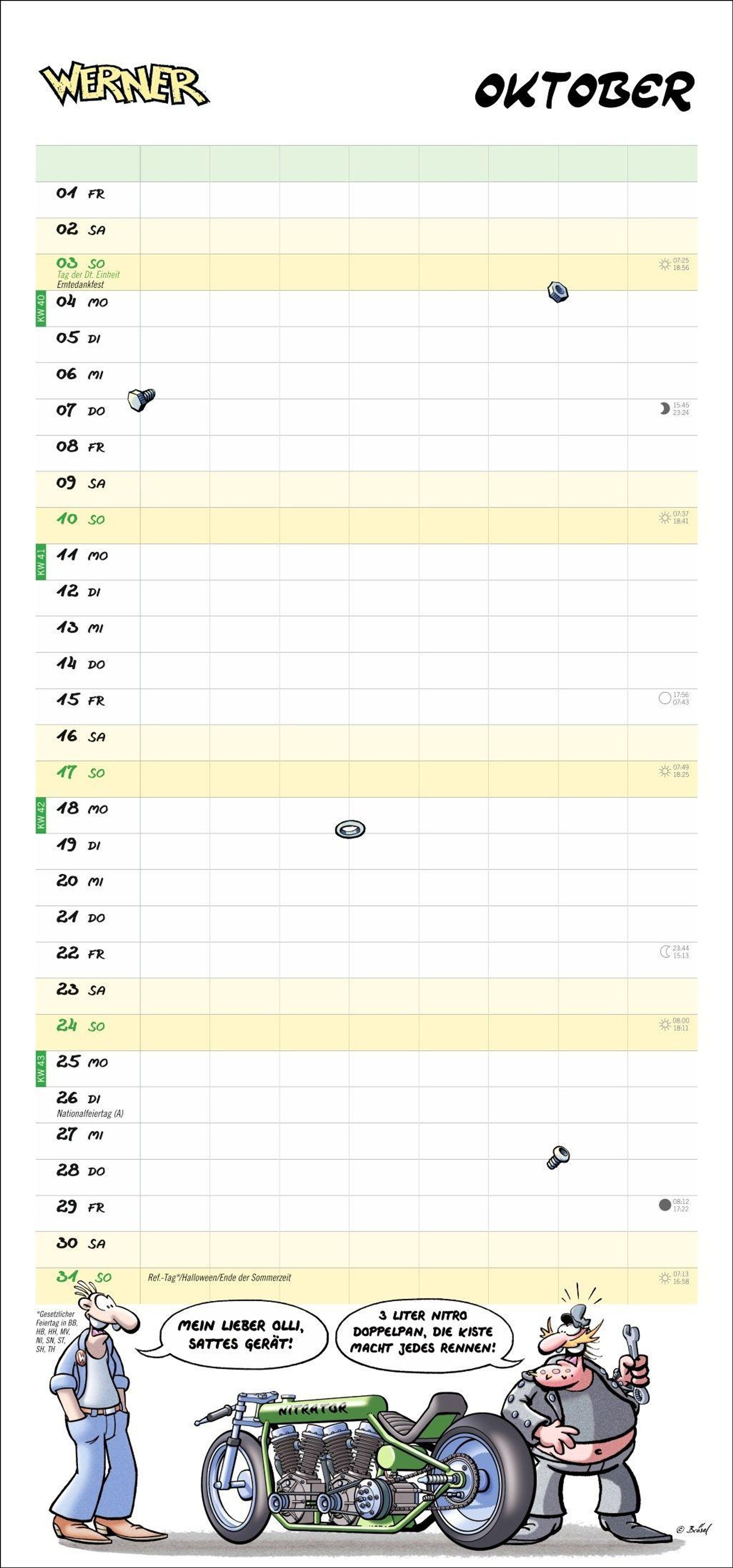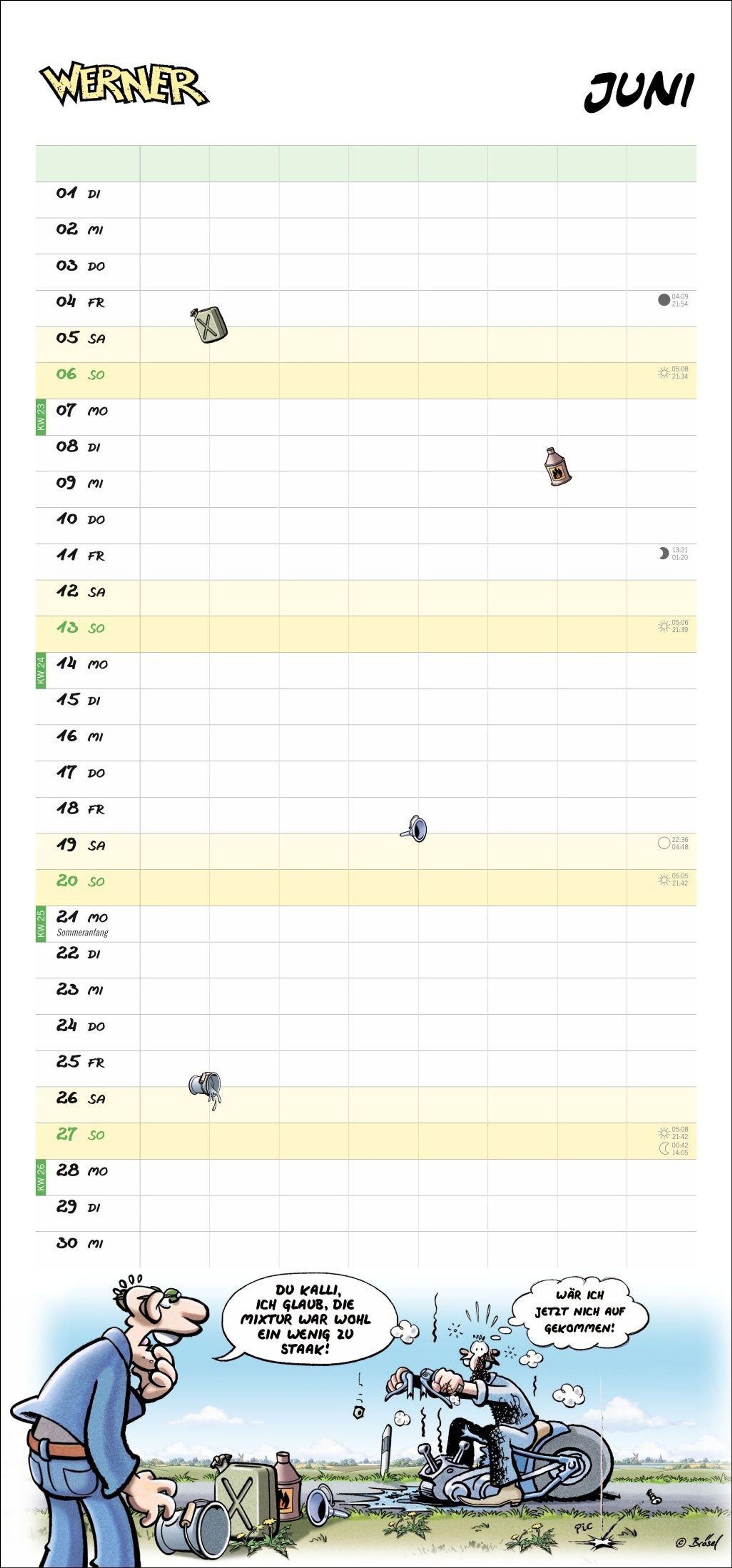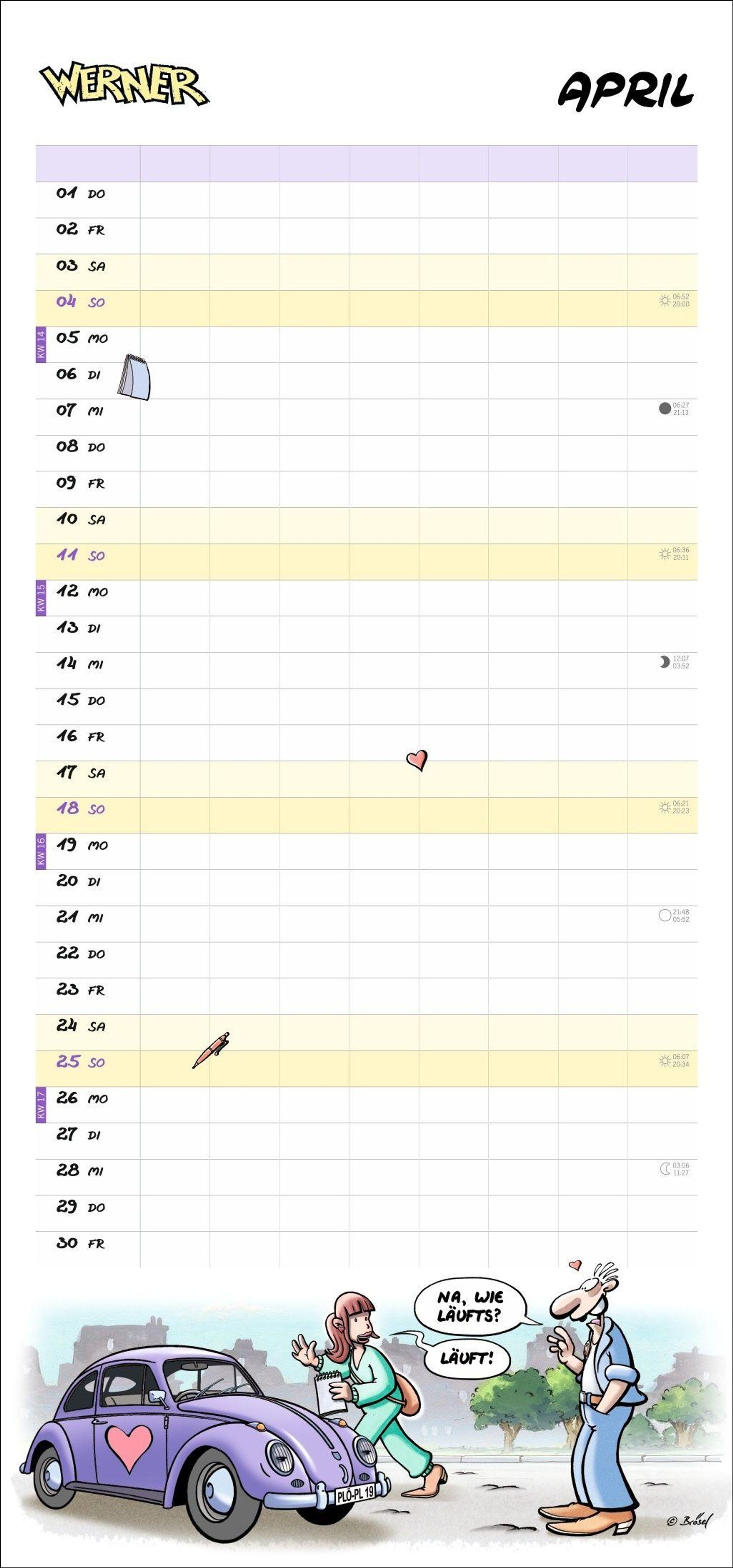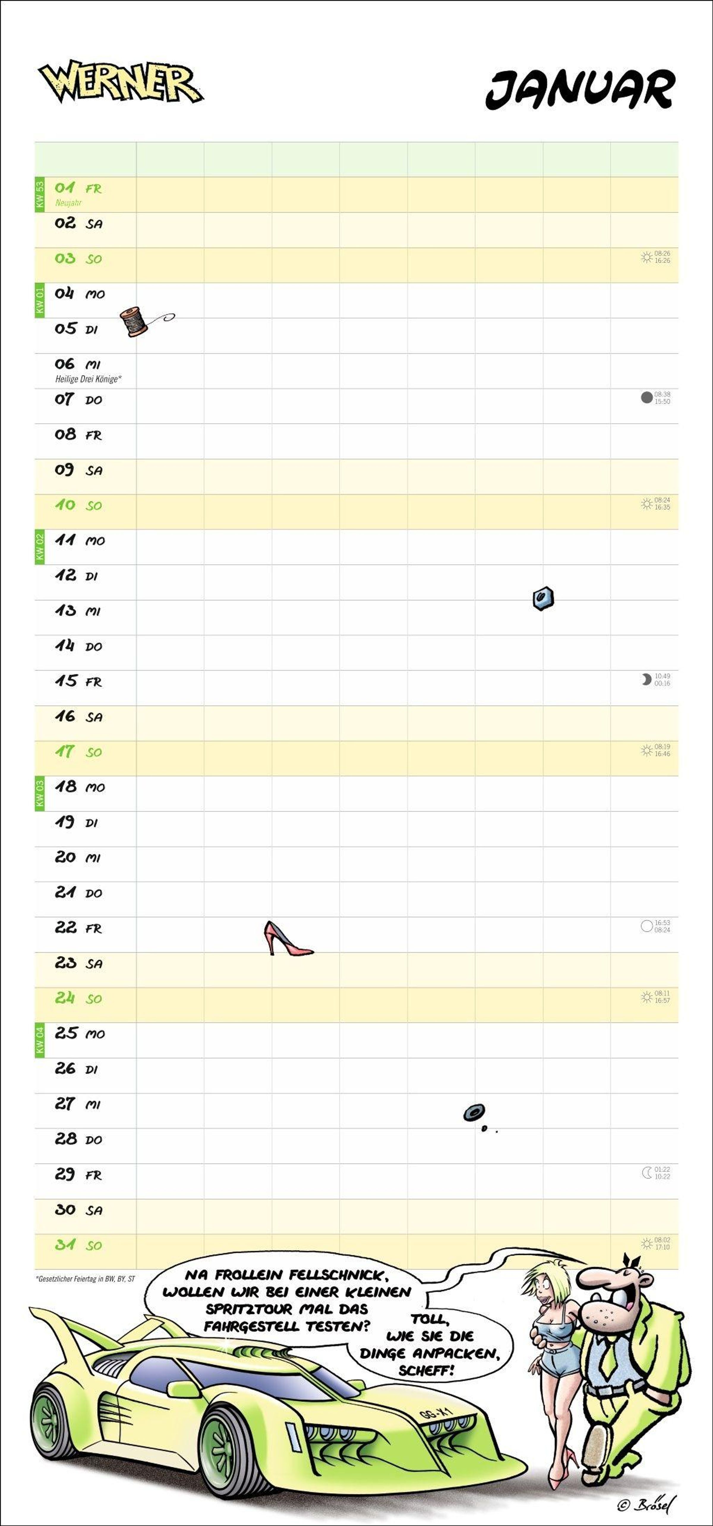 - Praktischer Wandkalender mit frei einteilbaren Spalten. Humorvoller Terminkalender mit kultigen Werner-Cartoons.