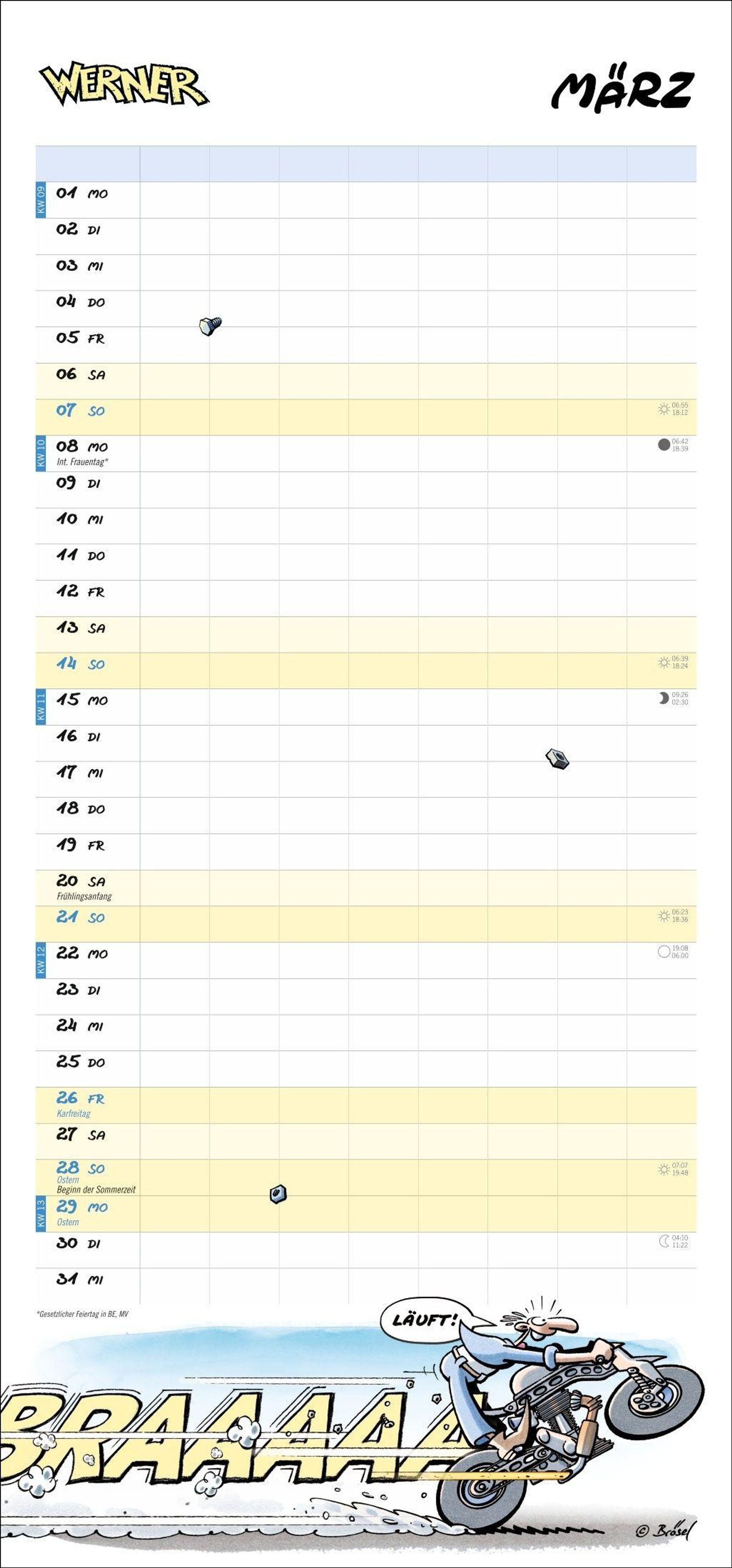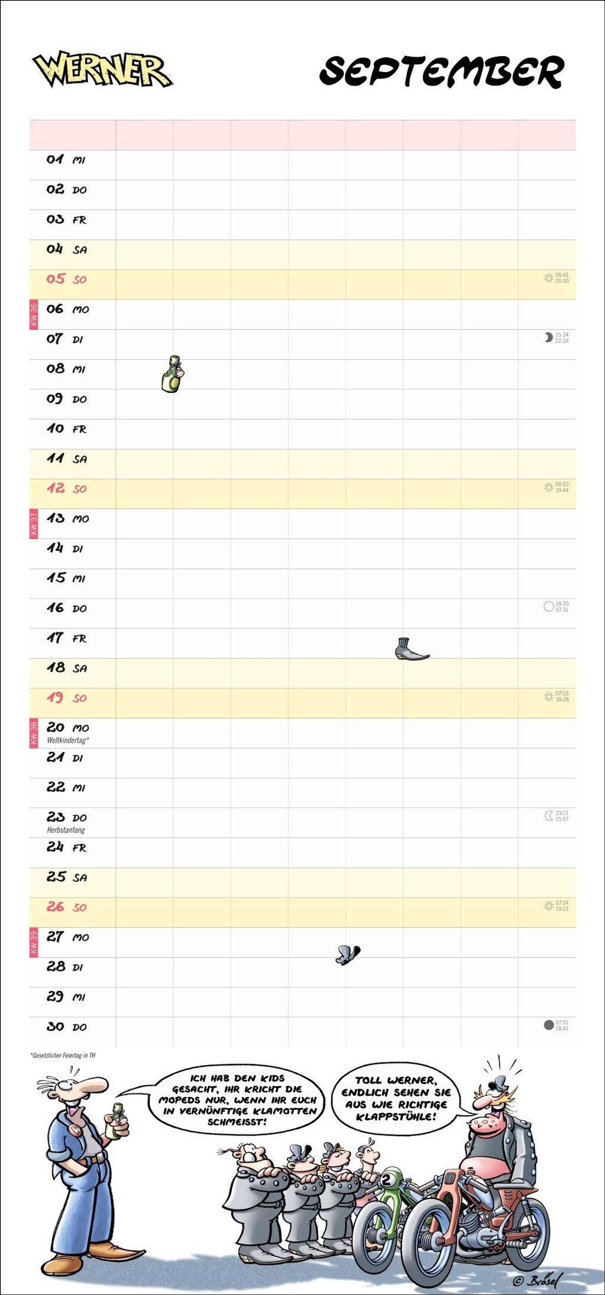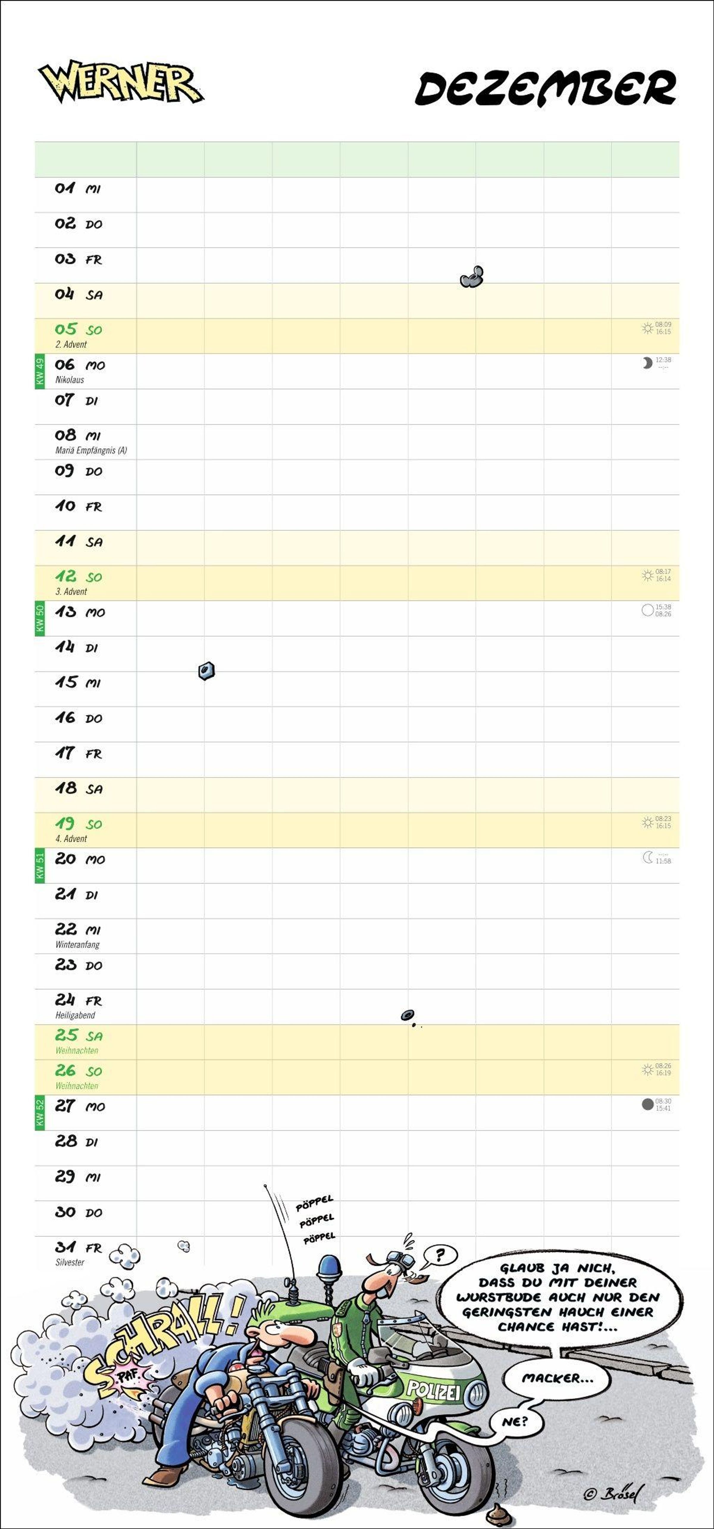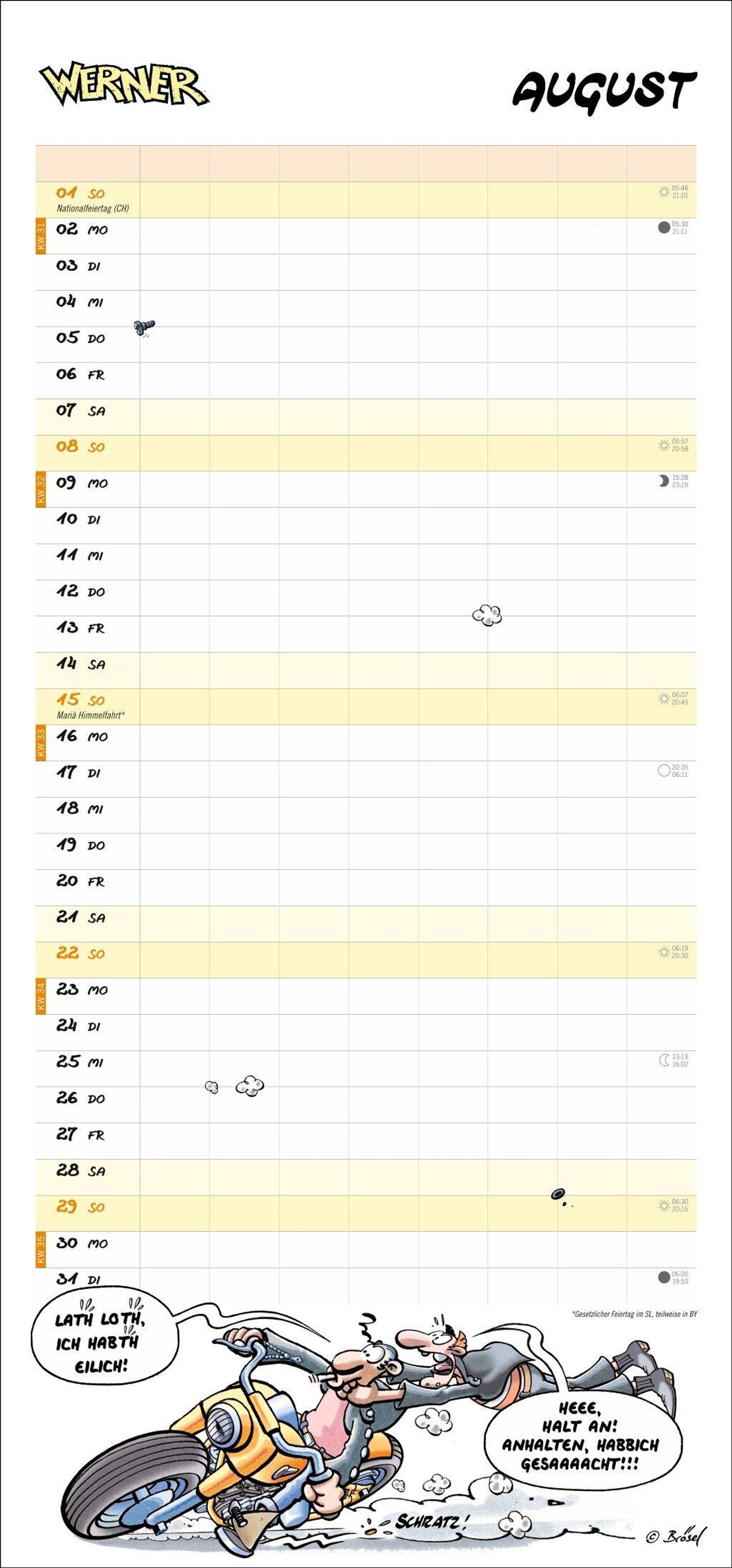 - Praktischer Wandkalender mit frei einteilbaren Spalten. Humorvoller Terminkalender mit kultigen Werner-Cartoons.