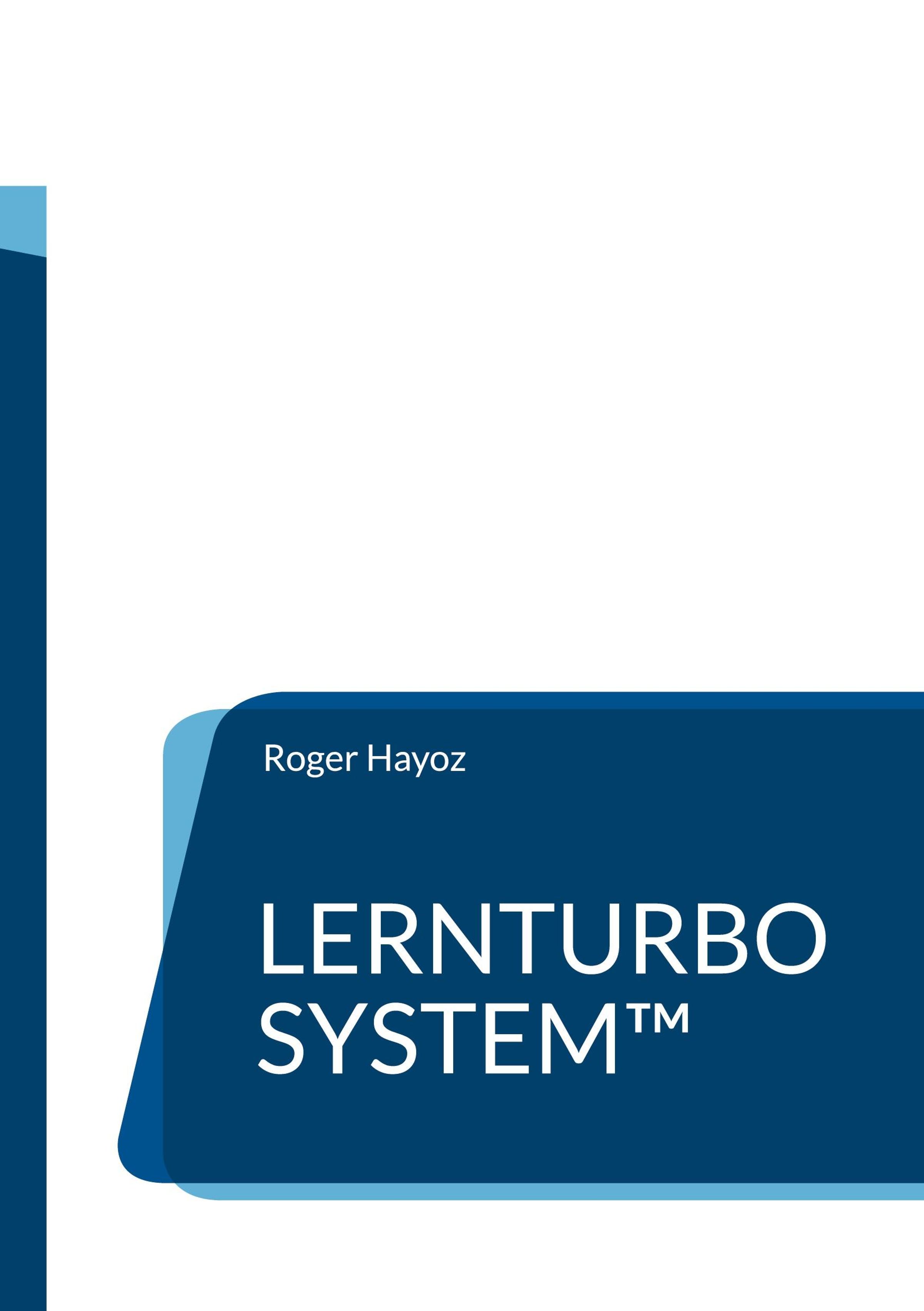 „Roger Hayoz LERNTURBO SYSTEM™“; minimalistisch, blaue Farbblöcke auf weißem Hintergrund., Buch