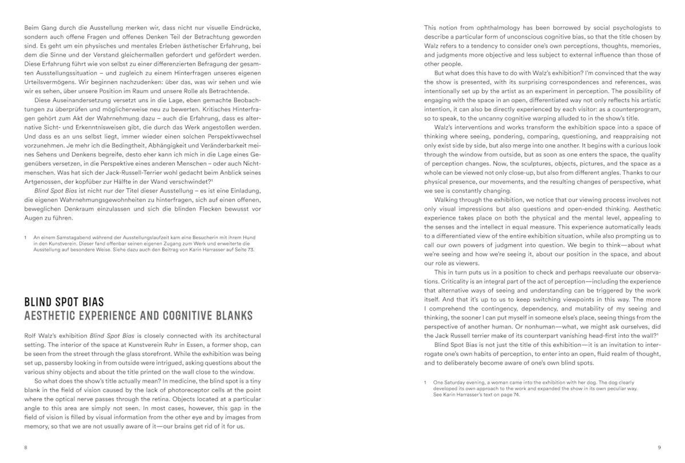 Fotografische Arbeiten, Objekte und ortsspezifische Interventionen thematisieren den Blind Spot Bias - scheinbar Vertrautes verwandelt sich durch kognitive Verzerrung und Wahrnehmungsverschiebung in etwas Anderes. Texte von Peter Friese, Hanne Loreck und Karin Harrasser erschließen die Arbeiten aus unterschiedlichen Perspektiven.