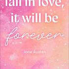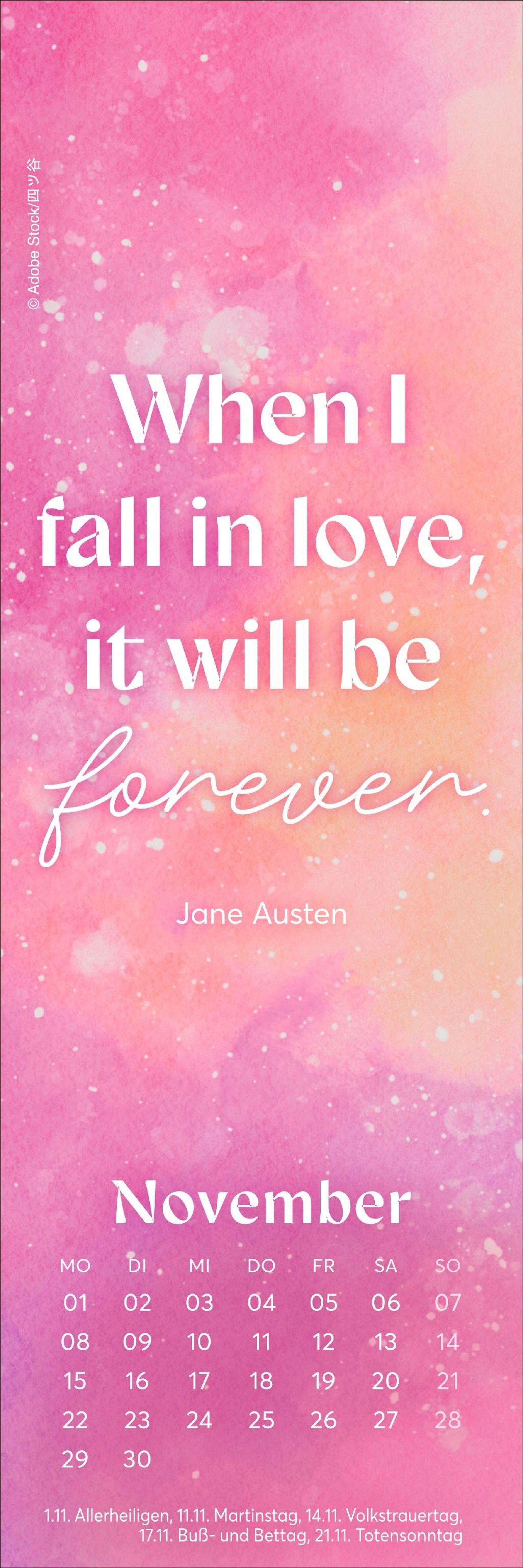 "I love Romance" und "When I fall in love, it will be forever." Zitat von Jane Austen. Rosa Hintergrund mit zwei Herzen., Kalender