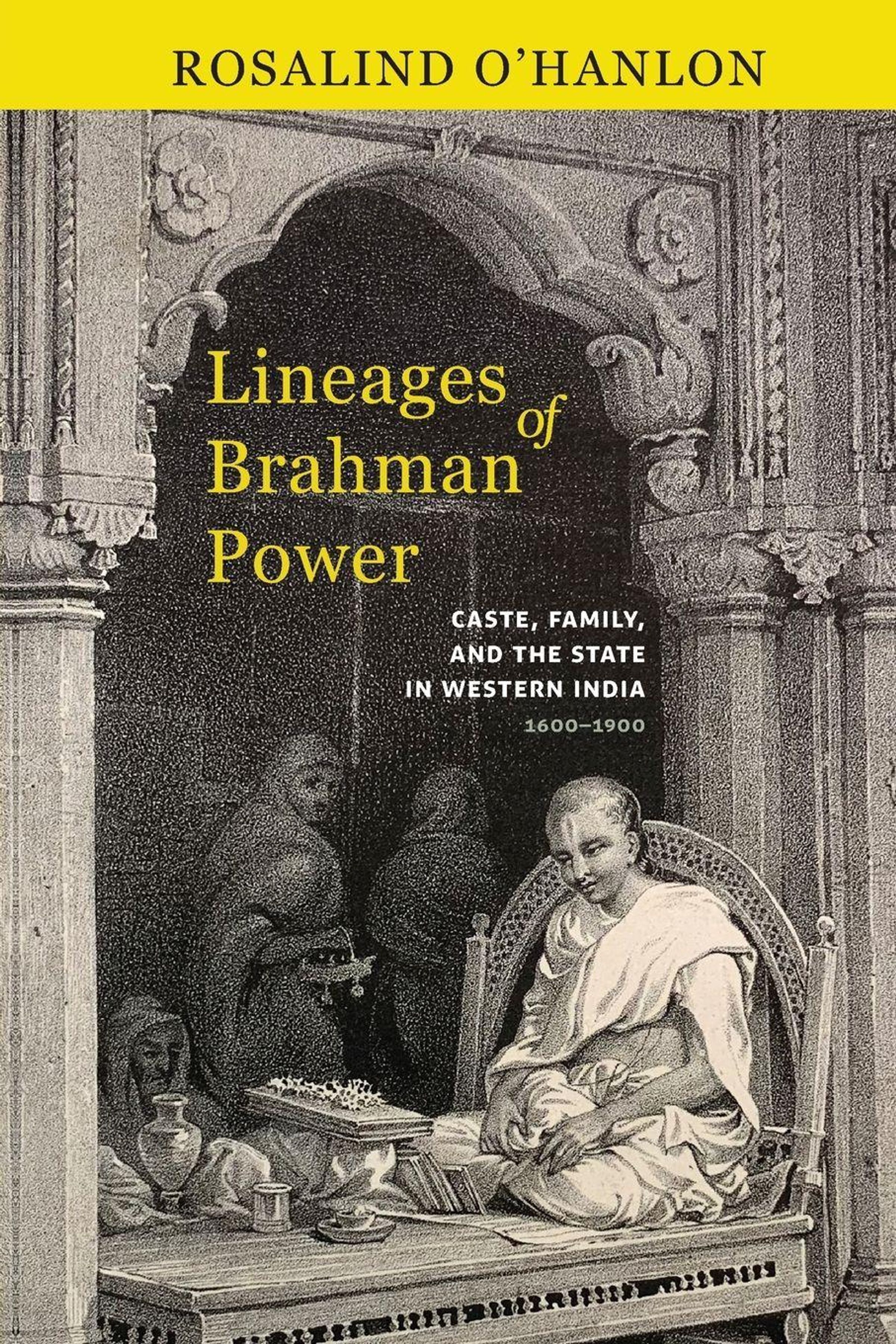 Titel: "Lineages of Brahman Power". Autor: Rosalind O’Hanlon. Illustration von sitzenden Figuren in einem dekorativen Raum., Buch